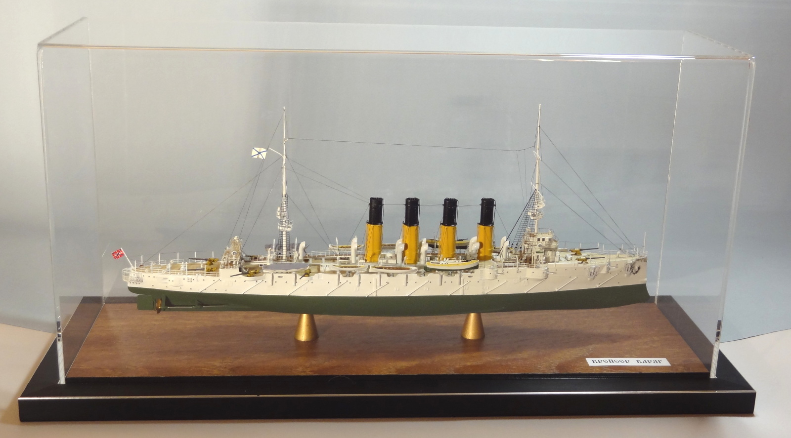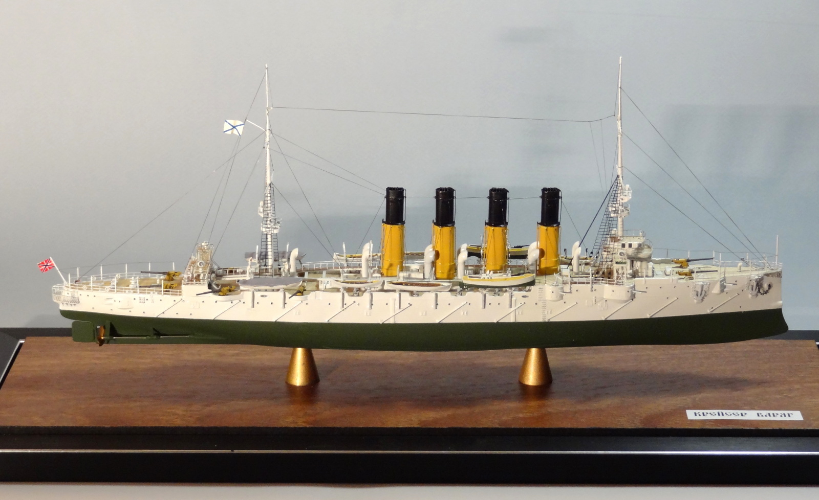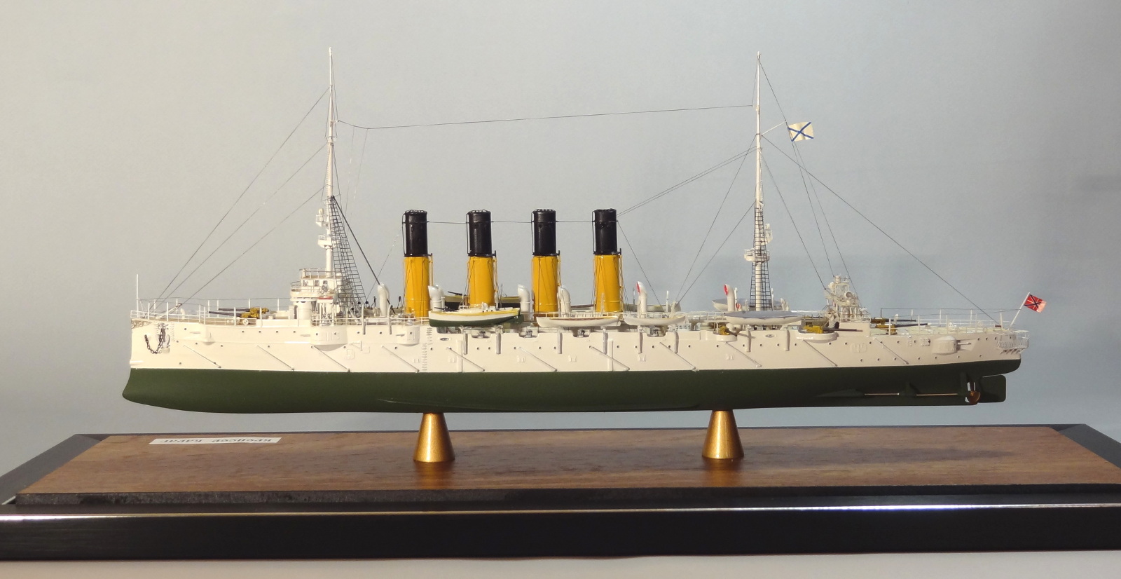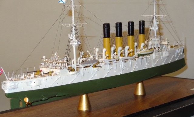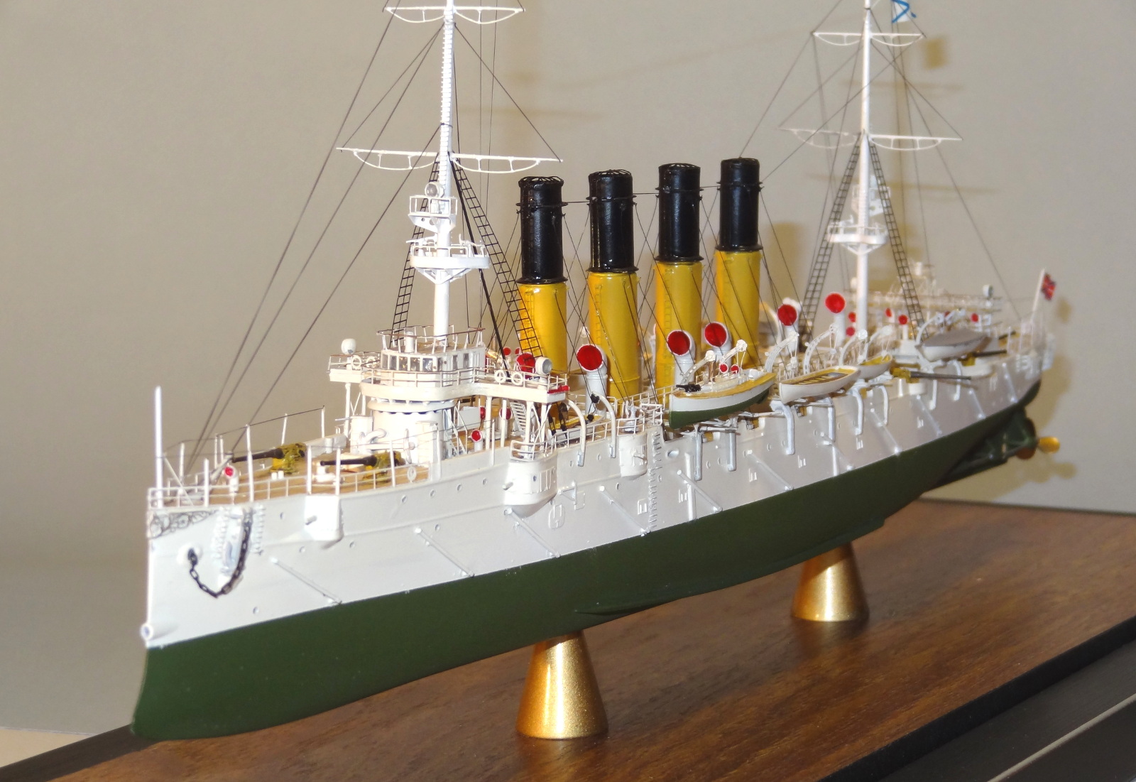 По матчасти есть пара вопросов, типа цвета казематных орудий, дефлекторов и внутренности лодок. Дефлекторы на всех фото прототипа четко в цвет нижней половины труб. Гюйс перевесить бы на положенное место. Футропы покрасить в цвет остального такелажа. Но качества исполнения это нисколько не отменяет.