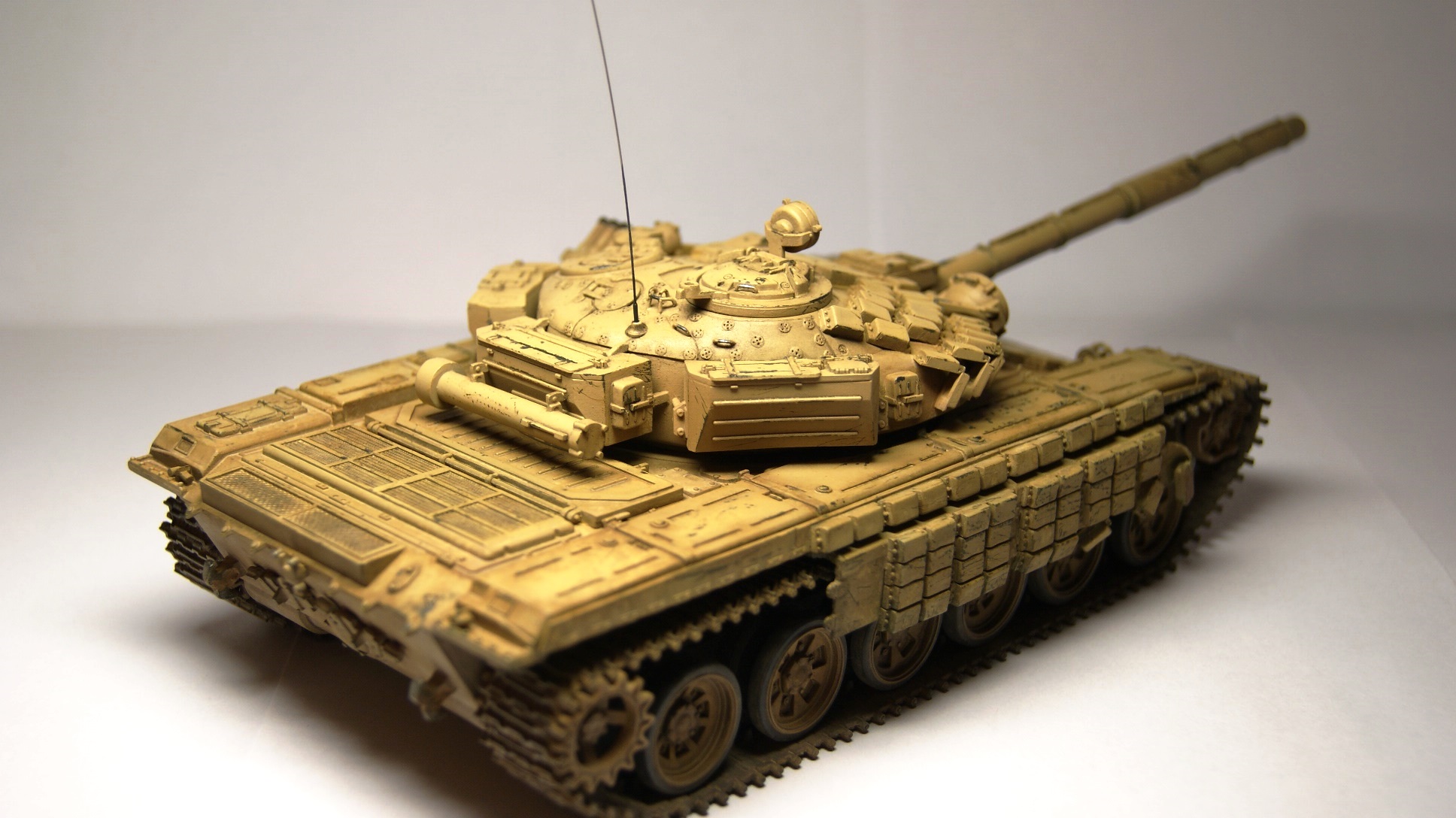 В процессе работы сделал покрытие башни с держателями на её верхней задней части, ручки, щитки оптики, антенну, убрал лишний пластик с деталей. Также был переработан комплект навесной брони Т-72 Б, лишних деталей практически не осталось.