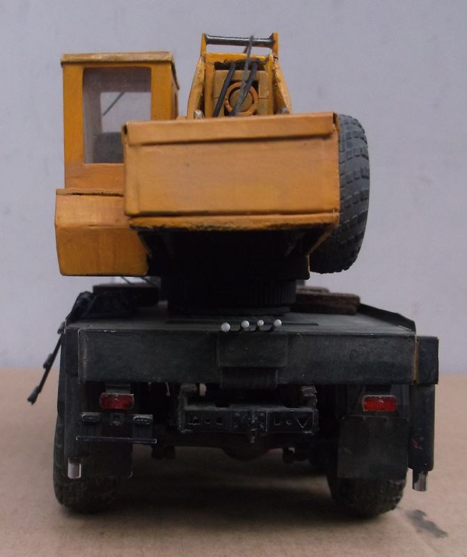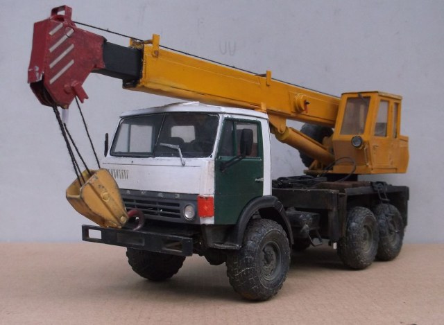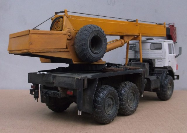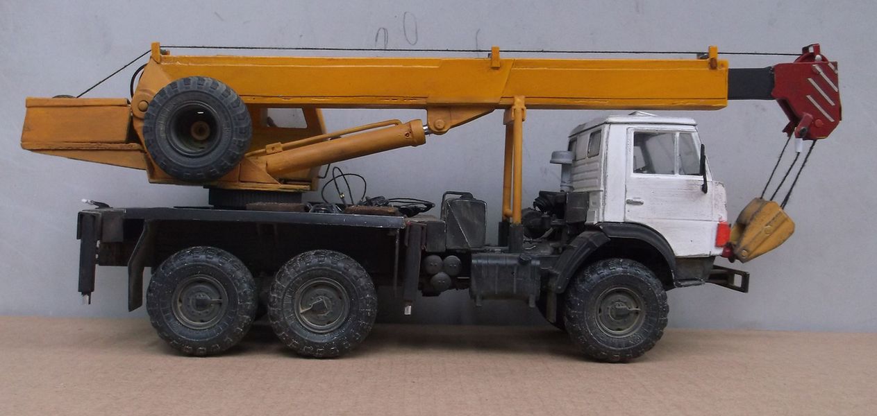 Всем добра! Вот и закончил, вроде бы, КАМАЗюку-кранюку. Сразу предупреждаю: Образ крановой установки собирательный! Хотя видно, что ноги растут из Ивановца. Первоначально планировалось собрать кабину со спальником. Но от долгого лежания крыша (АРМОР 35) пошла винтом. После купания в кипятке крыша выправилась, но просела вниз по центру. После повторного купания всё повторилось. Пришлось собирать "дневную" кабину. Для антуража "разбил" и "заржавил" правую фару. Не знаю, получилось-нет. Родная "резина" мне показалась мелковатой и я воткнул "лапти" от роденовского КрАЗа. Крановая установка и паучок полностью самодел производства Александра (Дорик). Я только немного её модернизировал. Заменил поворотные аутригеры на выдвижные. Добавил к родным пяткам деревянные подпятники.