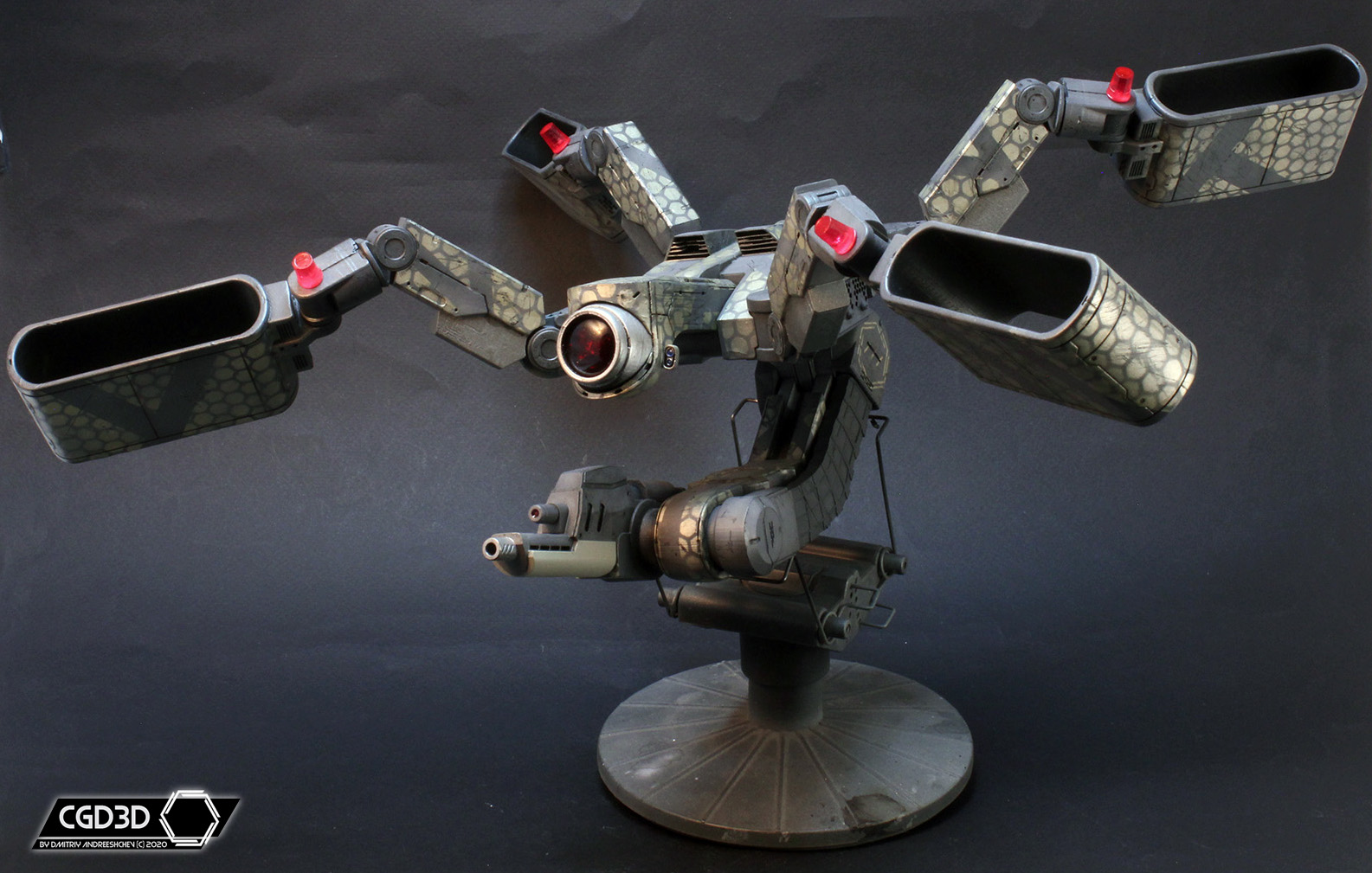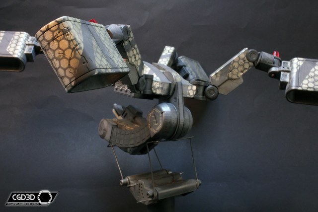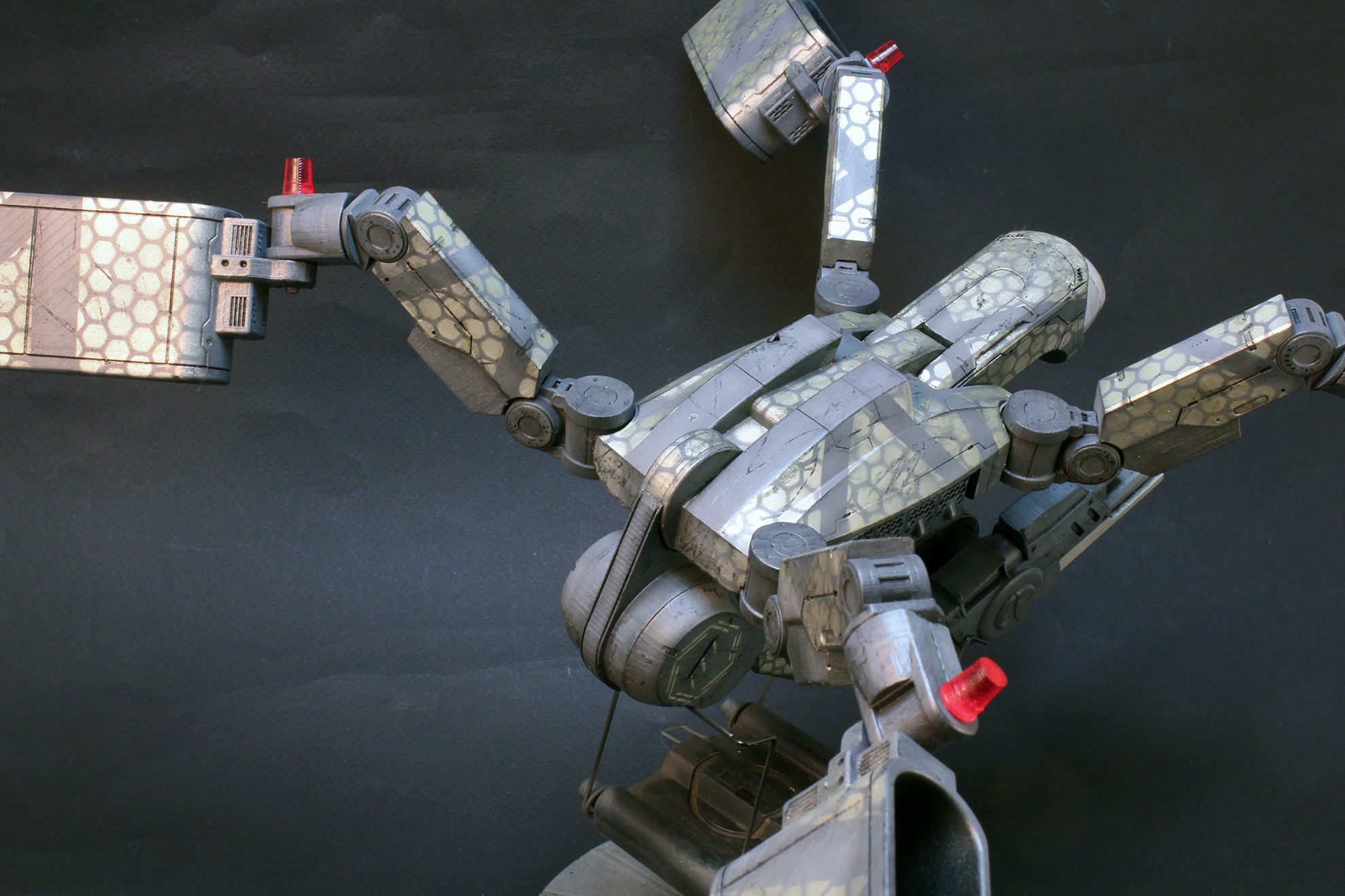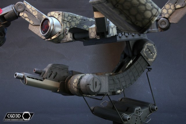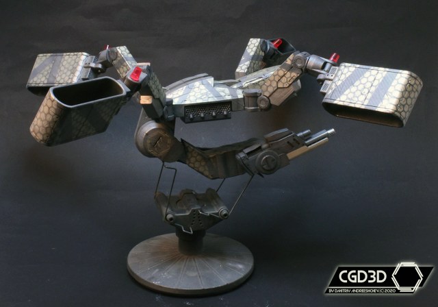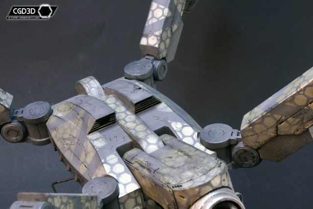После подгонки всех деталей, я покрасил модель, придумав свою собственную схему окраски. Мне не хотелось делать скучный полицейский дрон, вместо этого я решил сделать изрядно потрепанную машину, оформленную в стиле банды шанхайских Сборщиков (из Deus Ex Human Revolution), о чем красноречиво говорят узоры из золотистых шестиугольников.