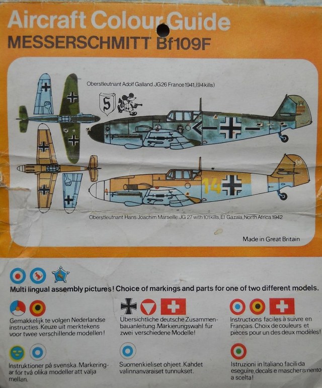 "Настоящий конкурент “фроговской” модели появился в 1972 году — это была модель от фирмы “Heller”. Первое издание имела “общее” коробочное название “Messerschmitt Bf.109”, но уже в 1974 году его конкретизировали до “Messerschmitt Bf.109-F”. До 1980 года, модель сохранила индекс L081, а после смены дизайна коробок он был изменен сначала на 232, а затем на 80232. Затем фирма “Heller” стала уделять больше внимание модификациям, перечисленным в начале статьи.