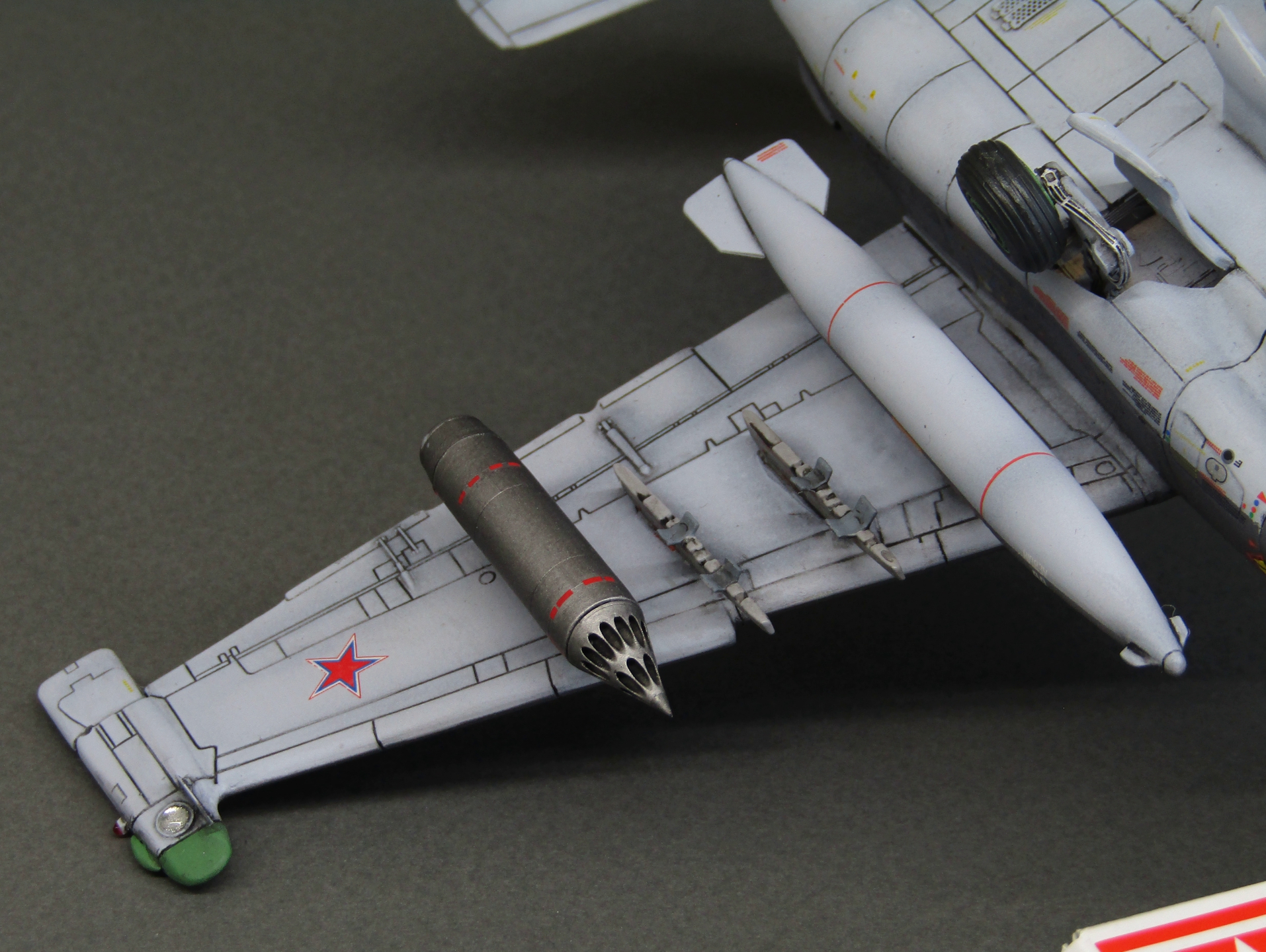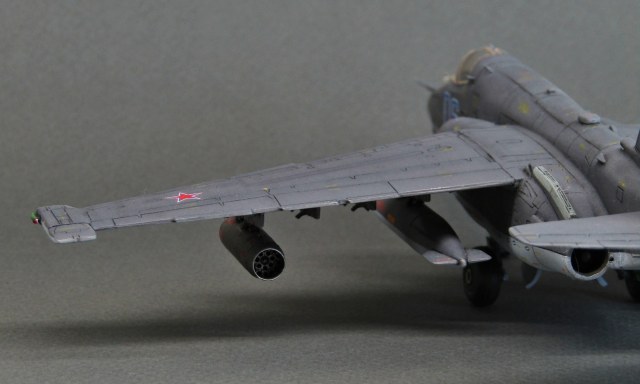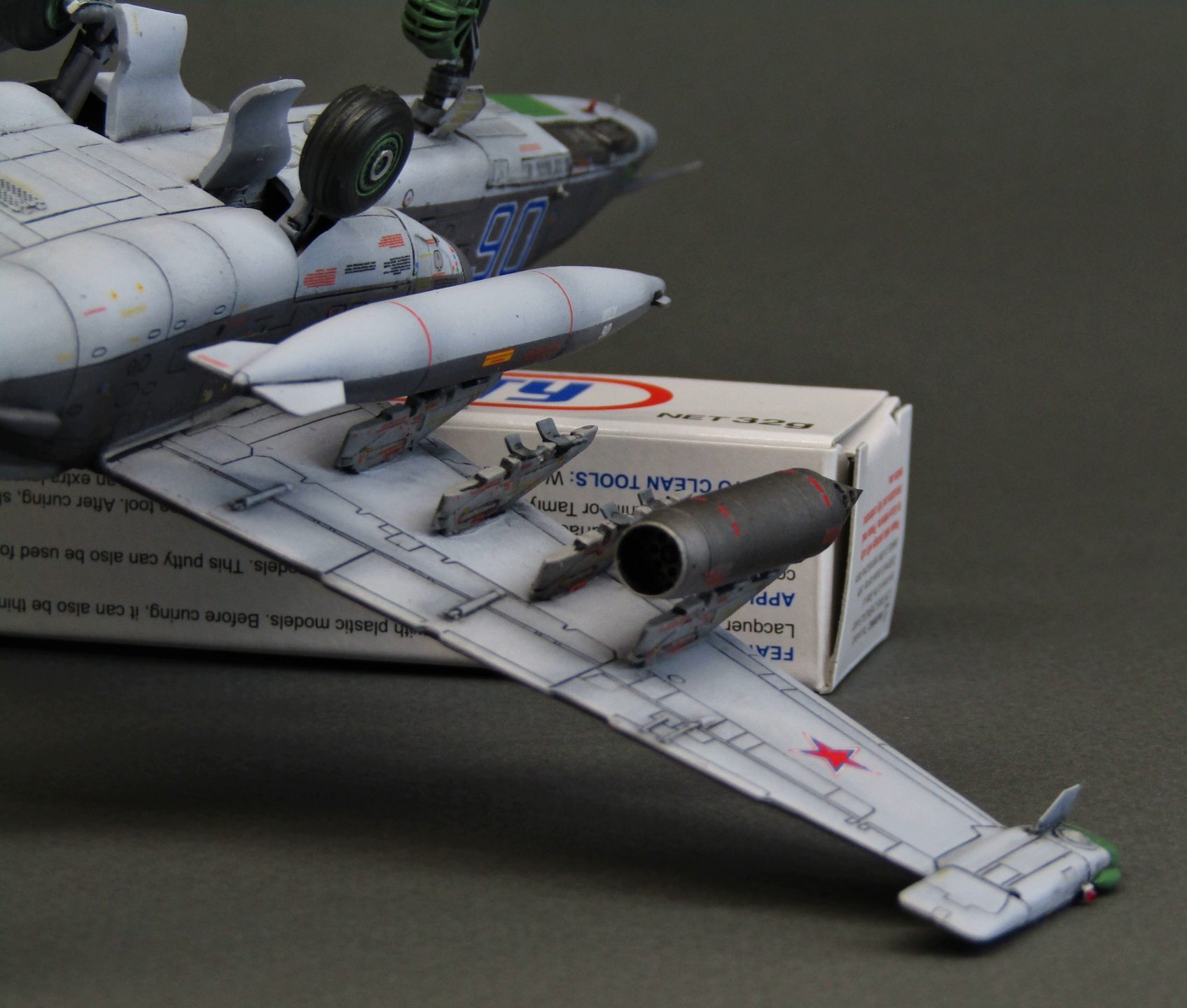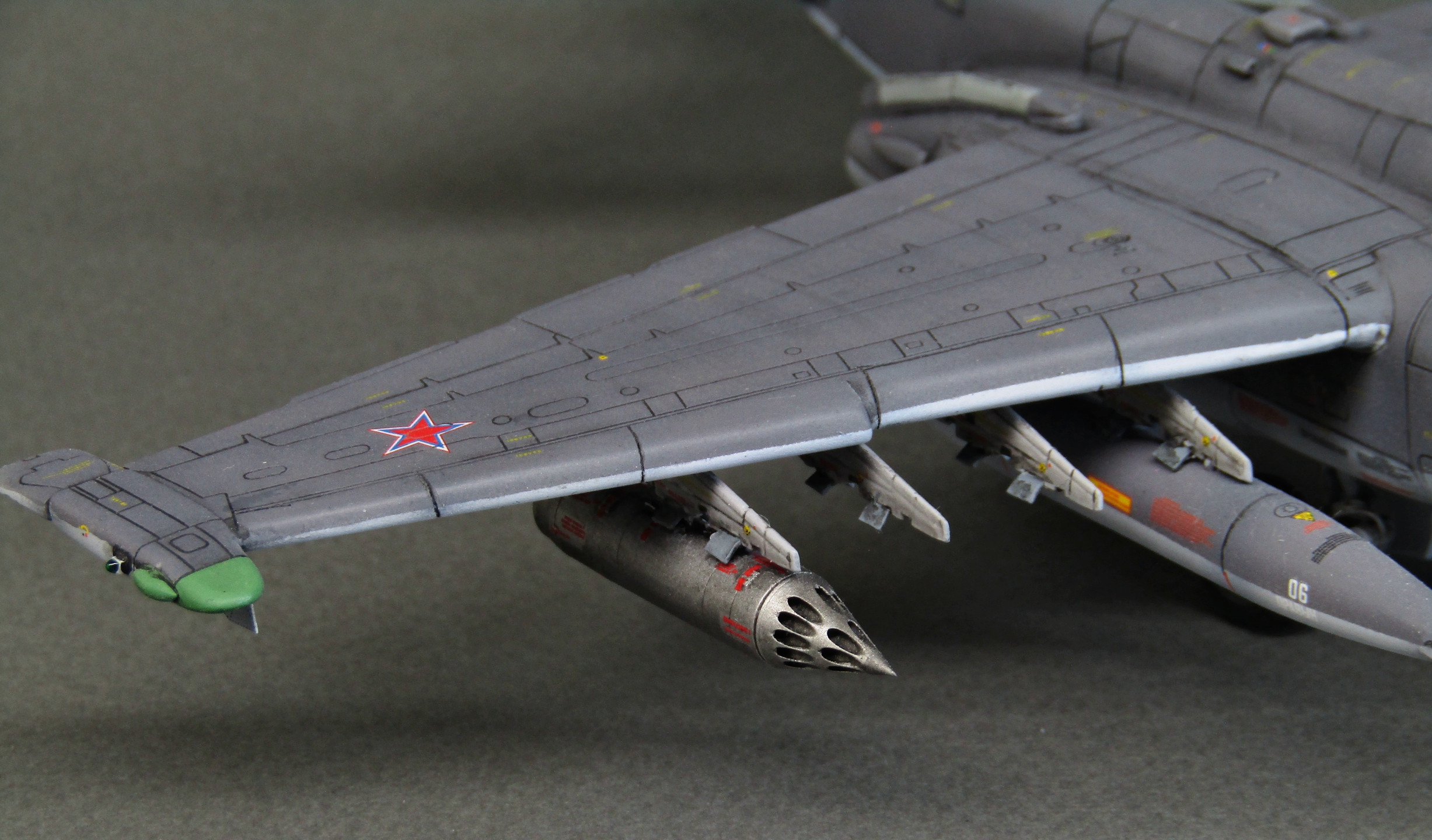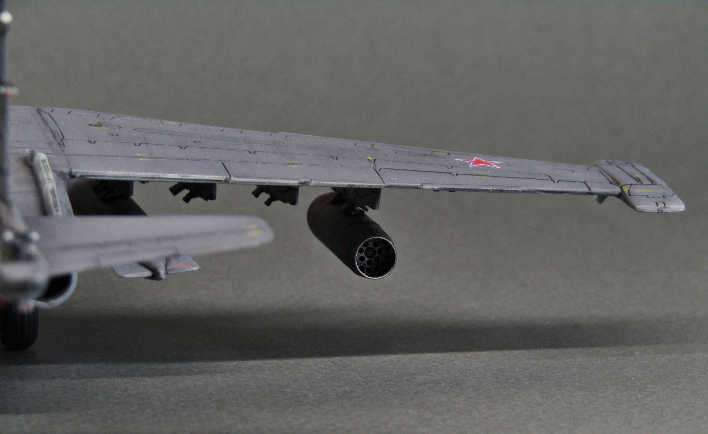 Зачетный перепил из таких дров как "Звезда"! По матчасти пара замечаний. Воздухозаборники по бокам хвостовых коков мотогондол лишние, нижний цвет не светло-серый (он на более поздних бортах пошел), а светлый серо-голубой, каналы воздухозаборников (~ на 1 м от входа) красят в нижний цвет. Ну и коль уж такой перепил пошел, надо было тогда и в/з обдува двигательных отсеков сымитировать (от них дальше идут балки с доп. кассетами АСО-2ВМ). Хвостовая балка не совсем удачно переделана, ну и расшивка а-ля "тетрадный лист в клеточку" режет глаз.
