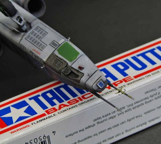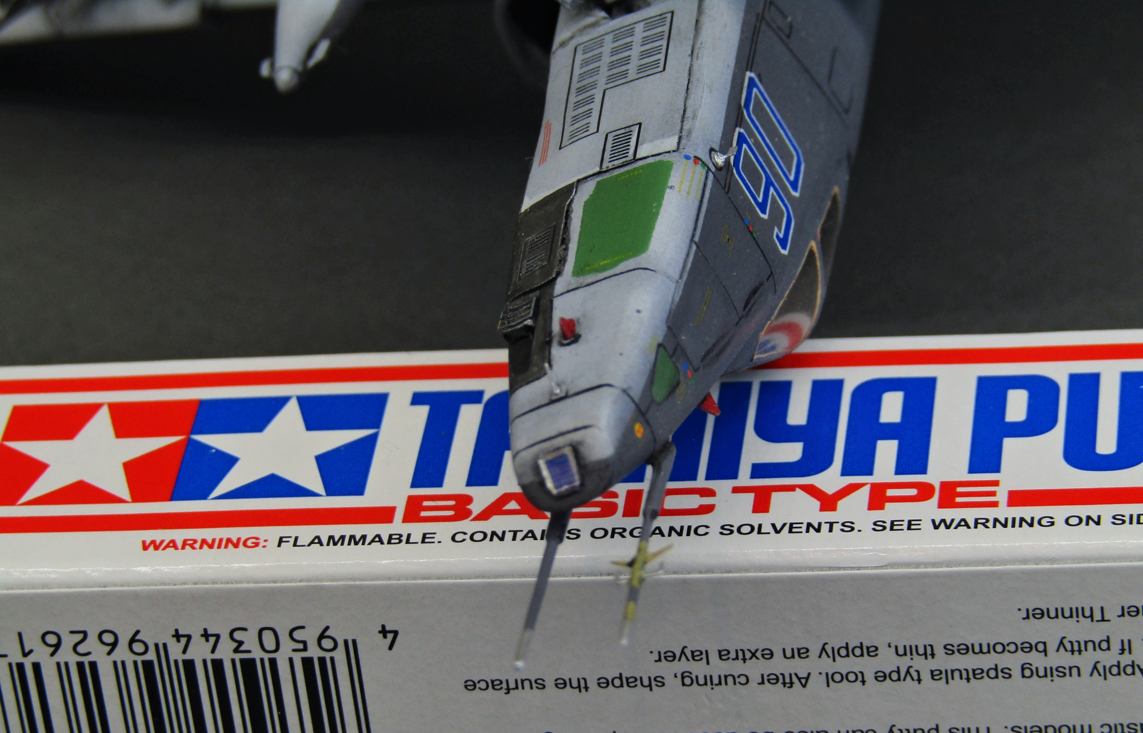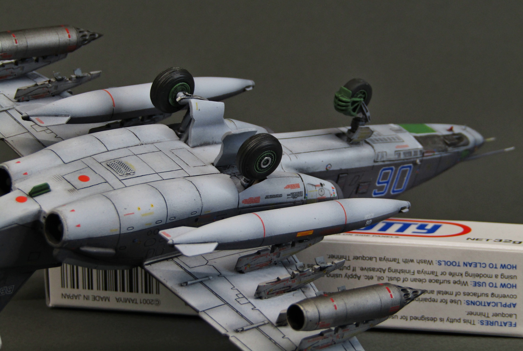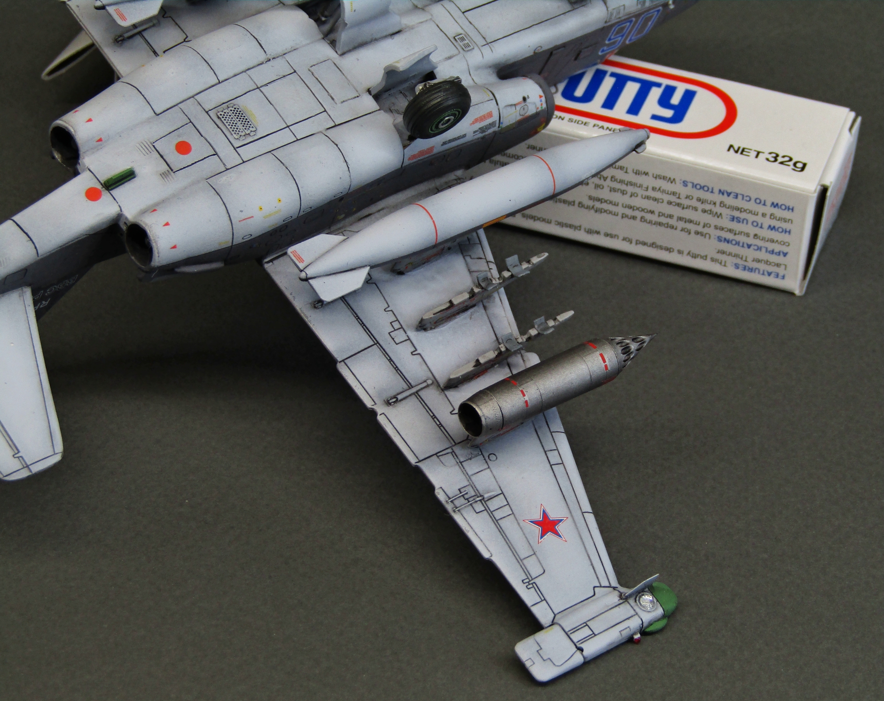 Зачетный перепил из таких дров как "Звезда"! По матчасти пара замечаний. Воздухозаборники по бокам хвостовых коков мотогондол лишние, нижний цвет не светло-серый (он на более поздних бортах пошел), а светлый серо-голубой, каналы воздухозаборников (~ на 1 м от входа) красят в нижний цвет. Ну и коль уж такой перепил пошел, надо было тогда и в/з обдува двигательных отсеков сымитировать (от них дальше идут балки с доп. кассетами АСО-2ВМ). Хвостовая балка не совсем удачно переделана, ну и расшивка а-ля "тетрадный лист в клеточку" режет глаз.