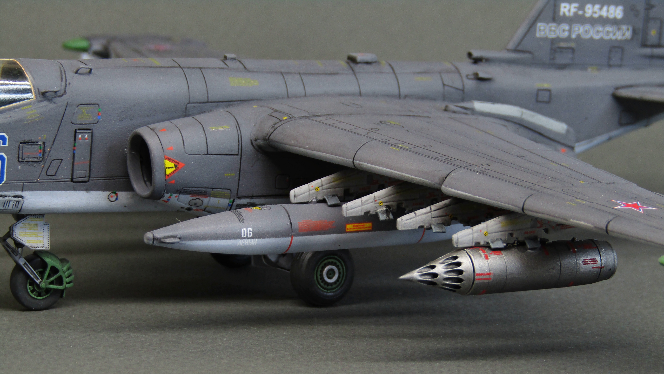 Приветствую коллеги! Представляю работу, посвящённую герою России заместителю командира эскадрильи 187 гшап гвардии майору Филипову Роману Николаевичу, который трагически погиб 3 февраля 2018 года при выполнении боевого задания близ Серакиба, Идлиб в Сирийской Арабской Республике. Работать над данной моделью начал давно, много времени собирал необходимые дополнения, да и времени не хватало. В данной работе постарался выжать как можно больше из старенькой звездовской модели. Таким образом были внесены следующие изменения: 1) заменена кабина на смоляную от Неомеги (добавил дисплей на приборную доску, которой совсем не видно); 2) использован набор травлёнки от Микродизайна; 3) ПВД заменил на булавку; 4) заменил фонарь на вакуумный от Pavla Models (родной вообще не похож на оригинал); 5) антенну системы предупреждения о радилокационном облучении, расположенную на хвосте над парашютом заменил на самодельные антенны СРТР; 6) Добавил навигационные огни, какие-то приборы на гаргроте, мелкие воздухозаборнички, расточил по два отверстия рядом с соплами; 7) заменил задние колёса на Экипаж (переднее менять не стал, т.к. оно у звезды литое с опорой); 8) заменил оперение топливных баков ПТБ-800; 9) добавил "держатели" на пилоны; 10) блоки НАР Б8М1 заменил на смоляные от Amigo models; 11) добавил фары из страз и перламутровую плёнку на прицельный комплекс; 12) использовал техничку из специально докупленного Су-25 от revell, из которого в принципе только техничку взять и можно, а остальное отдать ребёнку в качестве игрушки); 13) номера и звёзды от Бегемота. Вроде все операции с дополнениями описал, не знаю много я внёс изменений или нет, но по мне вполне достаточно. Модель грунтовал серой Ганзой 1200. Базовые цвета наносил Акановскими акрилами с першейдингом. Лакировал тамиевским лаком Lp-9. Смывал чёрной Тамиевской смывкой. Эффект выгорания краски делать не стал - побоялся испортить модель. В принципе всё, что мог описать написал. Приятного просмотра коллеги...