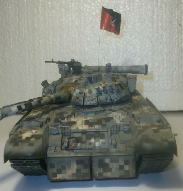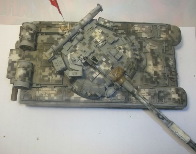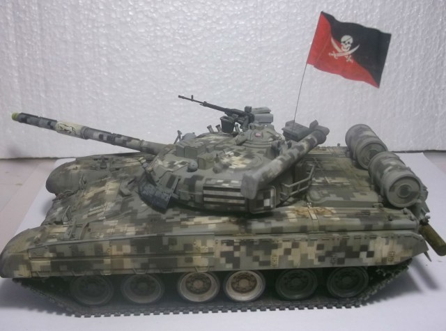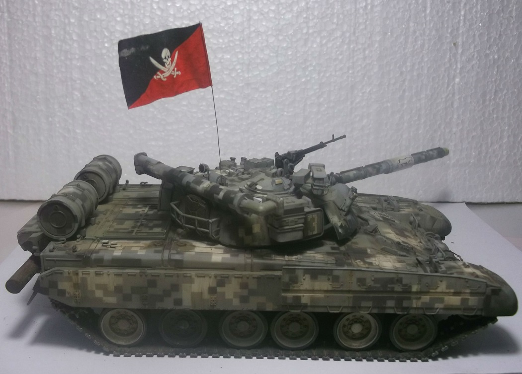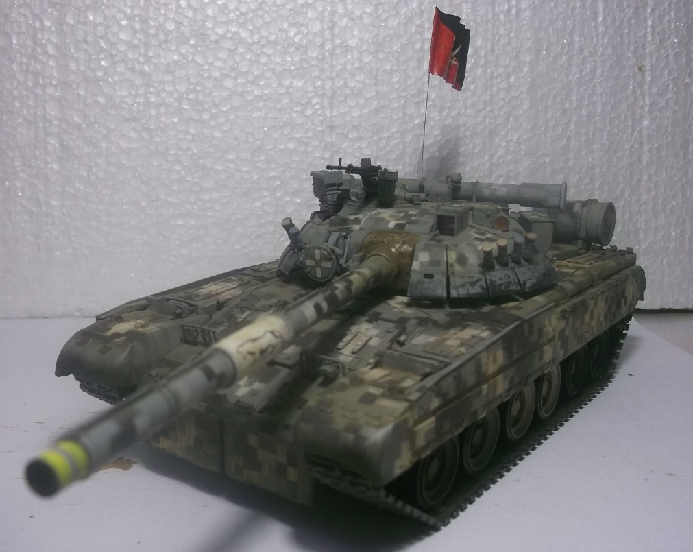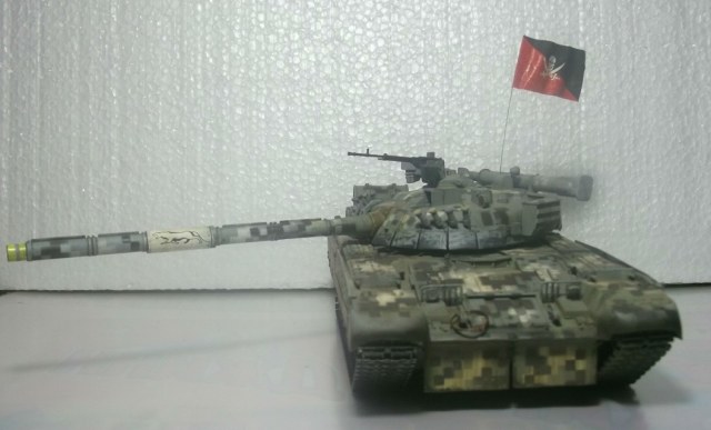 Здравствуйте уважаемые Коробчане! Выставляю на Ваш суд танк Т-80уд ,от Звезды. Извиняюсь за качество фото и фон,снимал на обычную мыльницу. Хорошего фотоаппарата пока нет! Камуфляж и флаг выдуманный,окрашивал красками фирмы валехо. Принимаю любую критику.