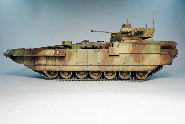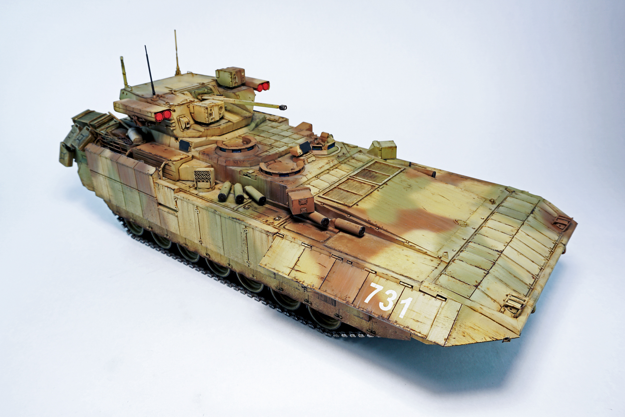 Очень внушительная по размерам (длина модели 27 см) и красивая как мне кажется бмп. Вариант с пушкой 30 мм 2А42, и ПТРК Корнет-ЭМ.