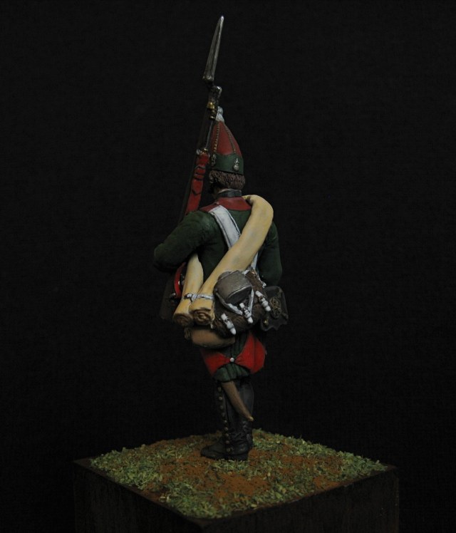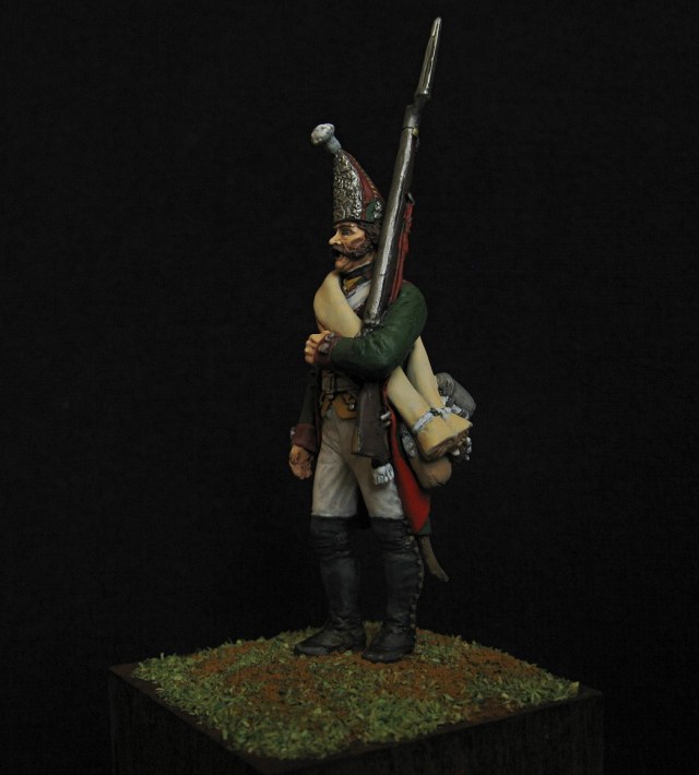 Ух сколько раз я его делал - только сам лепил, сам отливал. Конечно, мои были на порядок примитивнее, так и делал я московцев 23-20 лет назад! А вот ружьё у меня было точно и копийно, а тут как шуваловский "единорог" с прикладом))) и штык не масштабно короткий. Коса и пудра упразднены по походным условиям?