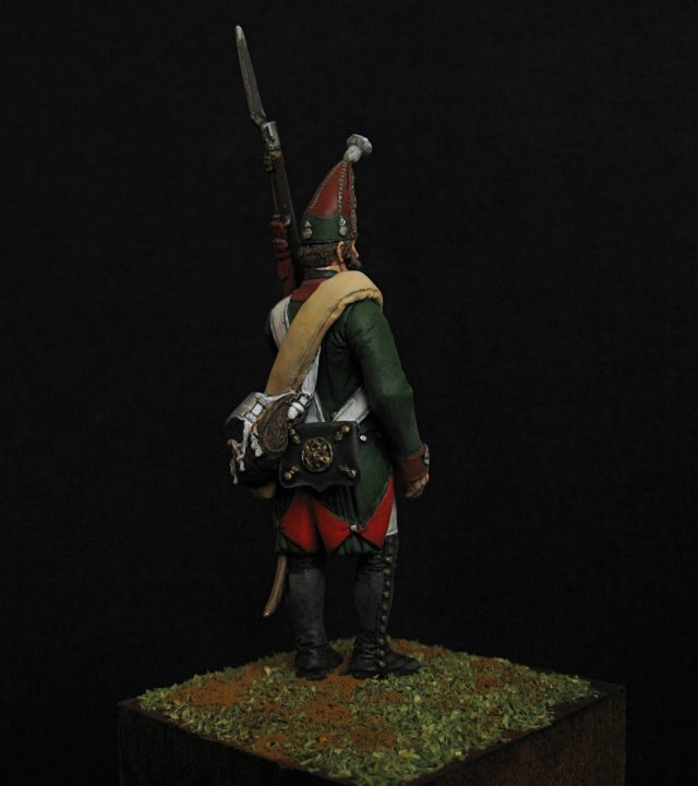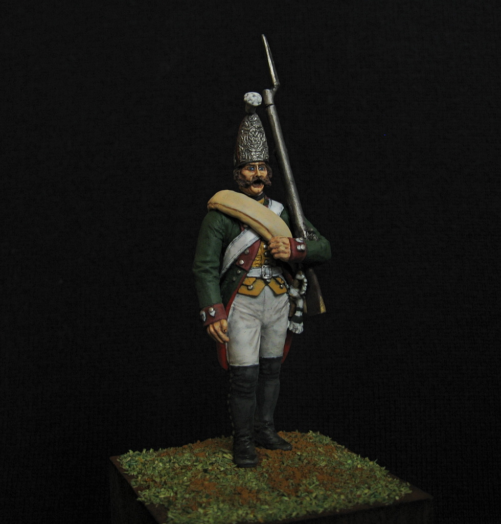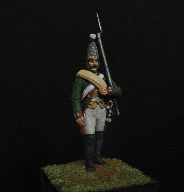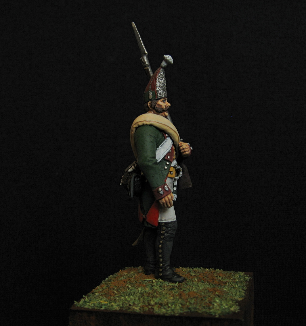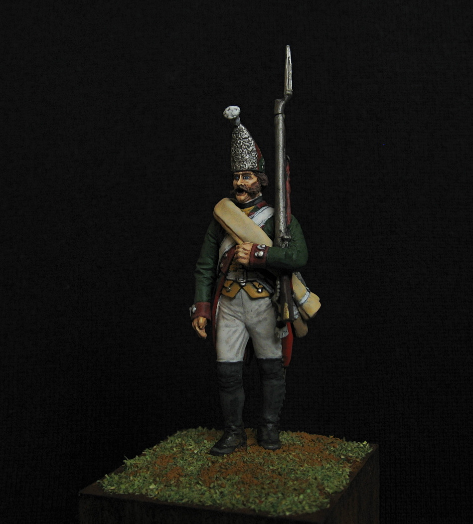 Здравствуйте. Вот такой получился гренадер, гренадерской роты первого батальона на Итальянскую кампанию 1799 года. По мелочи пришлось, кое-что переделать) 54 мм. Акрил, эмаль.