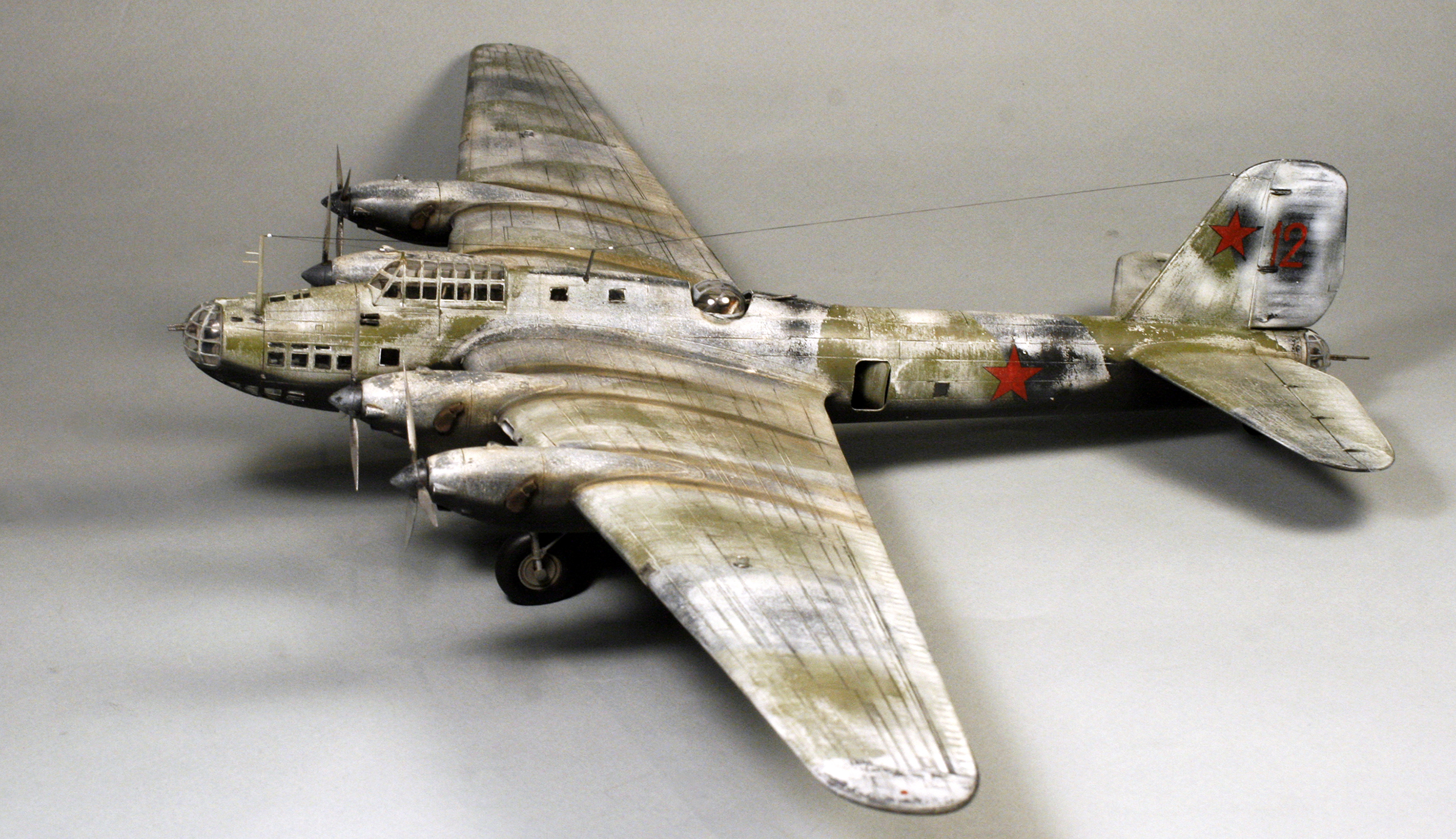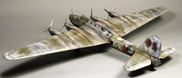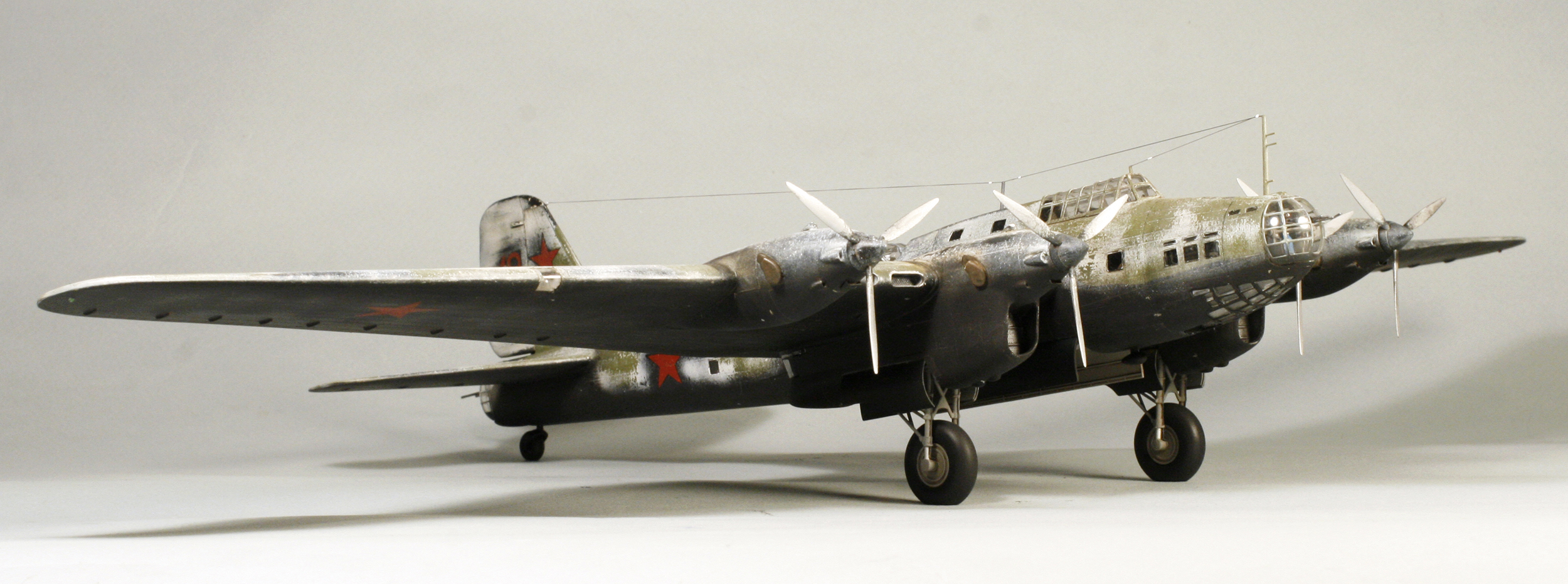 Итак - прототип. Созданный во второй половине 30ых годов дальний бомбардировщик выпускался малыми партиями с 1939 по 1944 год и постоянно модернизировался в ходе производства. На счету этого самолета и налеты на Берлин, и перевозка Молотова в Англию и США, и сбросы самой мощной советский пятитонной бомбы времен ВОВ - ФАБ-5000. После войны эти самолеты еще долго служили в полярной авиации. Часть самолетов выпускалась с дизельными двигателями АЧ-30/М-30Б. Более подробно прочитать о прототипе можно на Уголке Неба.