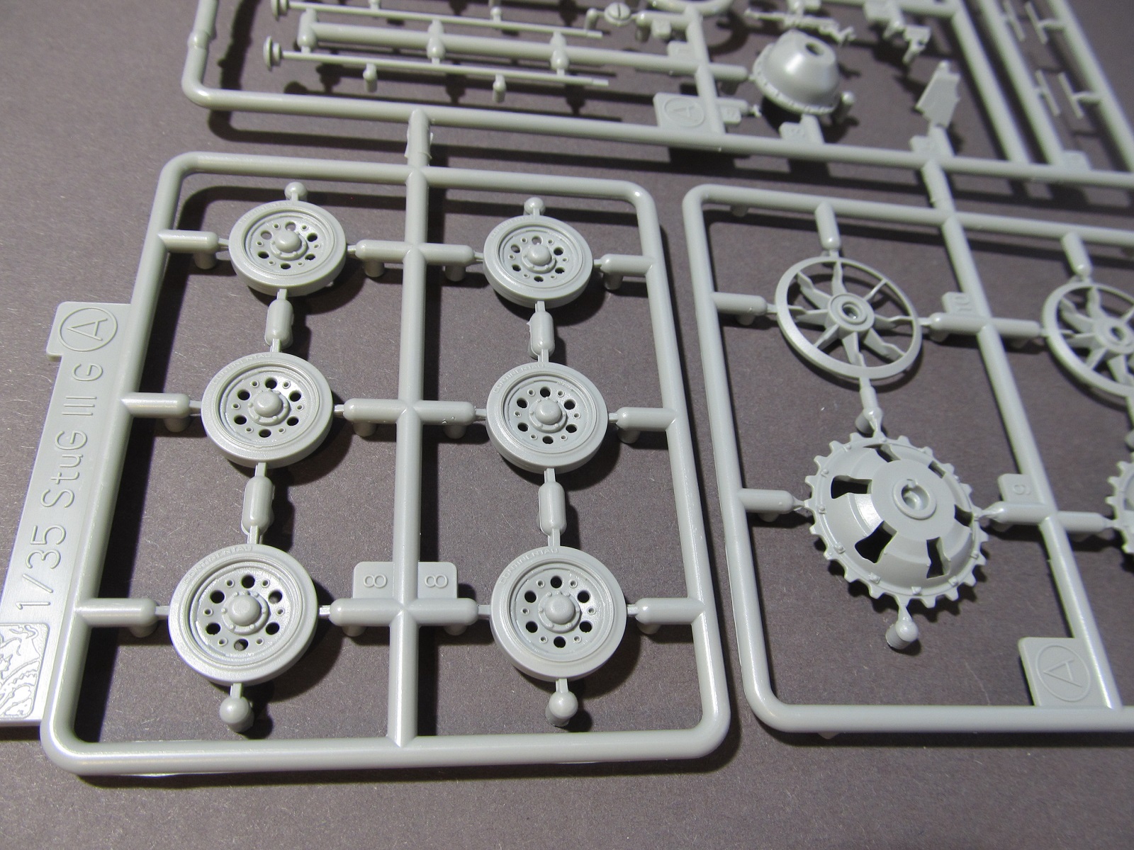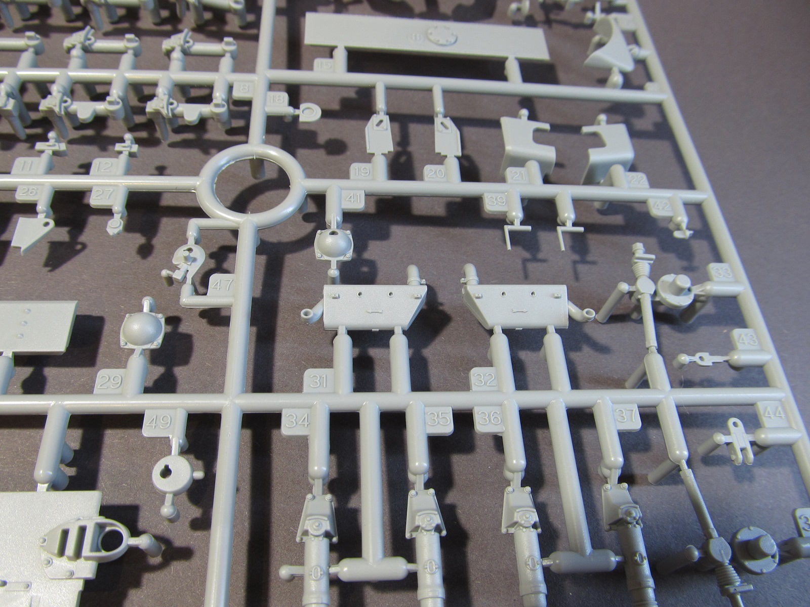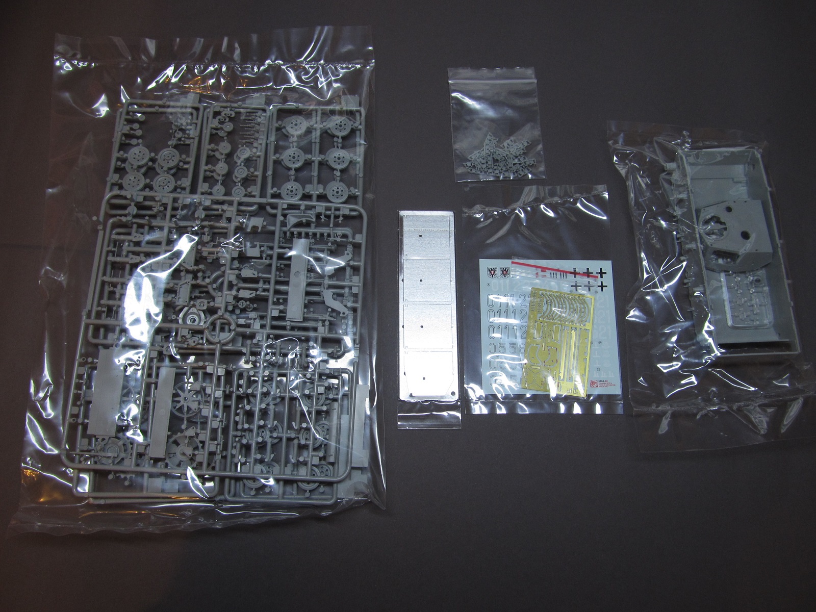 Внутри коробки находятся 17 литников с деталями набора светло серого цвета, два небольших литника из прозрачного пластика с деталями смотровых приборов, ванна корпуса и верхняя часть башни даны отдельными деталями, отдельно друг от друга упакованные гусеничные ленты из мягкой песочного цвета резины, небольшая плата фототравления, две фототравленых платы с навесными экранами и лист с декалями.