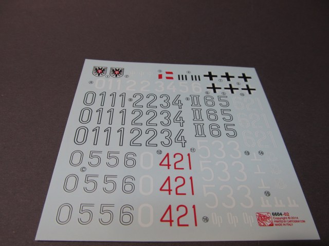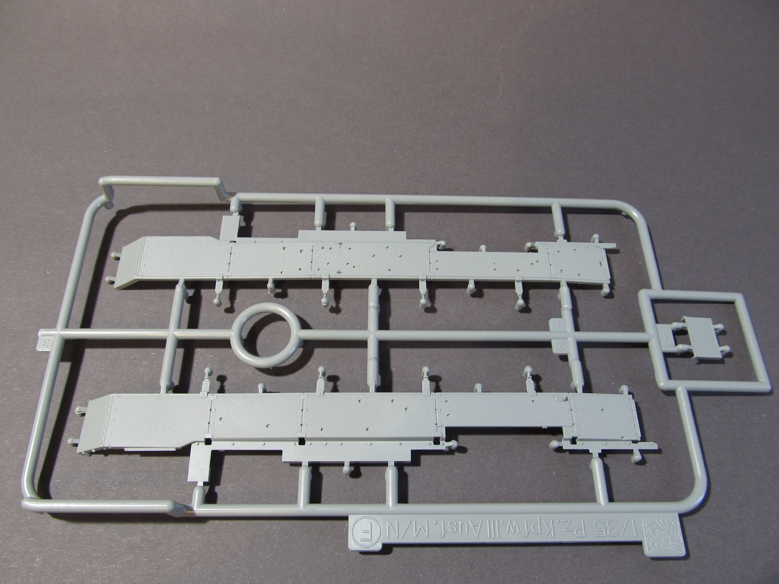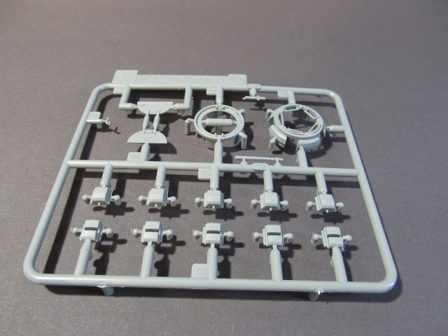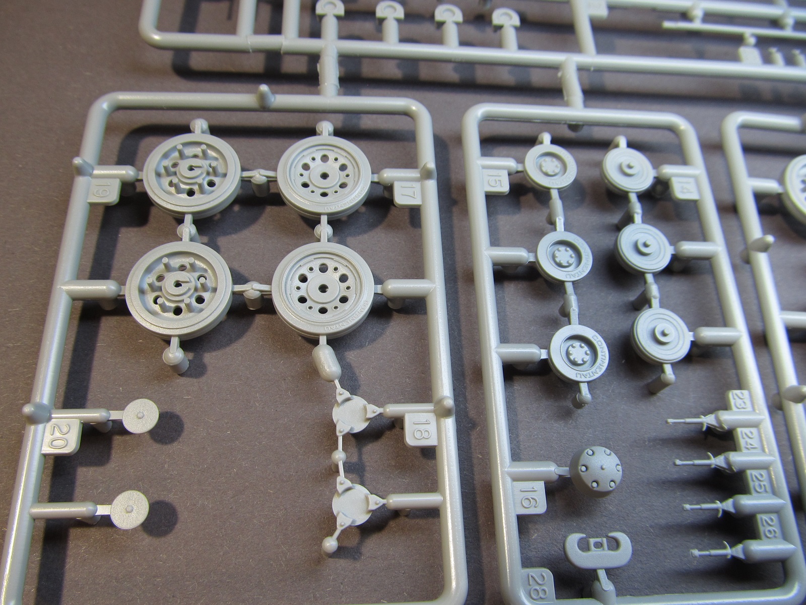 Внутри коробки находятся 17 литников с деталями набора светло серого цвета, два небольших литника из прозрачного пластика с деталями смотровых приборов, ванна корпуса и верхняя часть башни даны отдельными деталями, отдельно друг от друга упакованные гусеничные ленты из мягкой песочного цвета резины, небольшая плата фототравления, две фототравленых платы с навесными экранами и лист с декалями.