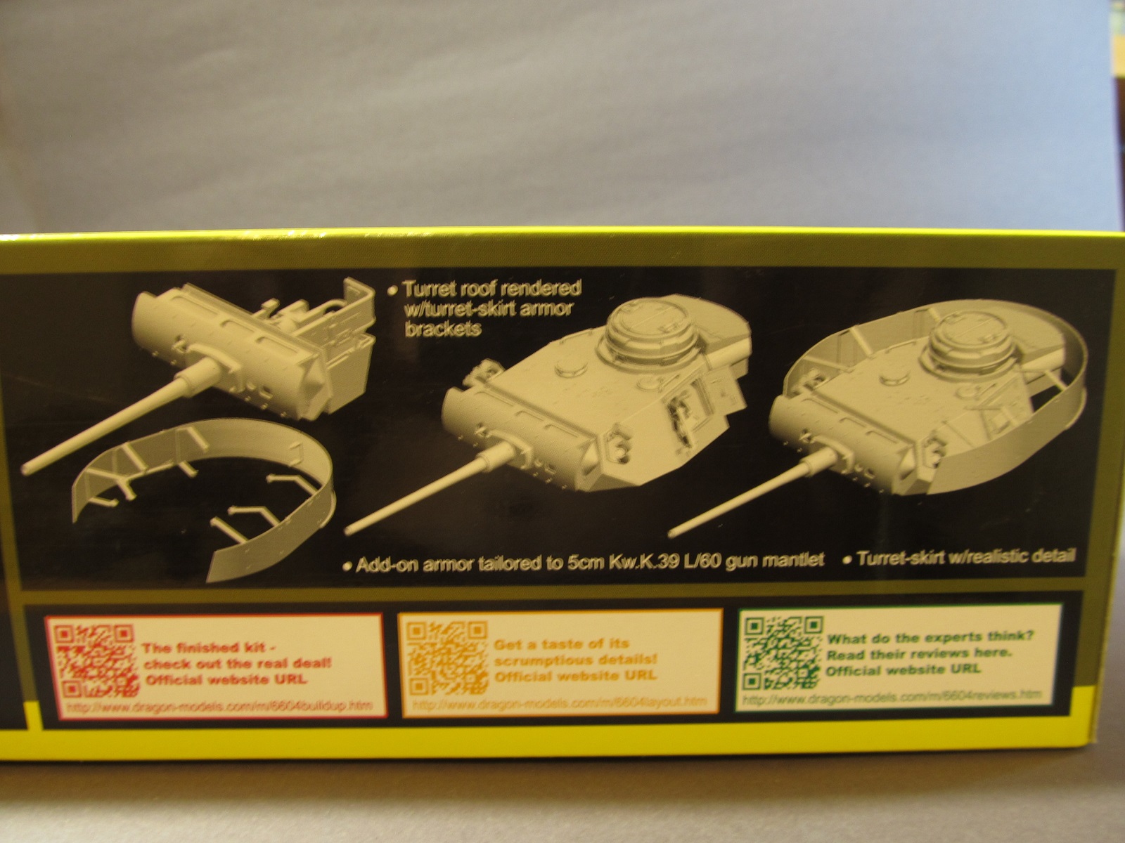 Коробка среднего размера, оформлена традиционно для Drаgon информативно, красочно и качественно. На лицевой стороне собственно изображена "тройка" 3 танкового полка 2 танковой дивизии вермахта в период действия на Курской дуге. На боковых частях коробки изображены: 7 предлагаемых цветных вариантов окраски и нанесения декалей на танк на одной стороне и вид готовой модели с вариантами и особенностями сборки башни танка на другой стороне. Так же, традиционно, под информационные фото по сборке модели отдана и тыльная часть коробки. Это довольно удобно для покупателя на мой взгляд: до покупки можно оценить качество и предлагаемый состав деталей, наличие фототравления в наборе, качество предлагаемых гусеничных лент, особенности сборки.