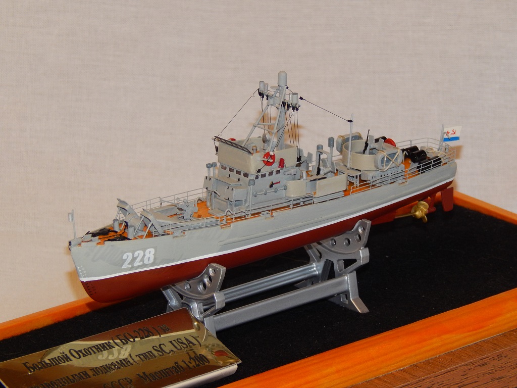 Идея построить модель катера возникла давно, и витала в воздухе. Стал собирать материалы, в основном фотографии (Помогли и из семейного архива) и общие планы, далее в инете попался альбом для бумажной модели охотника SC-1029 USA по ватер-линию и в масштабе 1:250. И это всё легло в основу работы. Перевёл масштаб на 200-й, доделал подводную часть (днище, винто-рулевую группу, крепление винтов на SC оригинальное). Получившийся в результате каркас корпуса заполнен 2-х компонентной шпатлёвкой, далее шлифовка, покраска. Использовал травлёнку в масштабе от «других». Надстройки выполнены из модельного листового пластика. Палубы: 2-х мм нарезка из дерева, ну и остальное по-мелочи. Красил «Тамией» из баллончика и кистью. Традиционно выполнен стеклянный фонарь.