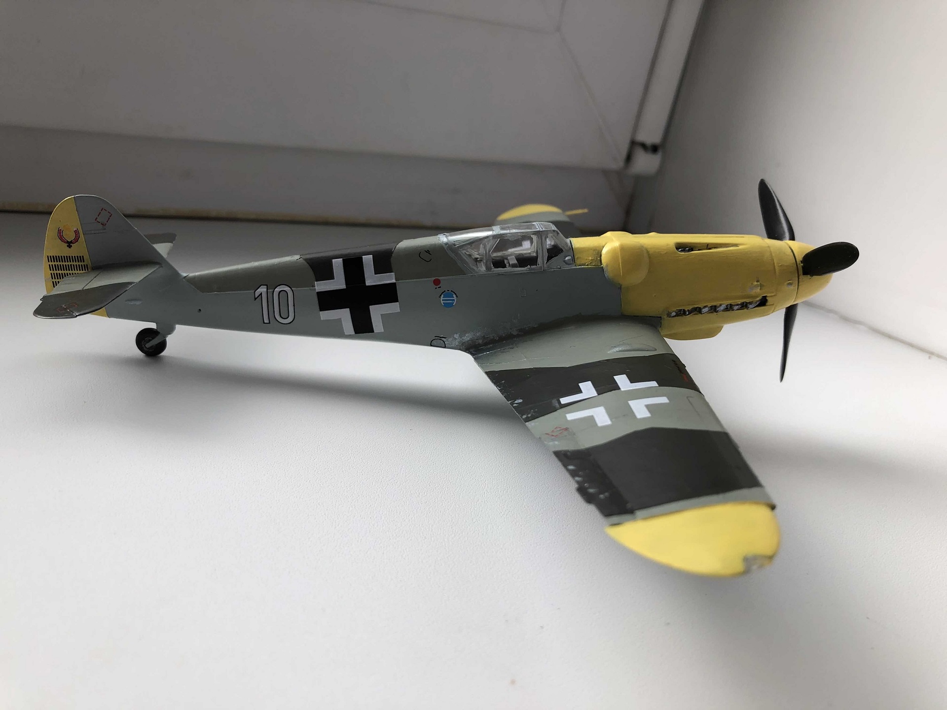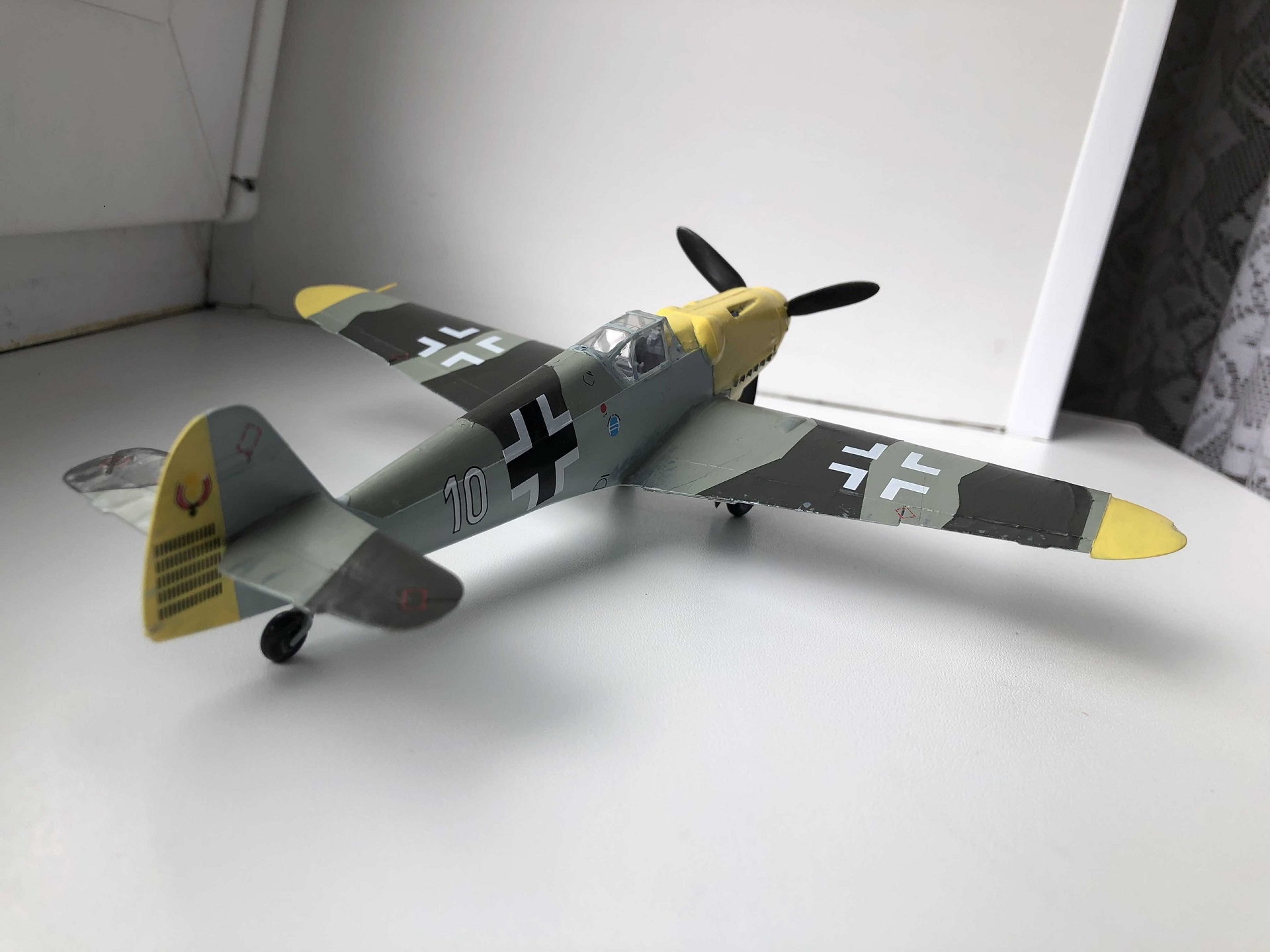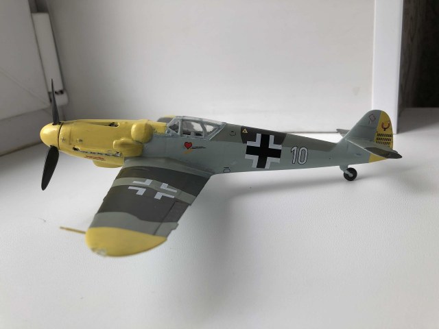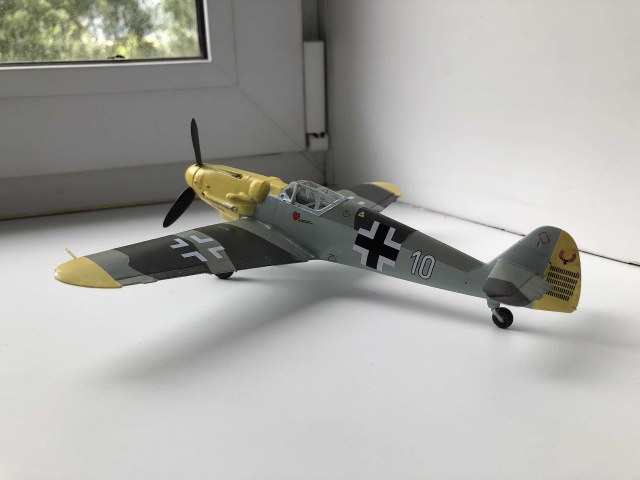 Всем доброго времени суток.Рад вступить в ряды любителей моделизма и очень рассчитываю на теплый приём и на ваши советы, потому что вопросы, чувствую, у меня возникать будут часто. А пока выкладываю первую в жизни модель. В процессе сборки никаких проблем с самим набором не обнаружил, разве что инструкция местами недостаточно понятна. Все косяки, как при сборке, так и при покраске, относятся к моей собственной невнимательности, неаккуратности и отсутствию необходимых инструментов. Красил кистью, акриловыми красками от "ZIP maket ", из химии использовал лишь автомобильный обезжириватель, матовый лак от Tamiya и жидкость для нанесения декалей от той же Tamiya, грунтом служил первый слой краски. Главной целью целью покраски было создать приемлемый для немецкого самолёта внешний вид, с реальностью при таком подходе много общего и достоверного быть не может) Больше всего обидно за фонари, аккуратно покрасить не получилось, а маски делать было не из чего. Попытался также сделать сколы краски и просто наносил кистью стальной цвет, наносил бездумно и где попало, поэтому и конечный результат не сильно обрадовал. В итоге хочу сказать, что результатом я все равно доволен, постепенно буду обзаводиться различной химией, расходниками и инструментами, пробовать новые техники и повышать свои навыки. Дело затянуло меня с головой, цены, правда, кусаются, но со временем всё будет. Спасибо за просмотр, ещё увидимся!