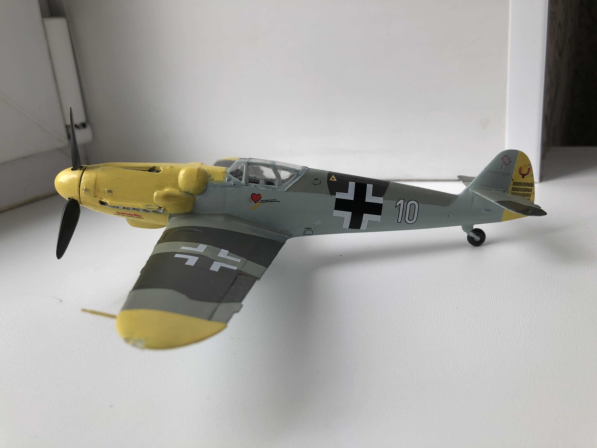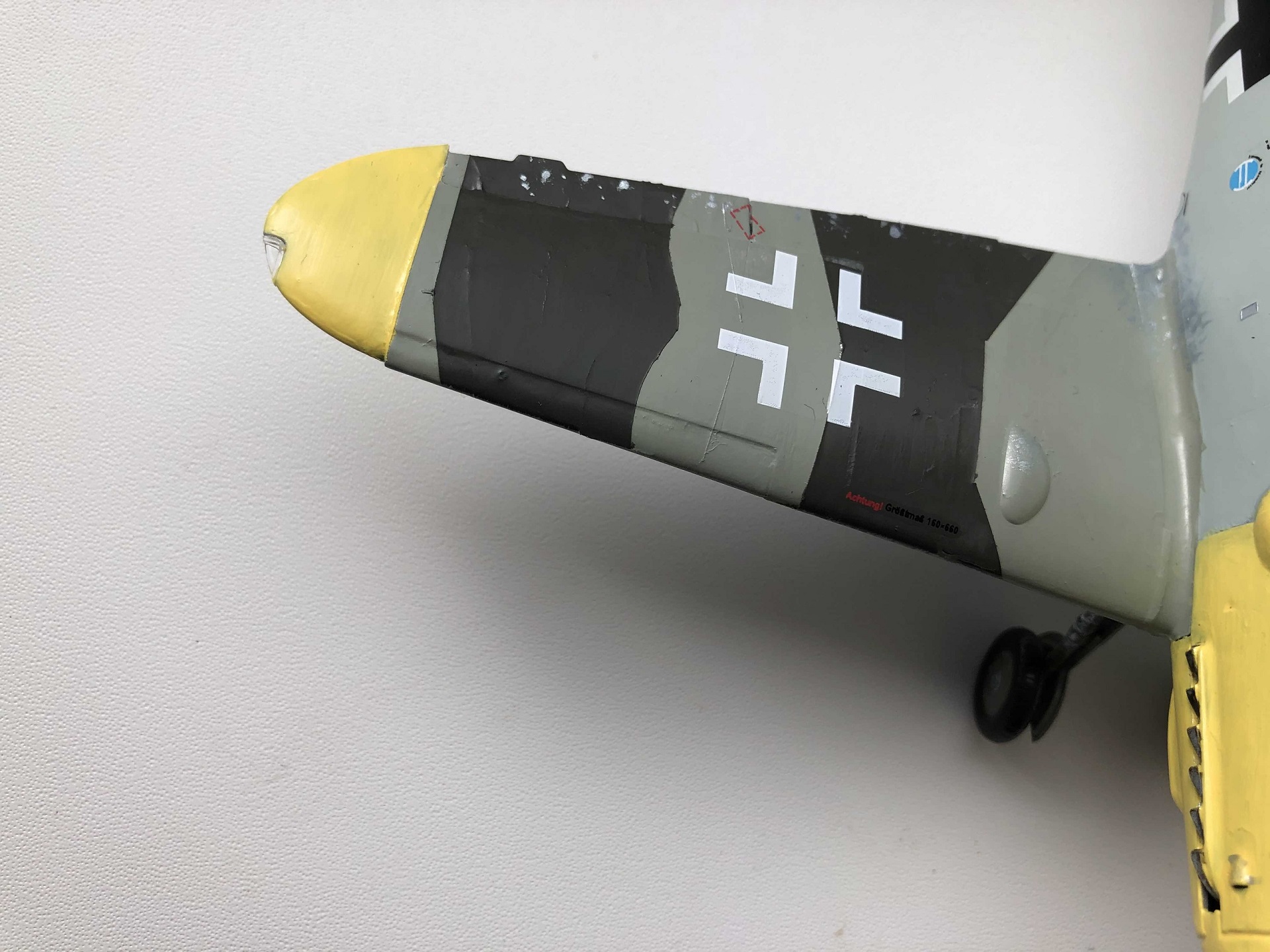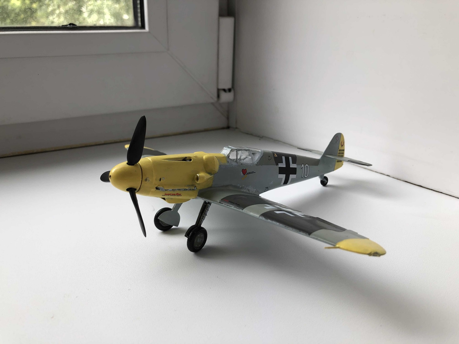 Всем доброго времени суток.Рад вступить в ряды любителей моделизма и очень рассчитываю на теплый приём и на ваши советы, потому что вопросы, чувствую, у меня возникать будут часто. А пока выкладываю первую в жизни модель. В процессе сборки никаких проблем с самим набором не обнаружил, разве что инструкция местами недостаточно понятна. Все косяки, как при сборке, так и при покраске, относятся к моей собственной невнимательности, неаккуратности и отсутствию необходимых инструментов. Красил кистью, акриловыми красками от "ZIP maket ", из химии использовал лишь автомобильный обезжириватель, матовый лак от Tamiya и жидкость для нанесения декалей от той же Tamiya, грунтом служил первый слой краски. Главной целью целью покраски было создать приемлемый для немецкого самолёта внешний вид, с реальностью при таком подходе много общего и достоверного быть не может) Больше всего обидно за фонари, аккуратно покрасить не получилось, а маски делать было не из чего. Попытался также сделать сколы краски и просто наносил кистью стальной цвет, наносил бездумно и где попало, поэтому и конечный результат не сильно обрадовал. В итоге хочу сказать, что результатом я все равно доволен, постепенно буду обзаводиться различной химией, расходниками и инструментами, пробовать новые техники и повышать свои навыки. Дело затянуло меня с головой, цены, правда, кусаются, но со временем всё будет. Спасибо за просмотр, ещё увидимся!