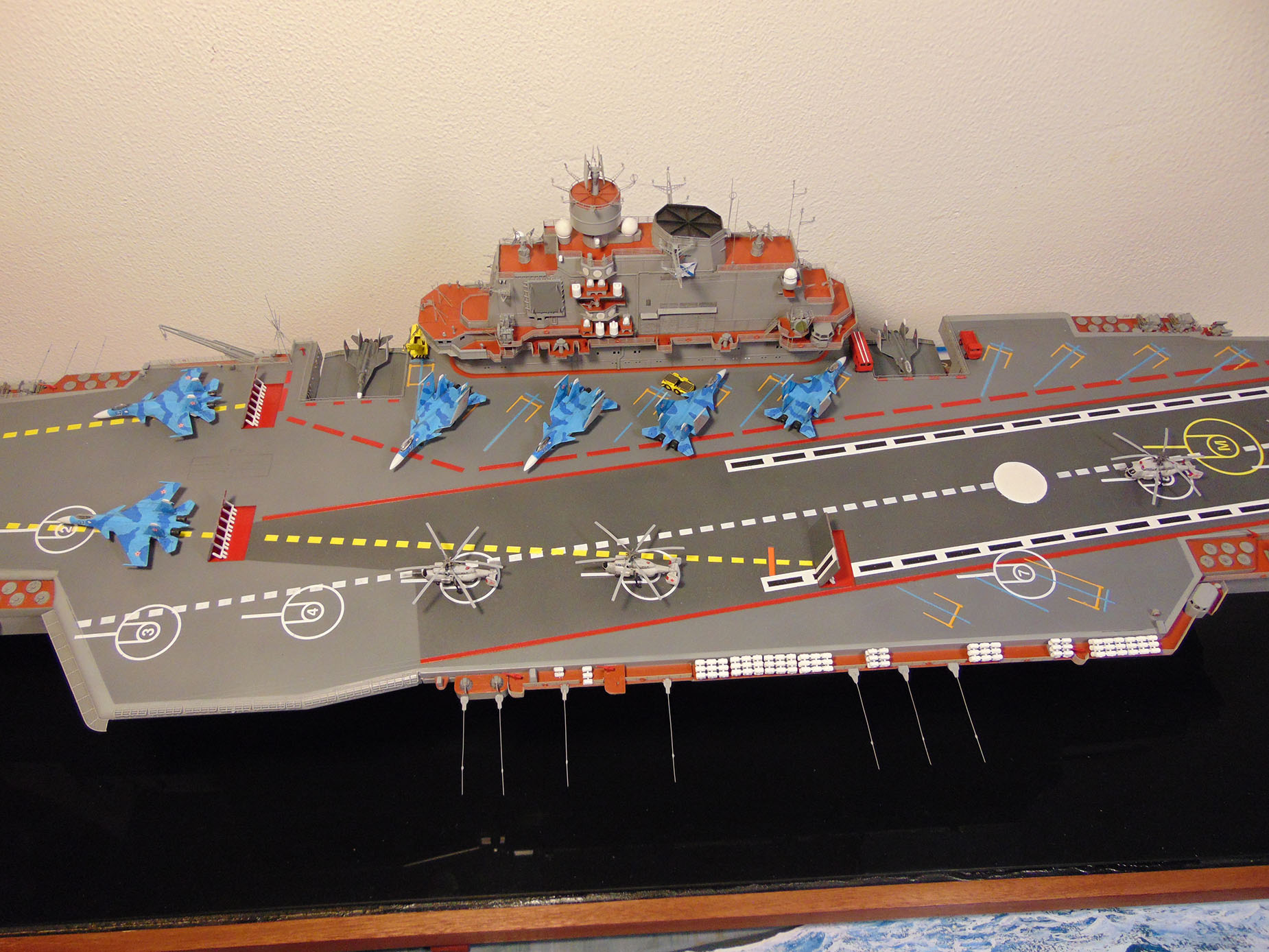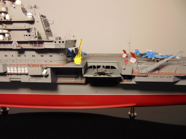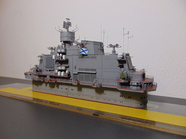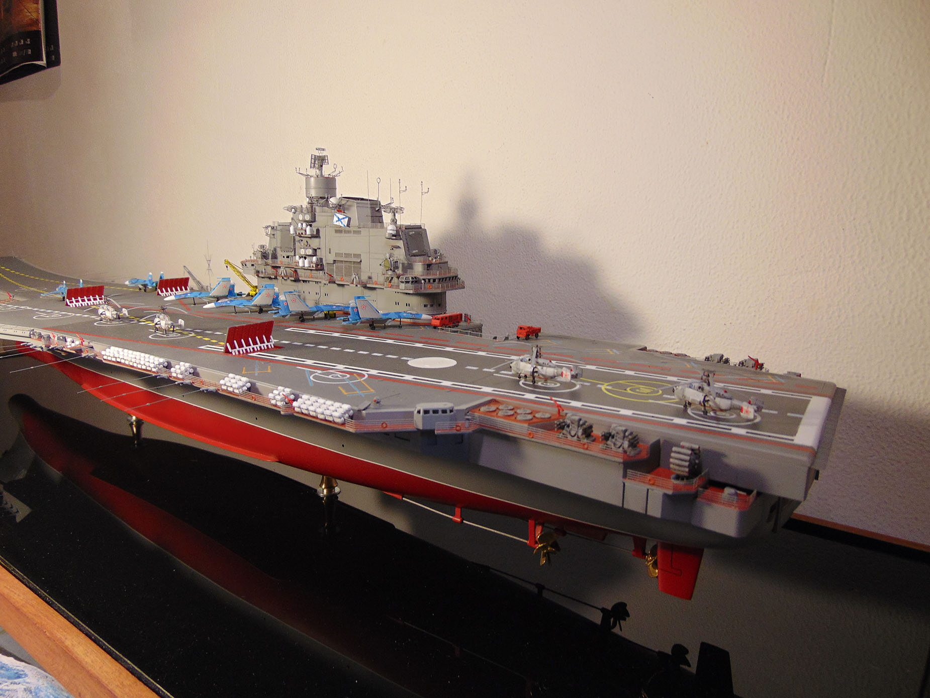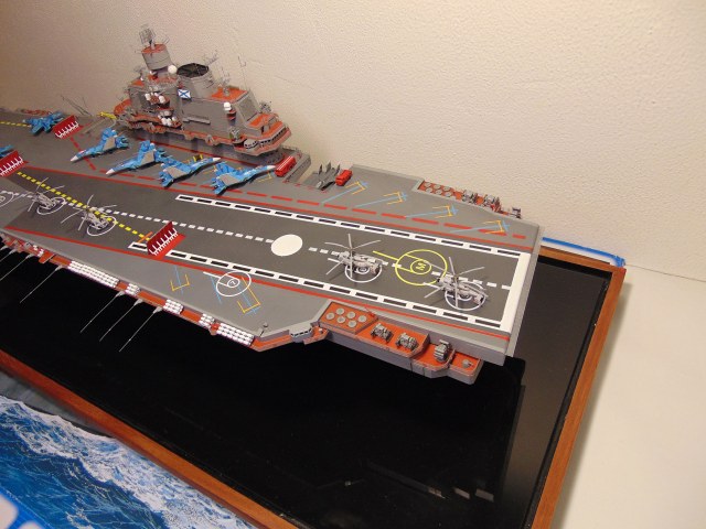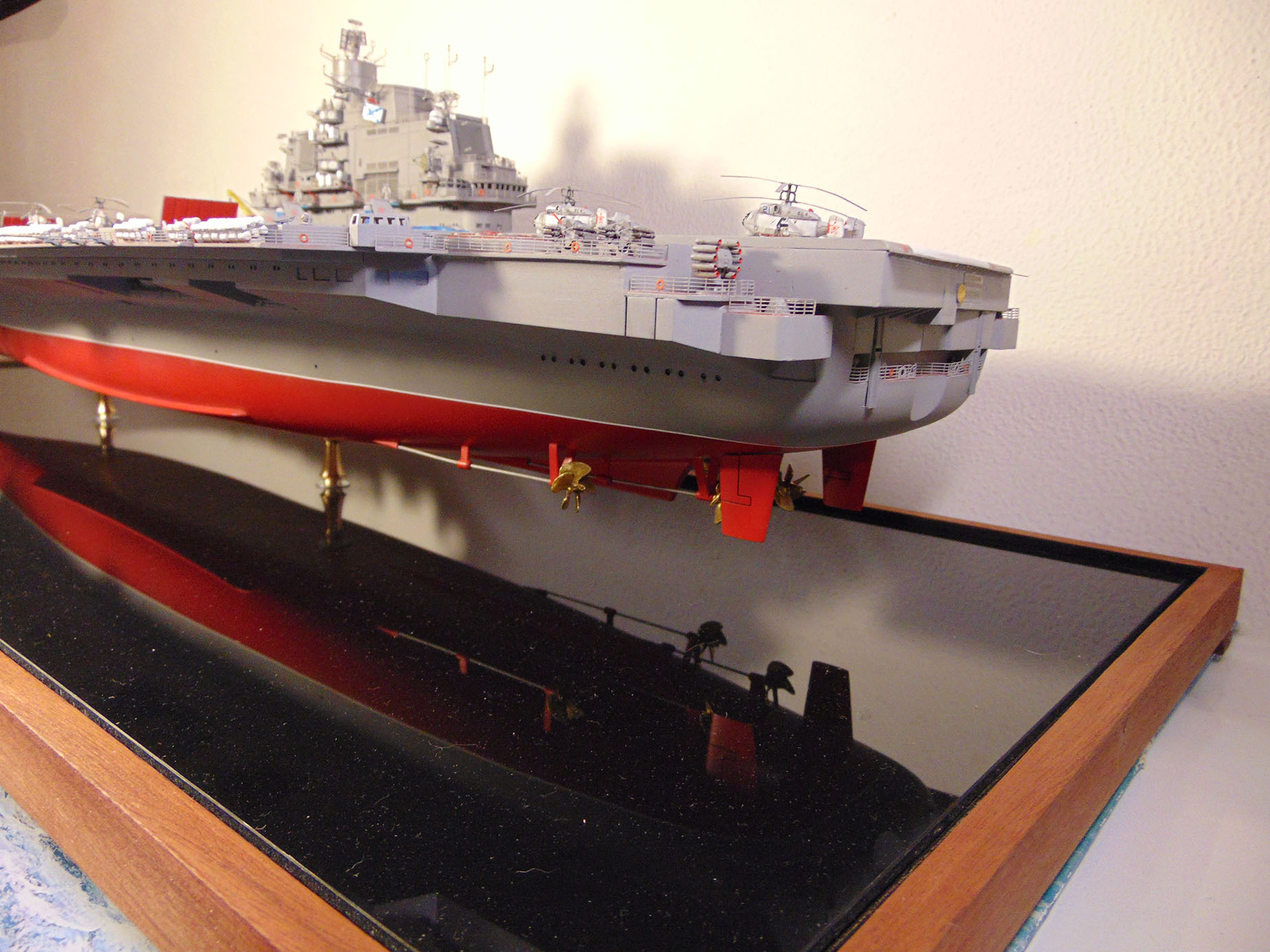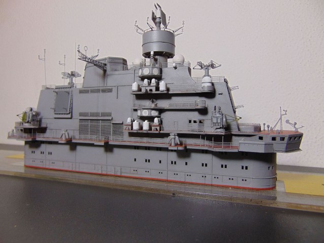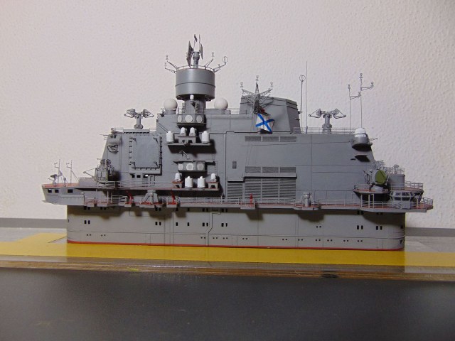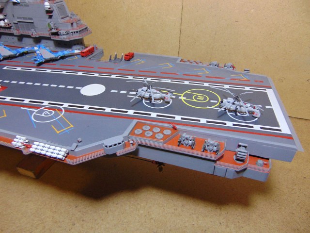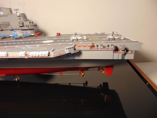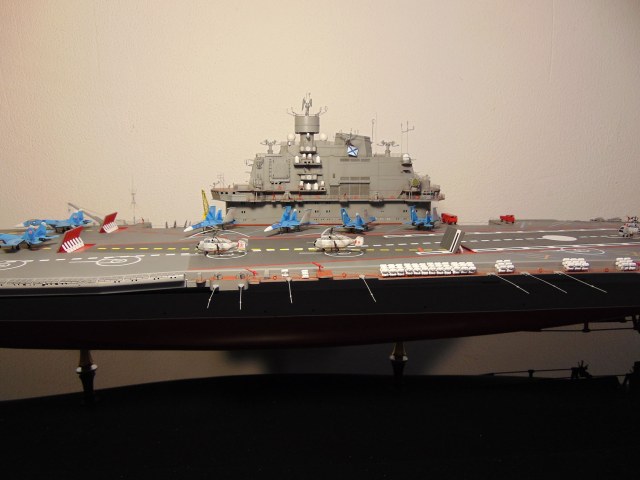 А щели на стыках все равно видны, не хватило шпаклевки значит, вопрос к карабелам - расположение сушек в разные стороны по отношению к острову нормальное явление? Так же готовые к пуску все катапульты тоже сомнительно и тем более открытый щиток перед которым базируются вертолеты мало правдоподобно. В остальном - неплохой экспонатный вариант.