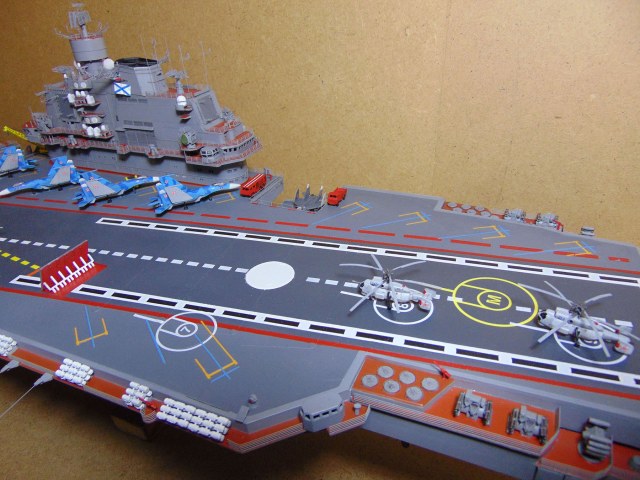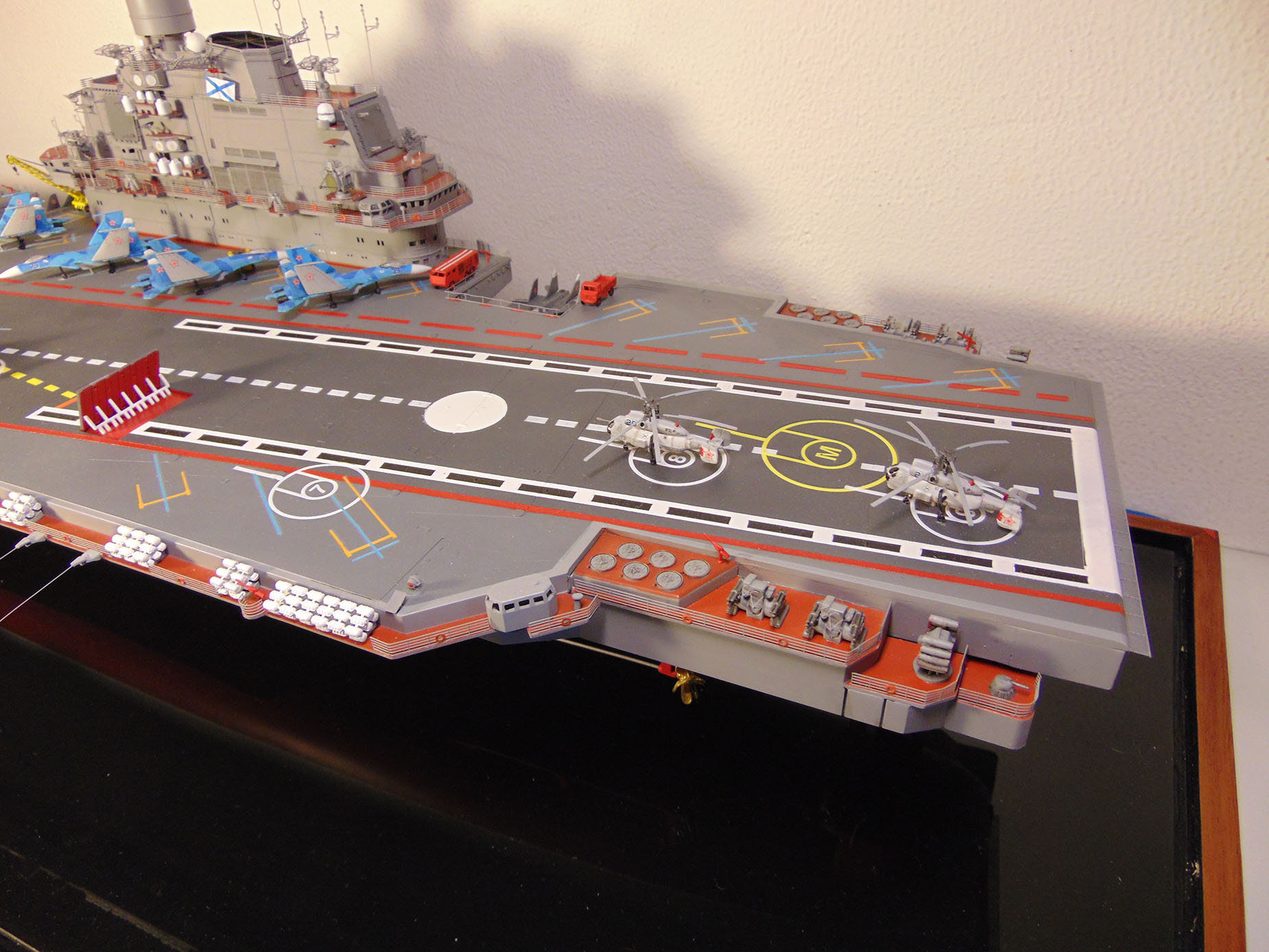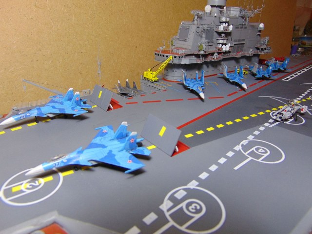 Хорошая работа. Мне понравилось. Однако, есть замечания по окраске Су-33 (камуфляж не соответствует прототипу) и Ка-27 (если лобовые стекла накрашены черным, почему не покрашены боковые стекла кабины пилотов? Цвет лопастей должен отличатся от цвета корпуса). За Галерею.