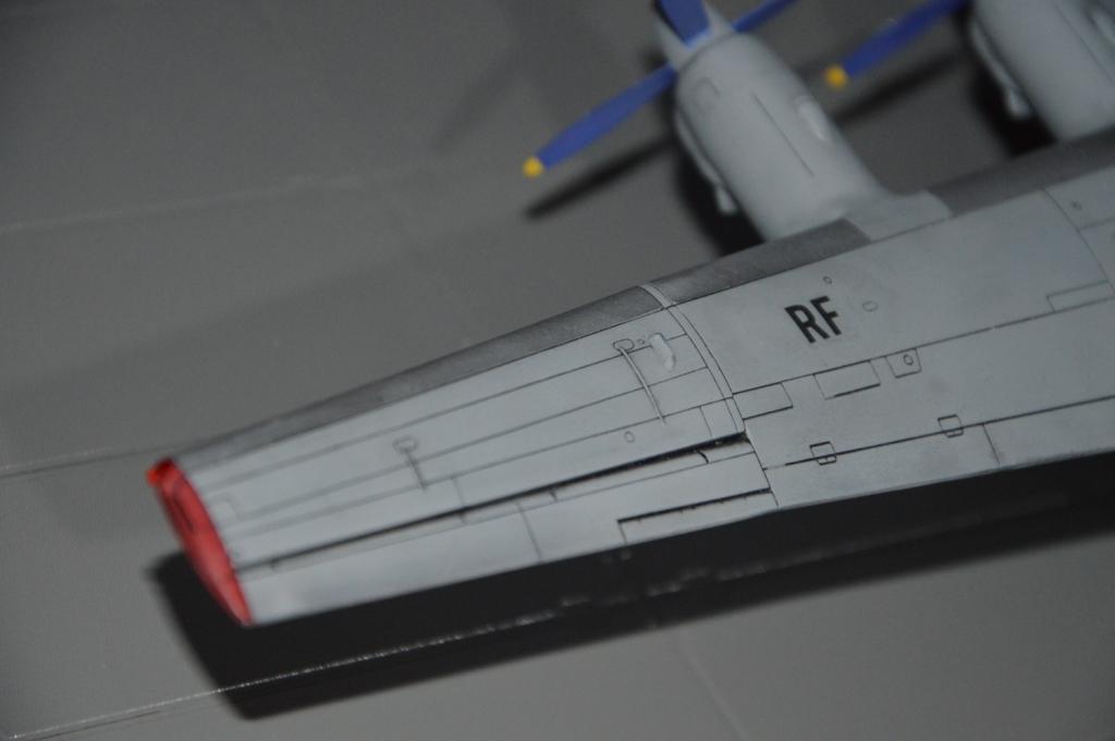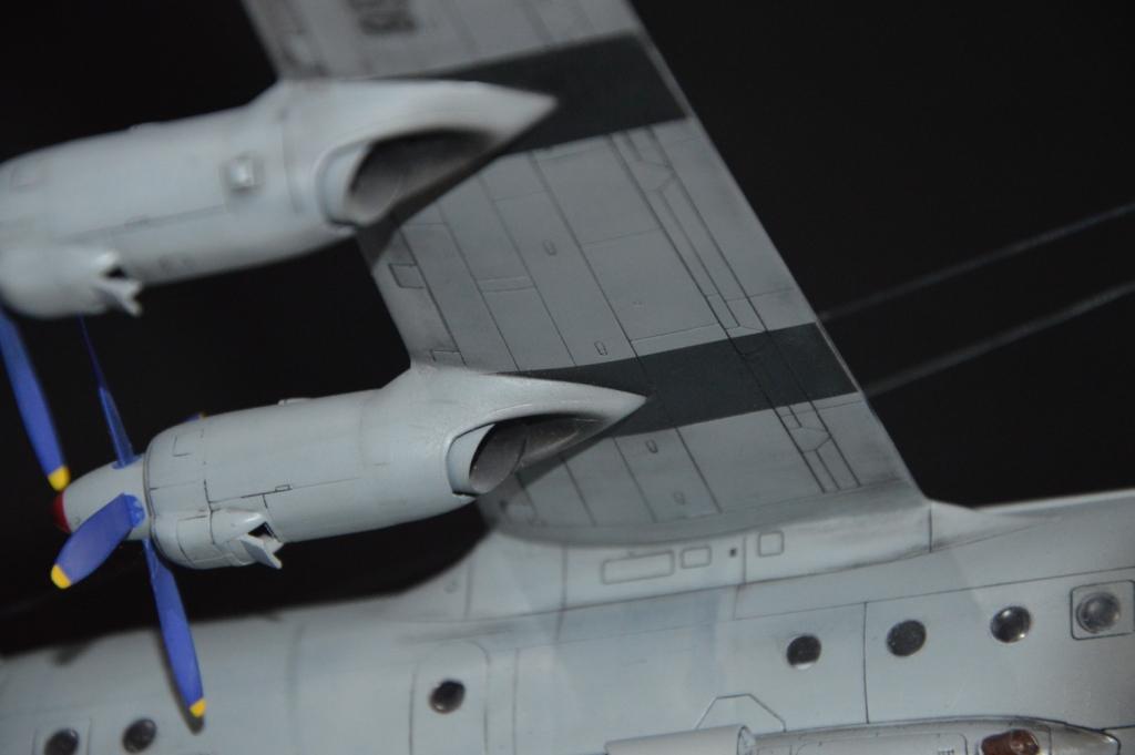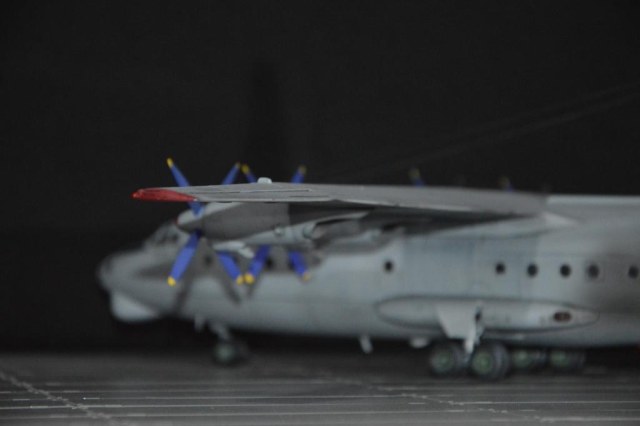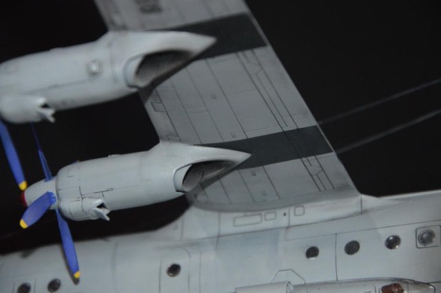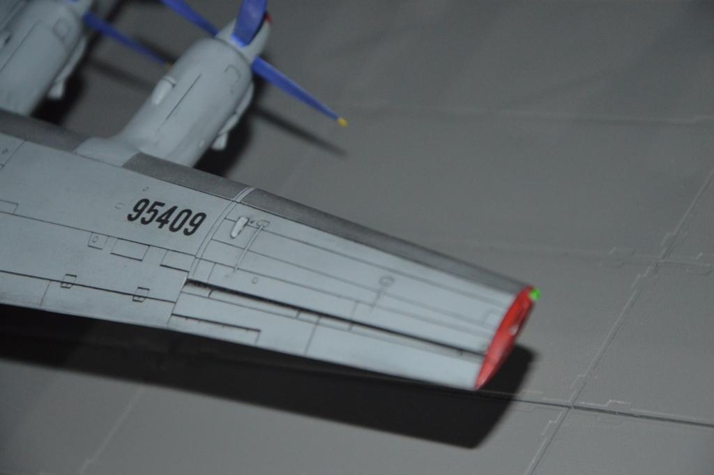 Раз уж поместили фото прототипа, то придётся отметить несоответствия. Антибликовое чёрное пятно перед фонарём пилотов не той формы. Электрообогрев лопастей воздушных винтов отсутствует. Выхлопные трубы двигателей и сделаны и покрашены небрежно. То же самое с маслорадиаторами, особенно касаемо створок. Расшивка выделена там, где может и не стоило, зато на капотах двигателя, где она реально хорошо видна у настоящего, на модели нет. Если уж сделали копоть от ВСУ, то от двигателей тоже должно быть, на нижней поверхности крыла.
