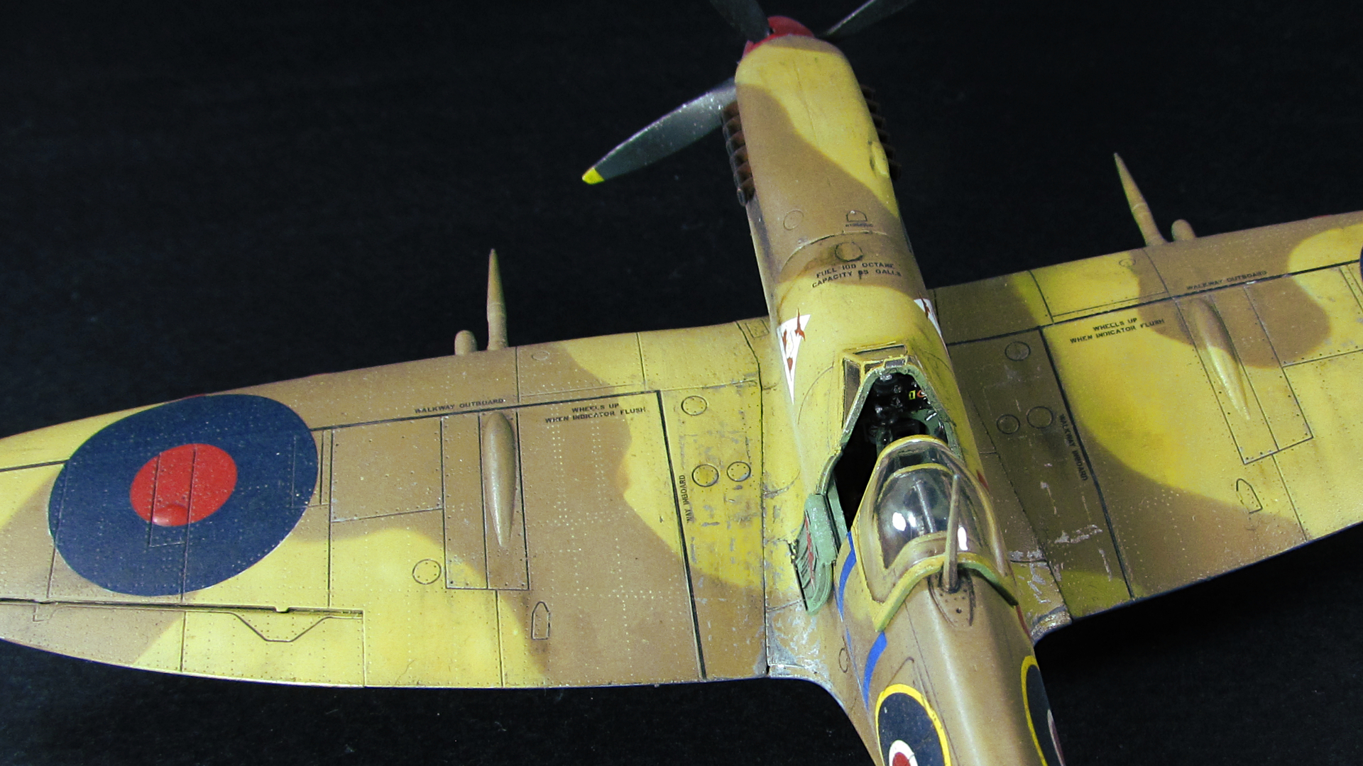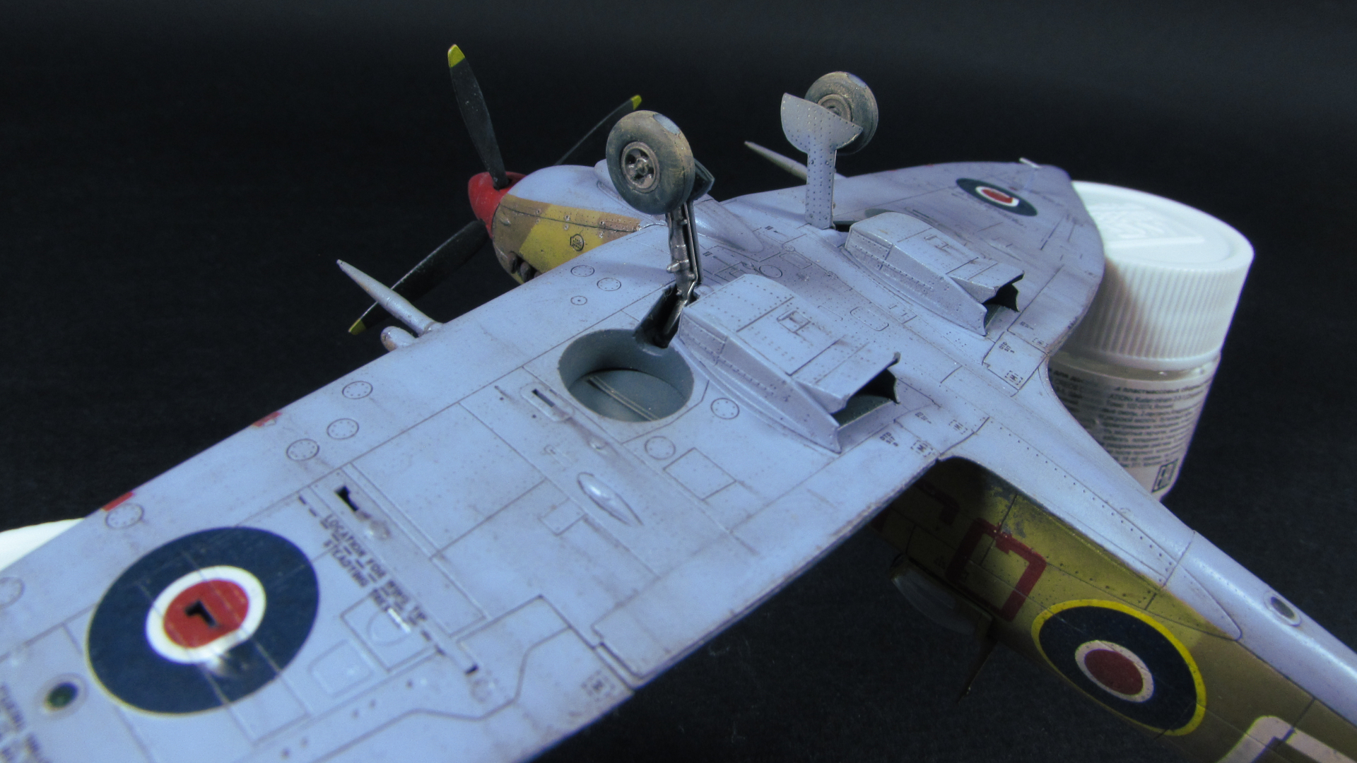 Покраска. Вот тут ждало меня разочарование. Так как цвета мешать я не люблю, от предыдущих экспериментов банок 20 лишней краски теперь лежит мертвым грузом, и к истинности цвета у меня свое отношение, решил я купить готовый набор от AK interactive - RAF Cameflages. Краска мне совершенно не понравилась, так и не смогли мы с ней найти общий язык. Не получилось у меня побороть проблему налипания краски на конце иглы(((. А самый основной момент, который мне не понравился, это то, что пришлось положить довольно таки толстый слой краски чтобы закрыть пришейдинг. В следующих Спитфайерах буду пробовать пришейдинг делать менее контрастным. До этого я пользовался Ганзой и Тамией, краски в работе гораздо приятнее. В будущем красить этим набором АК конечно продолжу, ибо краска уже куплена))) Очень понравились флакончики! Для 72 масштаба, где нужно иногда просто 5 капель краски лучшее решение, особенно удобство дозировки. 5 капель растворителя+3 капли краски+1 капля импрувера... Песня!