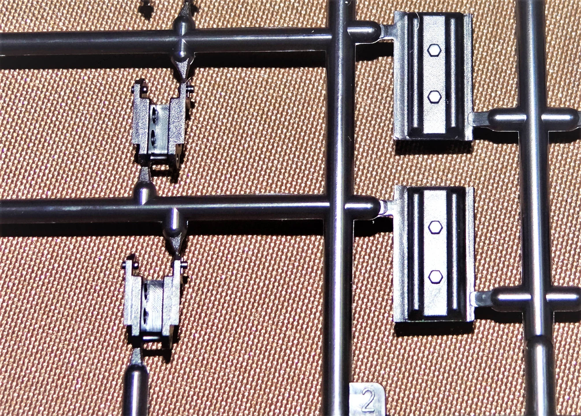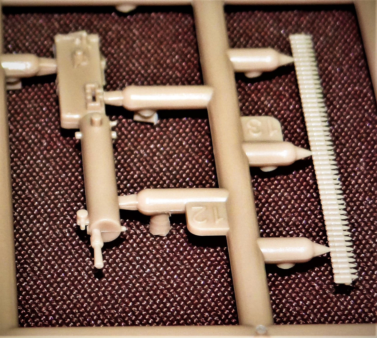 Модель отлита из пластика телесного цвета, достаточно хорошего качества. Облоя (заслуживающего упоминания), утяжин, недоливов и прочей гадости, обнаружено не было, смещения прессформ кстати тоже. Все литники с деталями упакованы в отдельные пакеты. Отдельно порадовала защита для деталей имеющих хрупкие штырьки. Для их сбережения, с двух сторон от детали сделаны на литнике специальные стеночки (есть на отдельном фото), что исключает поломку детали. Некоторым не нравятся "МЕГАновские" толкатели, в виде усеченных столбиков на деталях, но я лично никаких проблем не вижу в этом, убирается все без следа. Траки собираются без клея и каждый состоит из 2 деталей - предстоит повозиться... Слышал нарекания по поводу отвратительного качества пулеметов, якобы отлиты с большим смещением прессформы и годятся только в утиль. Как видно на фото вполне себе нормальные пулеметы, с тоненьким швом, который легко снимается. Возможно опять таки "работа над ошибками" была и производителя. Имеются в продаже точеные стволы как для пулеметов так и для пушки, но я лично не вижу смысла пока.