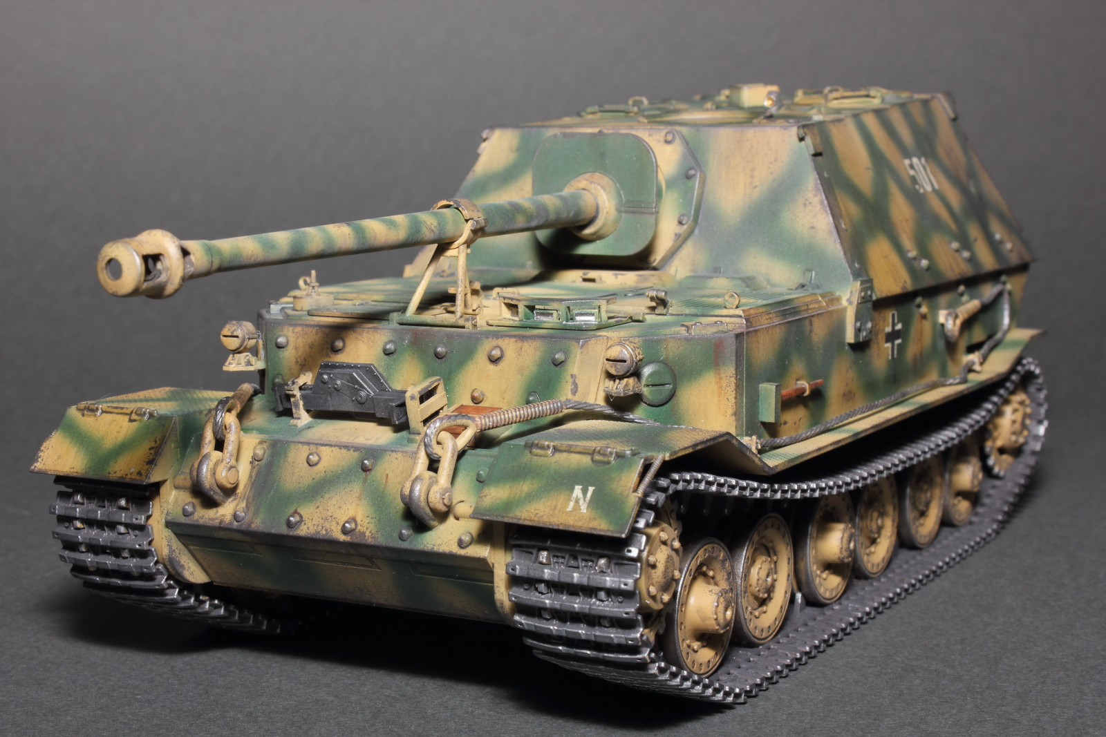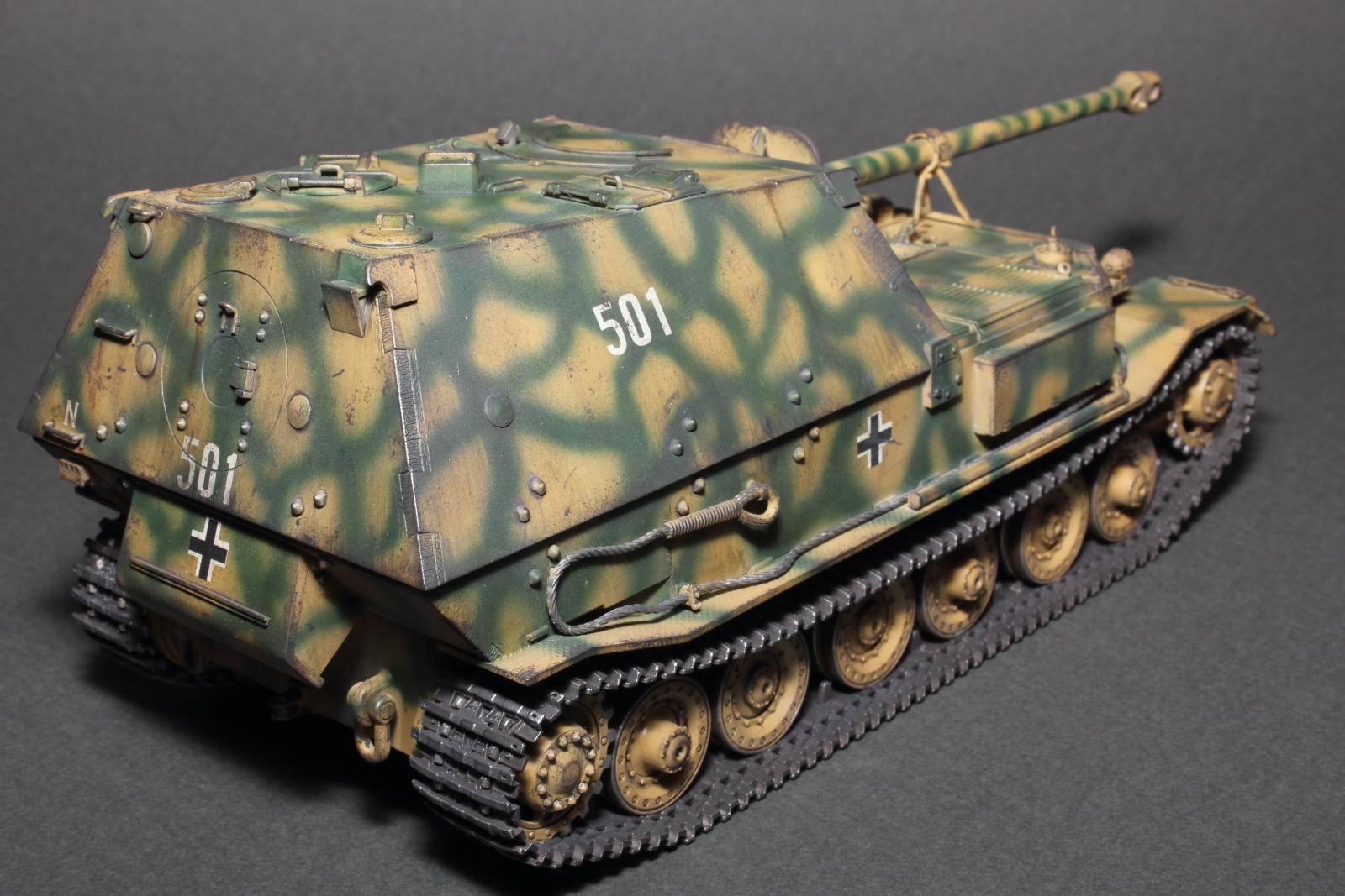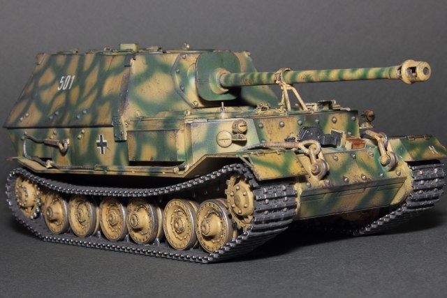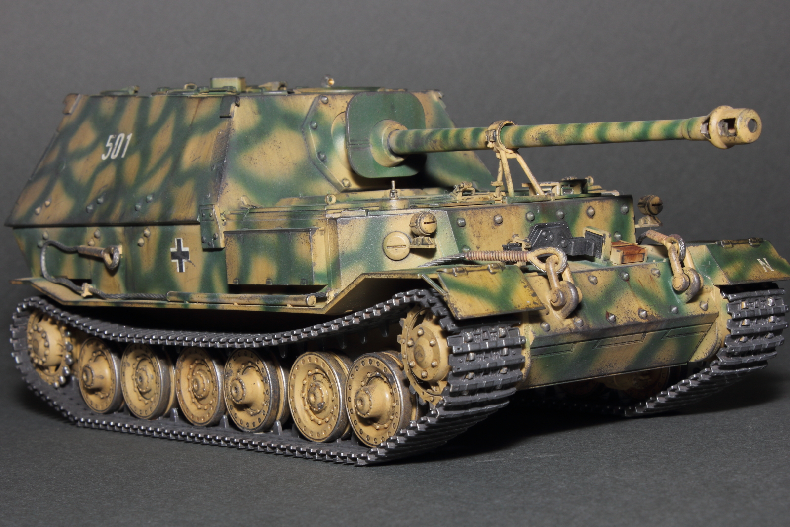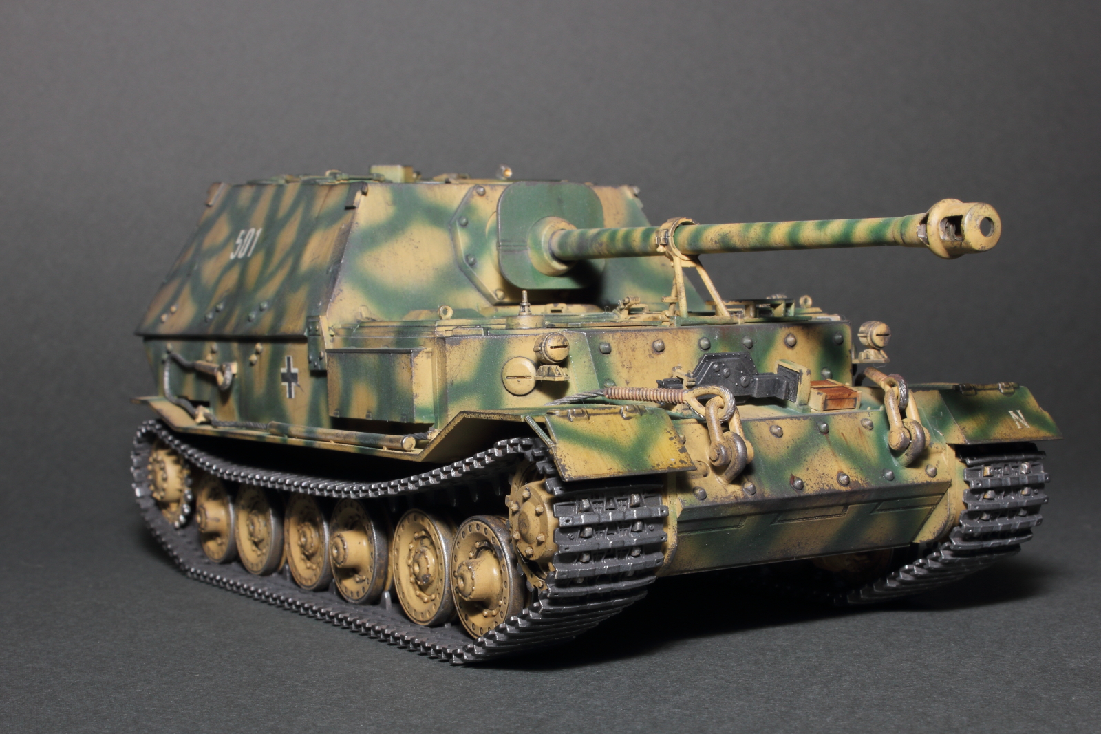 За основу взята всем известная машина под номером 501 из 654 батальона тяжёлых истребителей танков, та самая, что теперь стоит в Патриоте в Кубинке. Уж очень мне хотелось такую после личного, так сказать, знакомства. Полного соответствия прототипу нет, так как всё равно не получилось срисовать с фотографий оригинальный камуфляж. Скорее эта модель по мотивам реального борта. Модель полностью искоробочная кроме сетки на корму, её поставил металлическую. Ещё добавил резку бронеплит на торцах. Возникли проблемы с траками. они оказались сильно натянуты и висели над катками, пришлось прижимать. Вроде бы делал по инструкции (за исключением того, что гусеничную ленту собрал отдельно и ставил в конце работы). Такая проблема возникла с обеих сторон. Может я где-то и что-то напутал. В покраске использовал акрил от "Tamiya" и "Мастер-акрил" от "Звезды" для мелочей, масло "Сонет" и химию от "A-model".