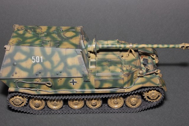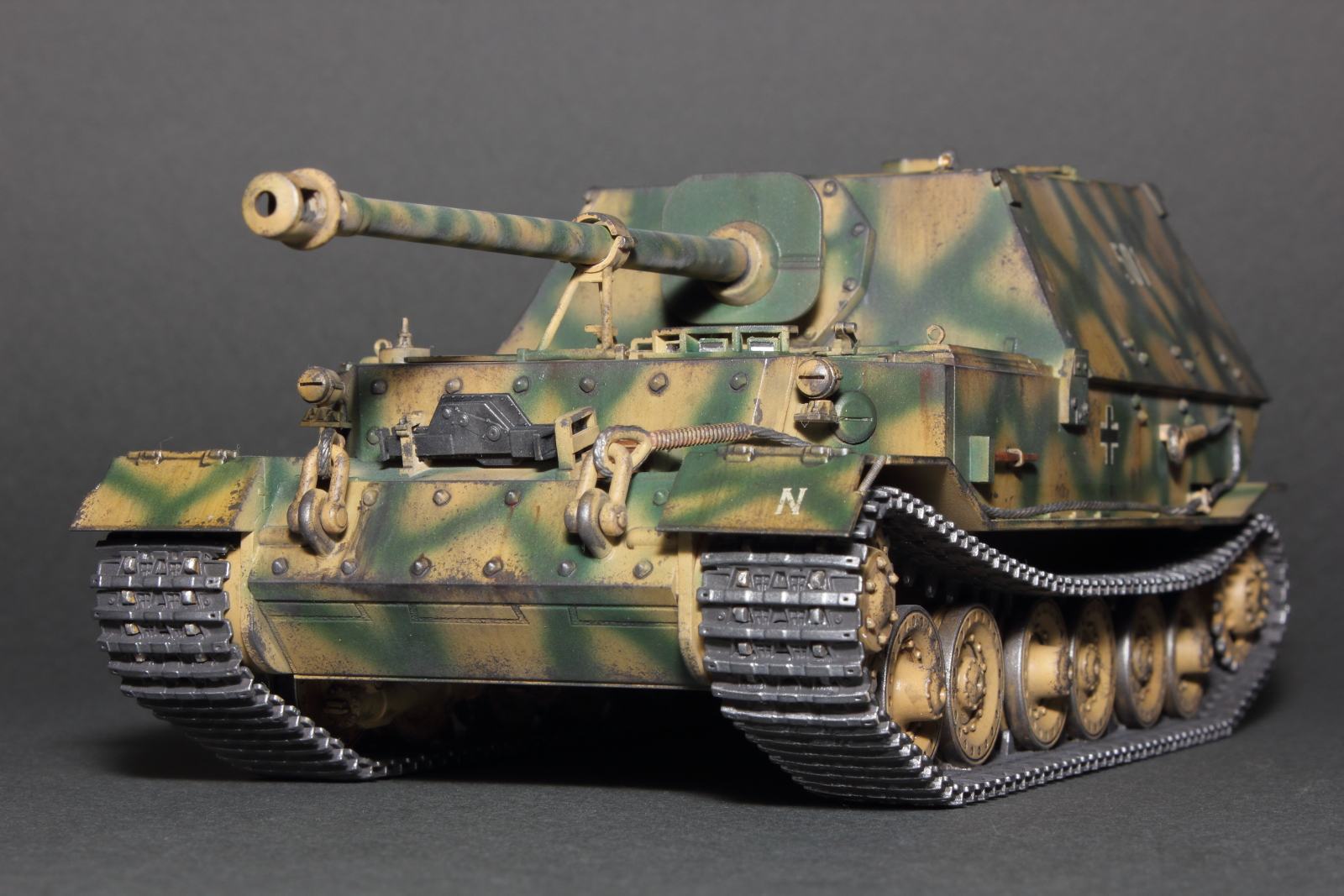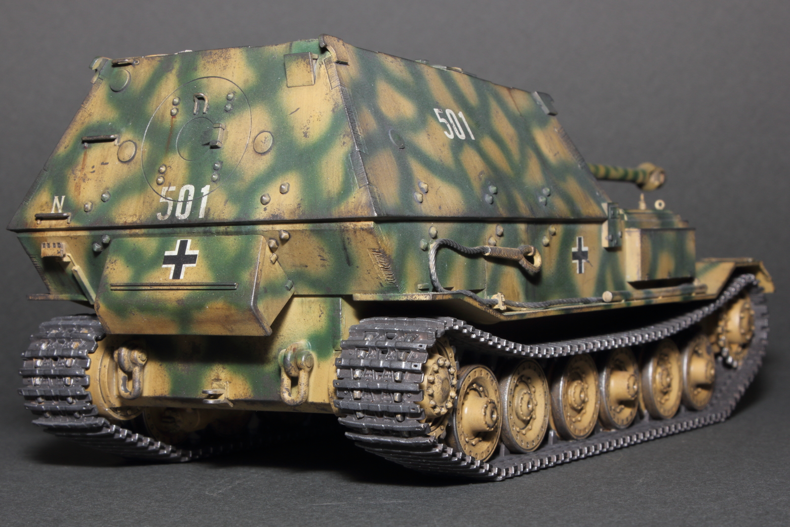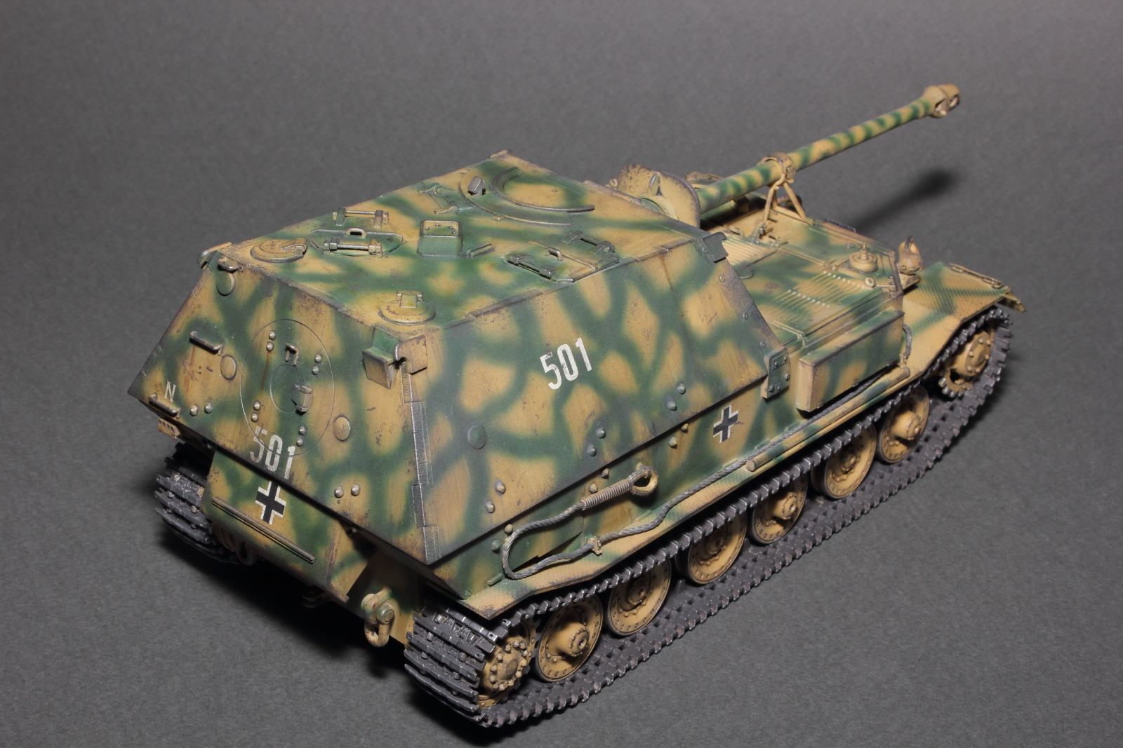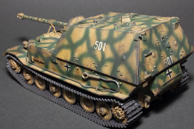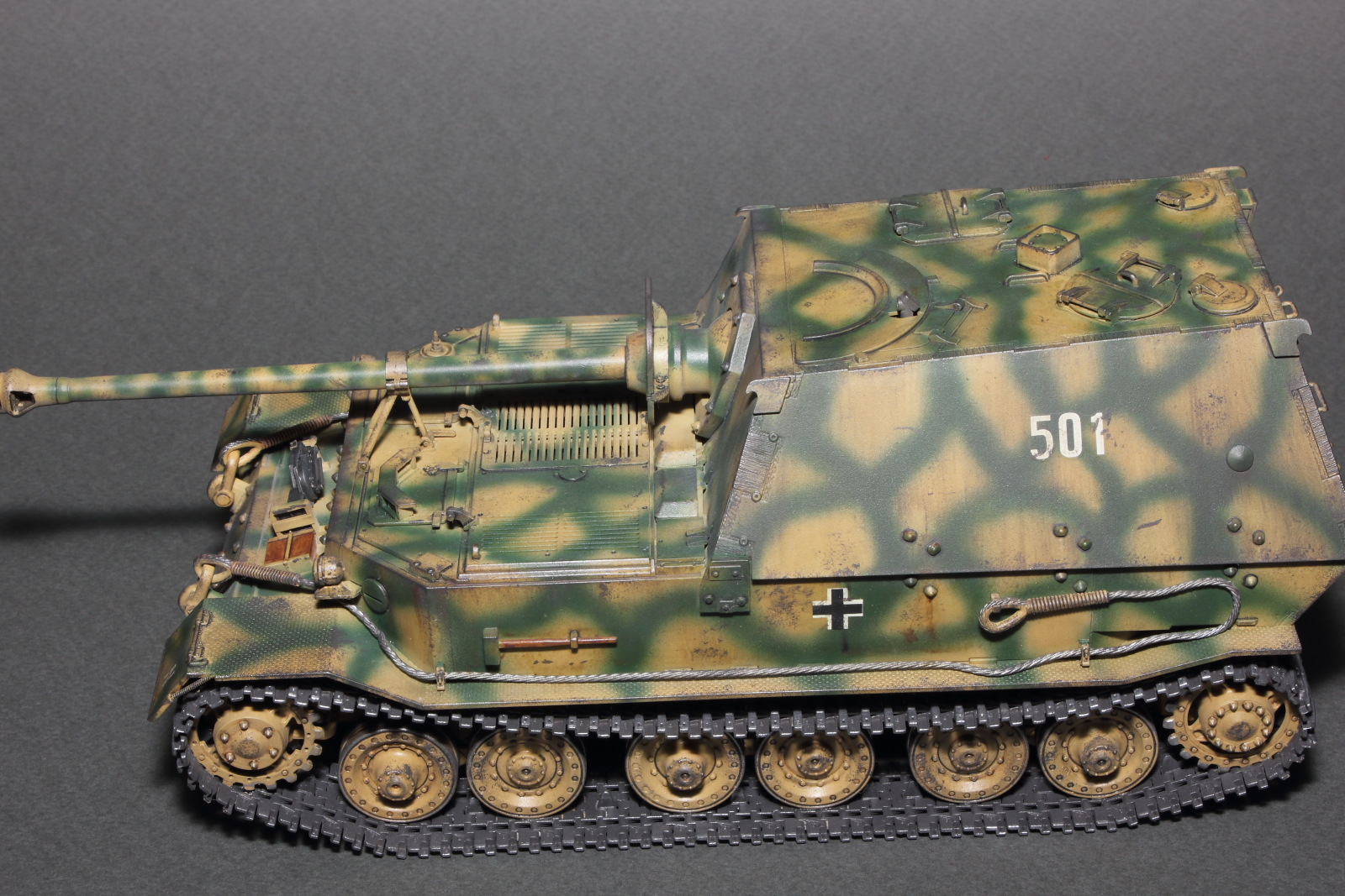 За основу взята всем известная машина под номером 501 из 654 батальона тяжёлых истребителей танков, та самая, что теперь стоит в Патриоте в Кубинке. Уж очень мне хотелось такую после личного, так сказать, знакомства. Полного соответствия прототипу нет, так как всё равно не получилось срисовать с фотографий оригинальный камуфляж. Скорее эта модель по мотивам реального борта. Модель полностью искоробочная кроме сетки на корму, её поставил металлическую. Ещё добавил резку бронеплит на торцах. Возникли проблемы с траками. они оказались сильно натянуты и висели над катками, пришлось прижимать. Вроде бы делал по инструкции (за исключением того, что гусеничную ленту собрал отдельно и ставил в конце работы). Такая проблема возникла с обеих сторон. Может я где-то и что-то напутал. В покраске использовал акрил от "Tamiya" и "Мастер-акрил" от "Звезды" для мелочей, масло "Сонет" и химию от "A-model".