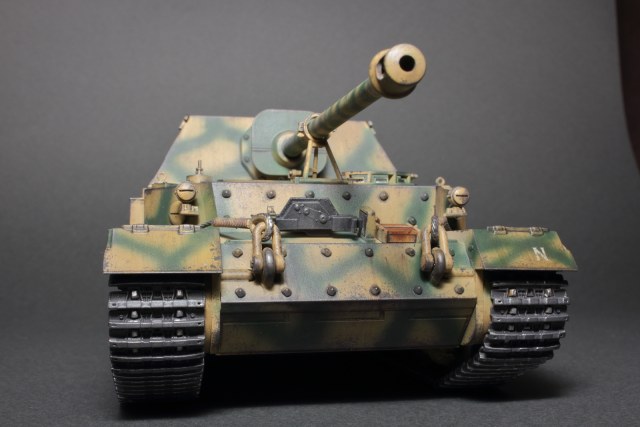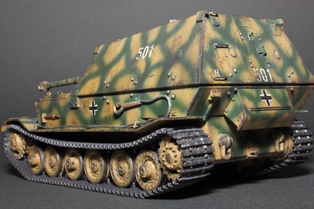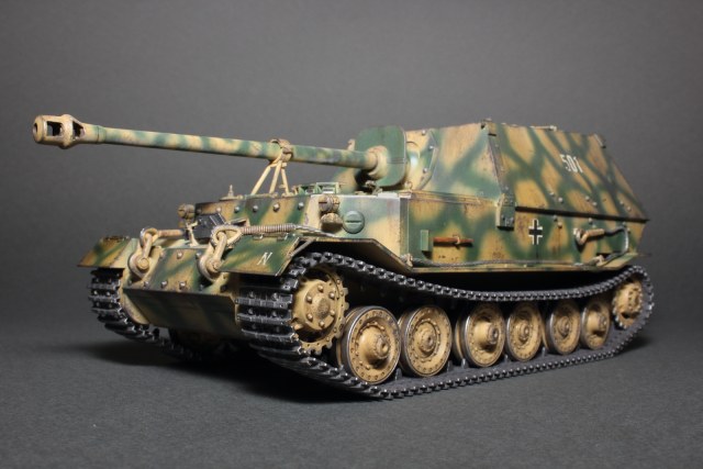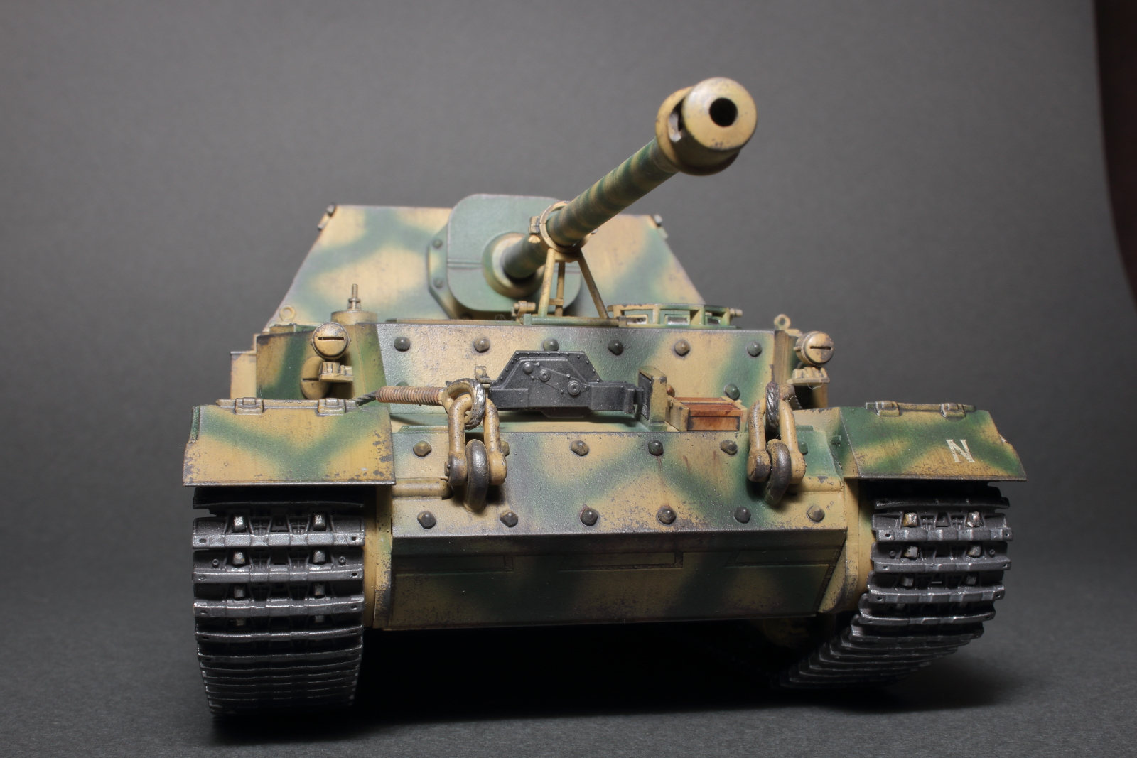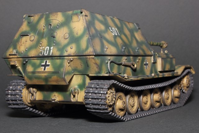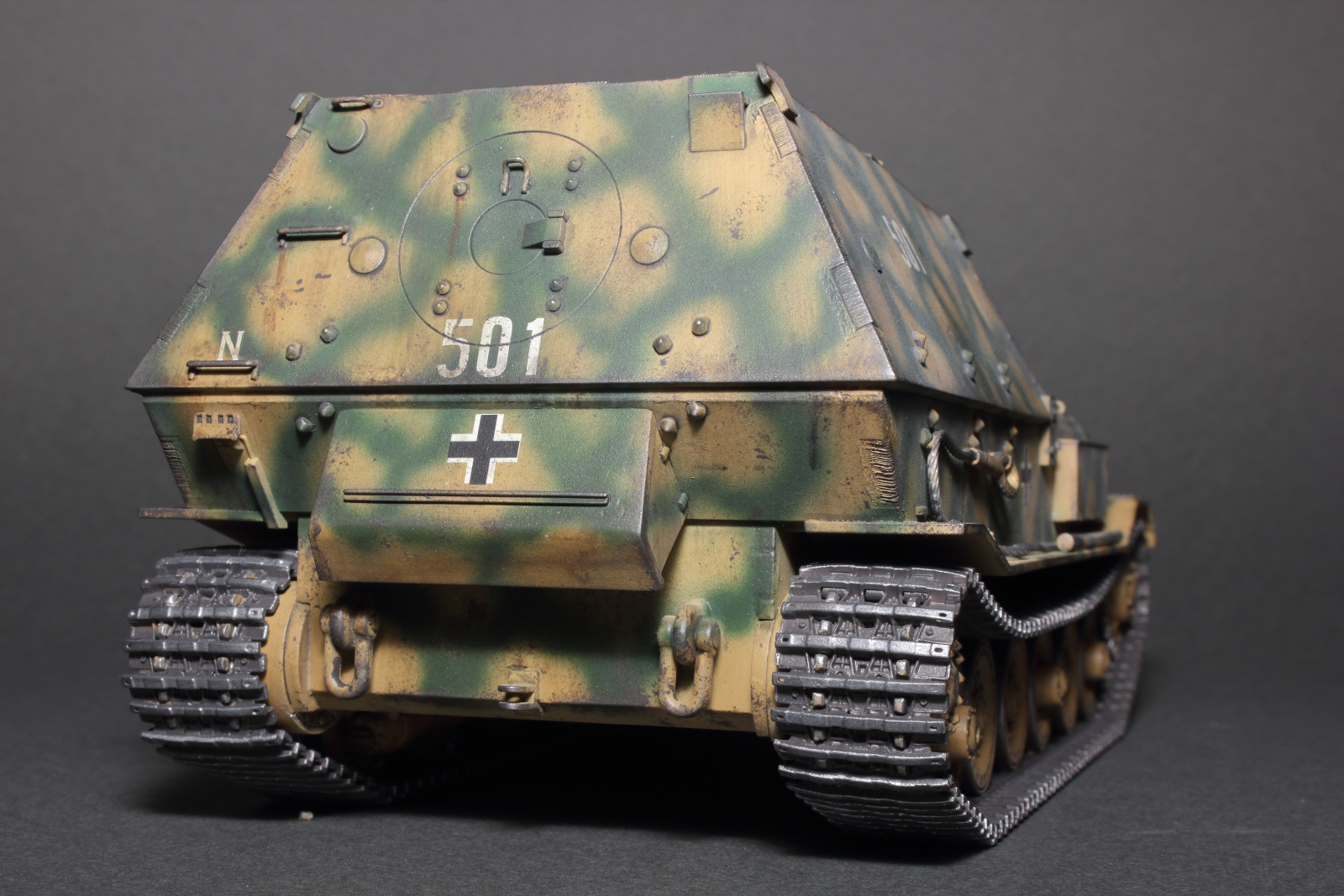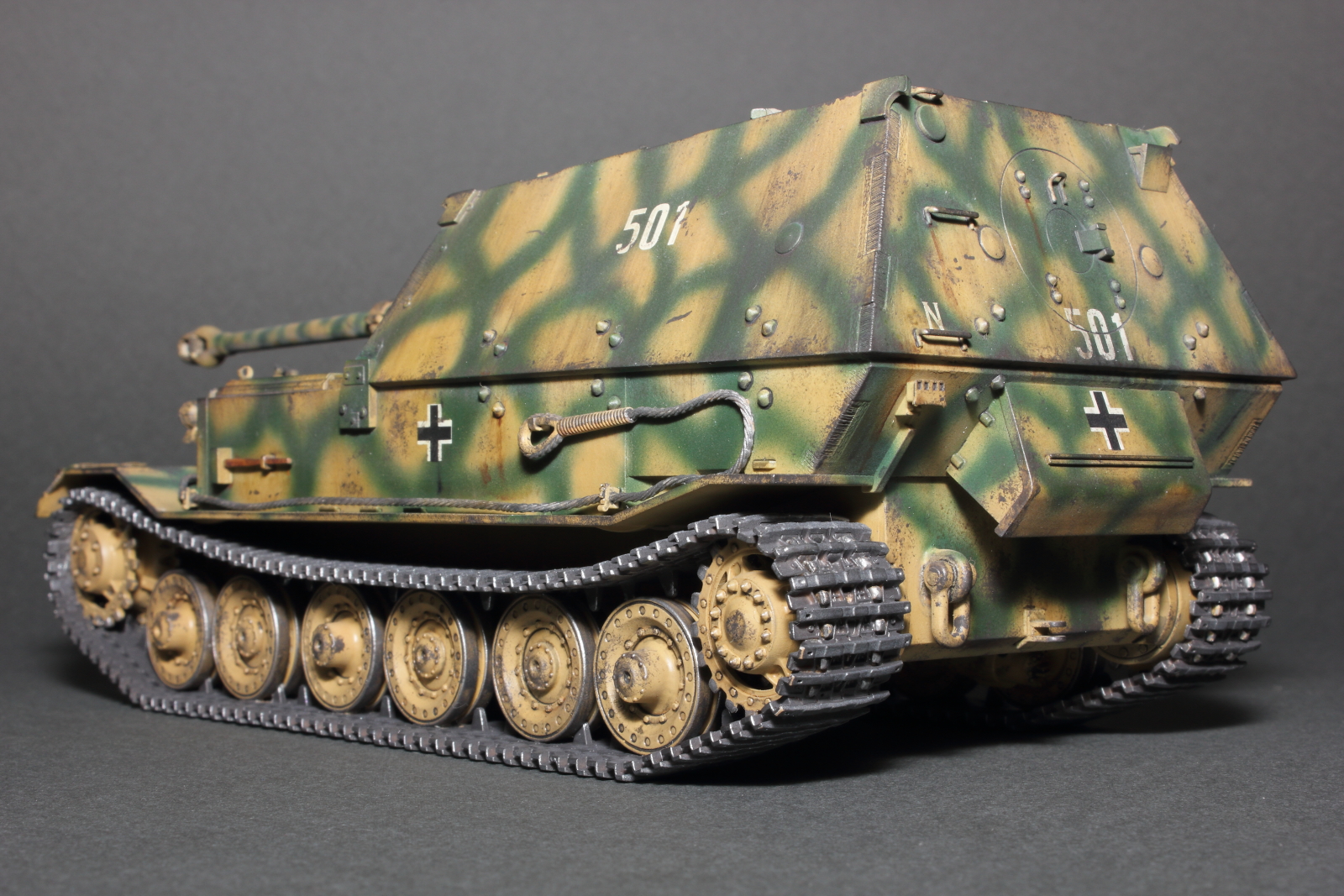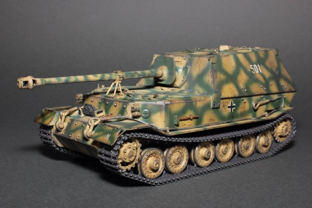 За основу взята всем известная машина под номером 501 из 654 батальона тяжёлых истребителей танков, та самая, что теперь стоит в Патриоте в Кубинке. Уж очень мне хотелось такую после личного, так сказать, знакомства. Полного соответствия прототипу нет, так как всё равно не получилось срисовать с фотографий оригинальный камуфляж. Скорее эта модель по мотивам реального борта. Модель полностью искоробочная кроме сетки на корму, её поставил металлическую. Ещё добавил резку бронеплит на торцах. Возникли проблемы с траками. они оказались сильно натянуты и висели над катками, пришлось прижимать. Вроде бы делал по инструкции (за исключением того, что гусеничную ленту собрал отдельно и ставил в конце работы). Такая проблема возникла с обеих сторон. Может я где-то и что-то напутал. В покраске использовал акрил от "Tamiya" и "Мастер-акрил" от "Звезды" для мелочей, масло "Сонет" и химию от "A-model".
