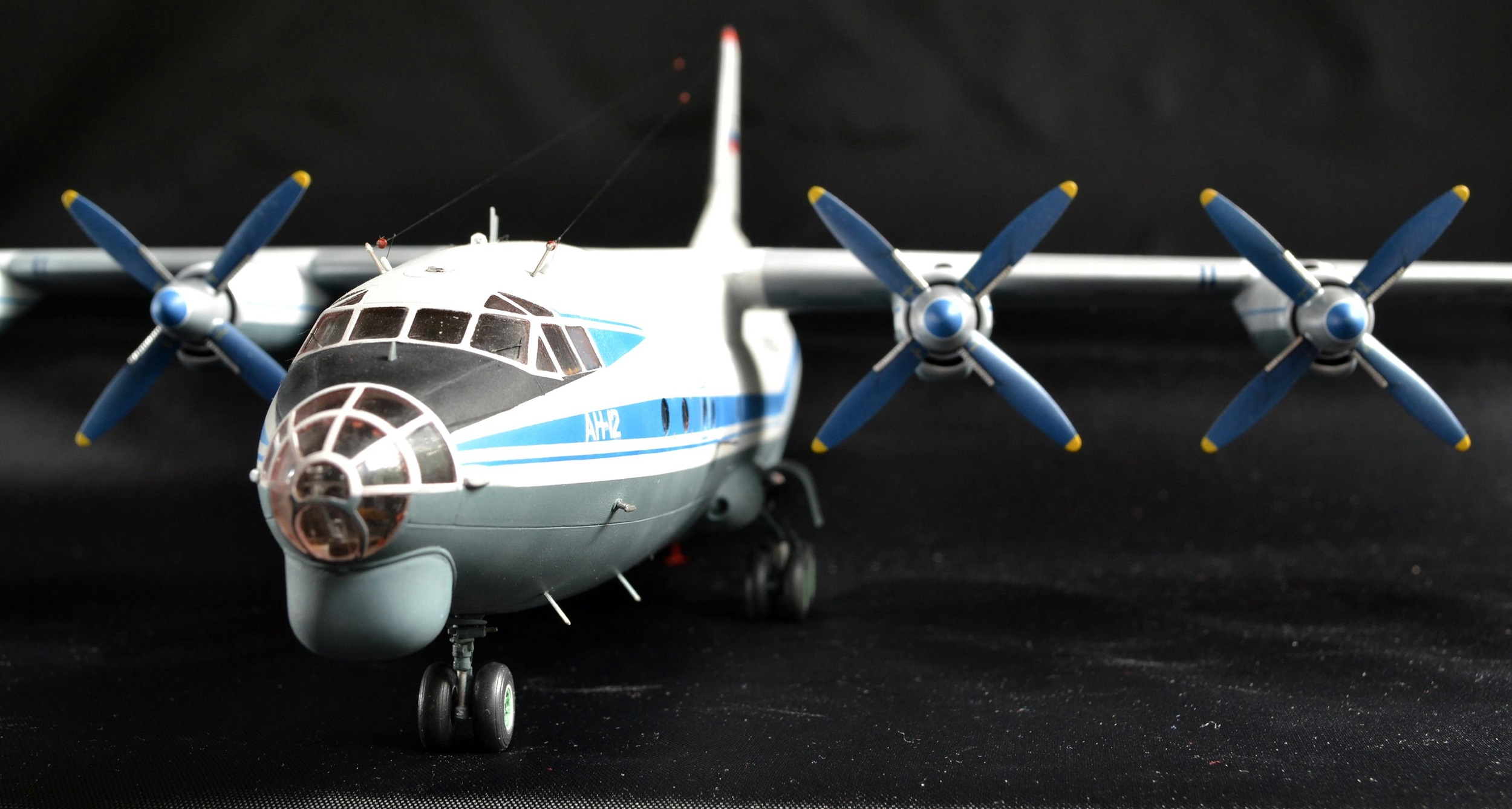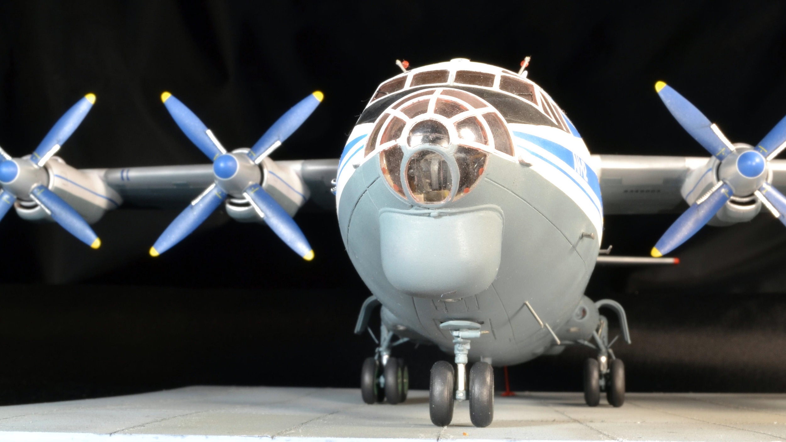 Теперь касательно сборки. Процентов 80 собралось быстро, на одном дыхании, тем более, что весь апрель (2020 г.), как и многие просидел на самоизоляции из-за вируса. После выхода на работу оставшийся процесс растянулся где-то на 2 месяца, т.к. возможность позаниматься осталась только по выходным. Насчет внутренностей практически не заморачивался - лишь необходимый минимум, все равно ничего не видно снаружи. Попытался нагрузить переднюю часть, но все равно не рассчитал вес, видимо боялся, что не выдержат стойки, так что пришлось доделывать подпорочный козелок (благо дело, на настоящем самолете их тоже используют), а стойки все равно несколько раз подламывались, устал подклеивать)) Никакого афтермаркета не использовал - все "изкаропки". Немножко поколдовал над нишами шасси - сделал перегородки, ориентируясь по фотографиям. Также добавил подобие гидропроводов и пару пружин. Правда, ни леска, ни проволока ну никак не хотели держаться на месте, пришлось использовать обычную нитку. Невооруженным глазом незаметно, а вот на макро предательски бросается в глаза... Тросы антенн - леска 0,07мм, конусы на них - пластик из под "доширака". Краски использовал от "Pacific Company". Полосы - небесно-синий (0254) Надо было чуть потемнее сделать, но думал, что после лака совсем темный станет. Однако, цвет как-то заметно не поменялся. Нижняя часть - к голубому среднему (0267) на глаз подмешивал серый средний (0210). Вроде попал)). Лопасти - чуть затемненный королевский синий (0258). На фото цвет гуляет, уходит в какой-то голубоватый. Диски - мешал на глаз голубой и желтый. Пневматики - старые шины (0006). Далее лак, декали, смывка. Декали частично из набора (очень хрупкие, но другой альтернативы не было), частично из старых запасов (в основном бегемотовские). Смывка - тот же акрил с водой, плюс капелька "фэйри". Кое-где на крыльях попытался сымитировать потеки (кое-где их даже заметно на фотографиях)). После чего - полуматовый лак. В завершении фотосессия. Что получилось, то получилось)) Спасибо за внимание и приятного просмотра!