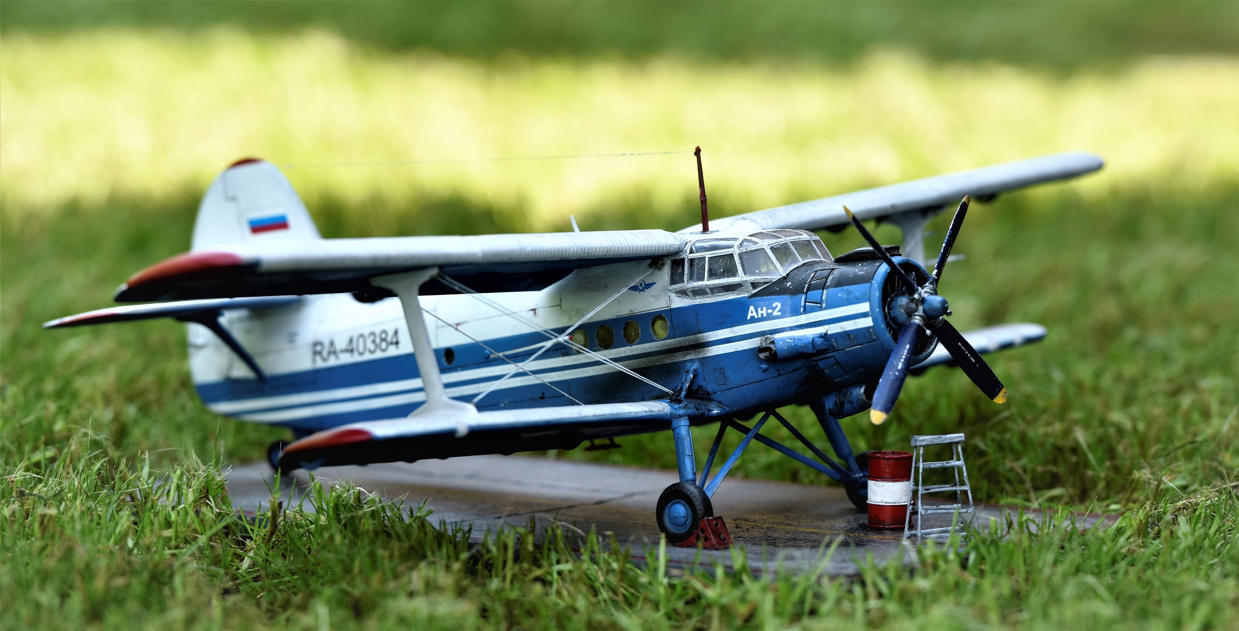 Впервые выставляю модель на обозрение. Первый опыт работы с диорамой. Решил как то, собрать Ан-2 в 48-ом масштабе. Выбирал между моделями от Хобби босс и Валом. Остановил свой выбор на Ан-2 от Валом. Подкупила расшивка, а именно наличие клепки на фюзеляже. При заказе указал примечание, чтоб модель была из новой партии с новым фонарем, т.к в предыдущих версиях фонарь был "приплюснутый". Литьё хорошее, но стыковка литников ужасная, половинки фюзеляжа были кривые, пришлось изгибать в горячей воде. Доставило хлопот, установка верхних крыльев. Задняя хвостовая стойка шасси отдаленно напоминает оригинал. После того как собрал кокпит, склеил фюзеляж и установил фонарь, заклеив его масками, приступил к установке верхних крыльев, пришлось активно поработать надфилем, пыльца пластика от работы частично попала в кокпит через внутренние щели, что потом выяснилась после окраски и снятия масок с фонаря. В итоге некоторый пластик так и остался на остекленение изнутри. Щели при установке крыльев достигали 1-2 мм в районе центроплана. Но все зашпаклевав и отшкурив (на это ушло 3 дня), результатом остался доволен. Выпустил закрылки на 15 градусов. Расчалки из лески 0,5 мм. Натягивал паяльником. Далее стандартно, грунтовка, покрытие металликом в районе СУ, центроплана и прочих износных мест, после покраска белой матовой Tamiya, голубой намешал из белой и синей все той же Tamiya. Смывка Tamiya. Подтеки масла -эффект от Organic Effects . После задул матовым лаком. Заказал декали у Алексея Бацких, за что ему очень благодарен. Трафареты бортовых номеров и маски от KV Models. Из допов заказал двигатель от Amigo Model с потрясающей деталировкой. Дополнительно стояночные колодки от них же. Применил набор от ICM в 48 масштабе-наземный персонал- из которого позаимствовал бочку из под масла. Стойки для стремянки из иголок шприца, ступеньки из вытянутого литника. Для стоянки использовал лист фанеры, на который наклеил лист плотного картона 1,5 мм. окрасил краской, выдавил трещину в бетоне и "разлил масло".