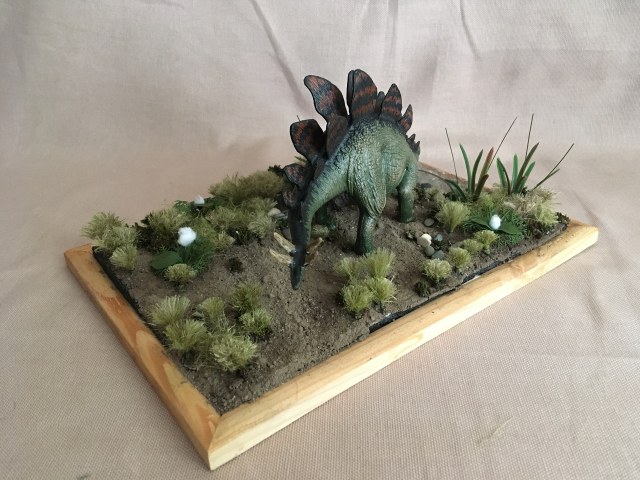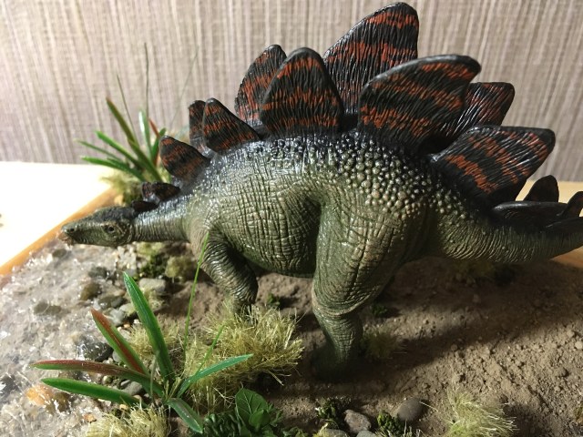 Всегда приятно видеть модели и диорамы на палеонтологическую тематику! Работа очень понравилась, исходник фигурки динозавра примерно представляю, и перекрас явно удался. Позвольте только заметить один нюанс: я не очень хорош именно в палеоботанике, но как мне помнится, в эпоху Юрского периода, когда жил стегозавр, ещё не было ни травы, ни растений с подобным строением листьев.