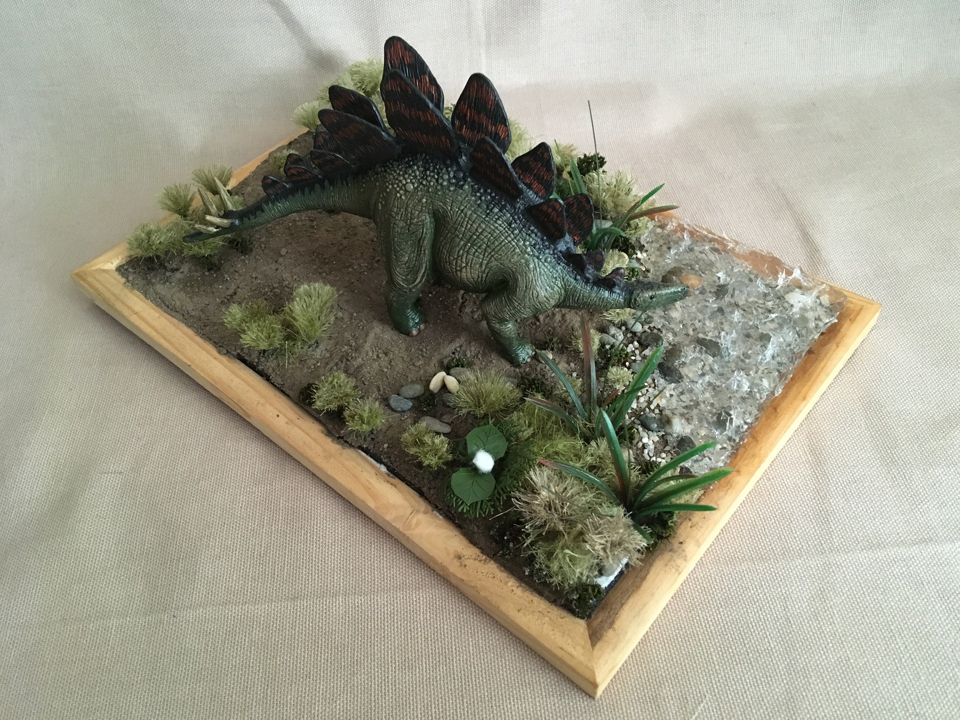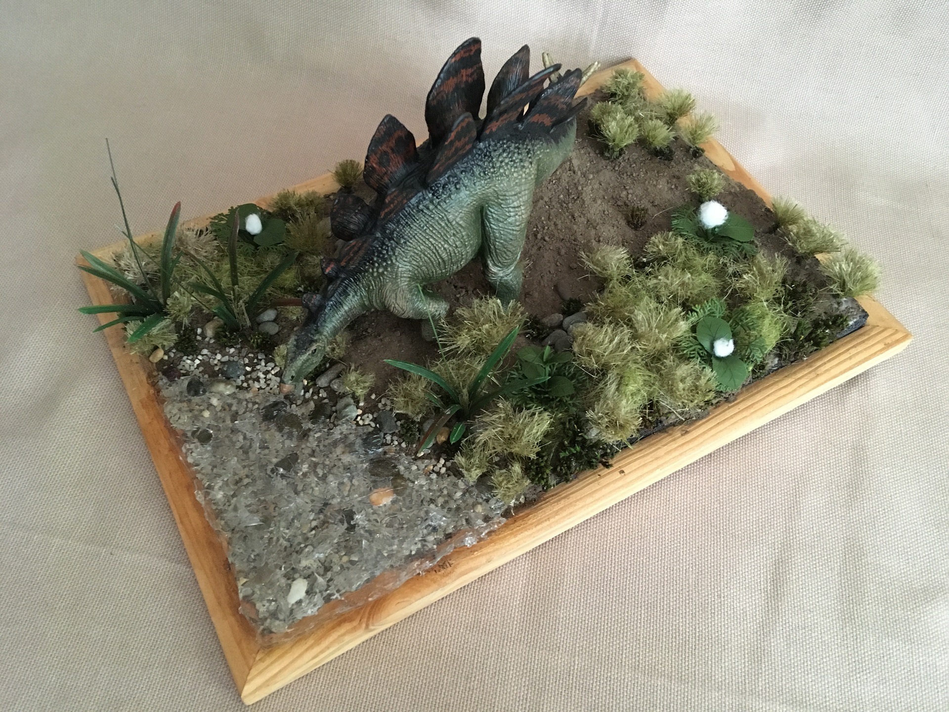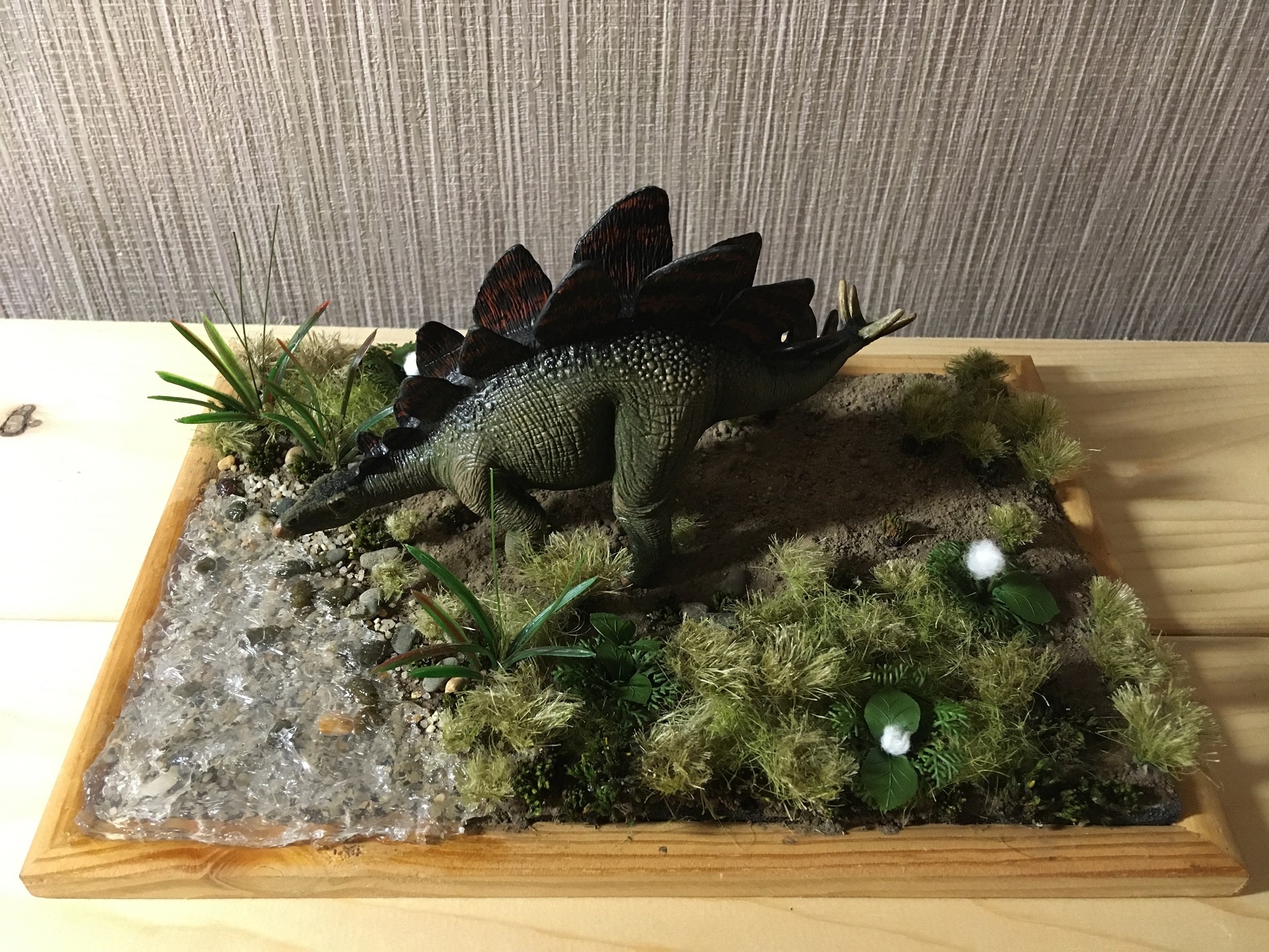 Это относительно недавний проект. Главной темой, сюжетом так сказать решил сделать мезозойскую эпоху. Дань любви детства динозавры) Увидел в магазине неплохие экземпляры игрушек и выбрал именно его, жутко разукрашенного китайского стегозаврика)) принес домой и полностью перекрасил, покрыл лаком и начал делать под него диораму.