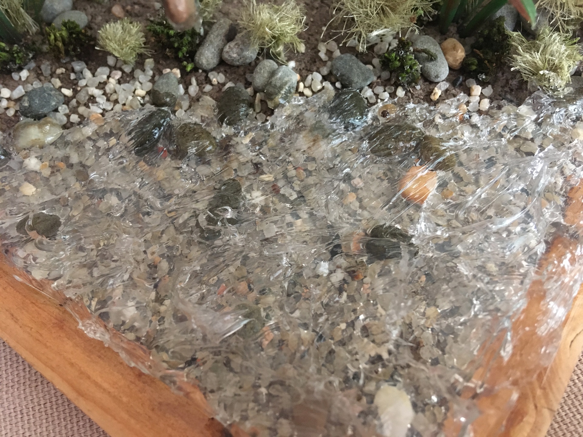 Делал все из подручных средств, поэтому не судите строго. Камушки и песчаник взял из грунта для аквариума. Основу взял из песка и размельченной земли, все приклеил тонким слоем на ПВХ клей в рамку. Траву сделал из окрашенного акрилом строительного льна, а также тех же декораций из аквариума) все покрашено. Воду хотел выполнить прозрачной, тонким слоем как русло маленькой реки. Сделал из прозрачного герметика.