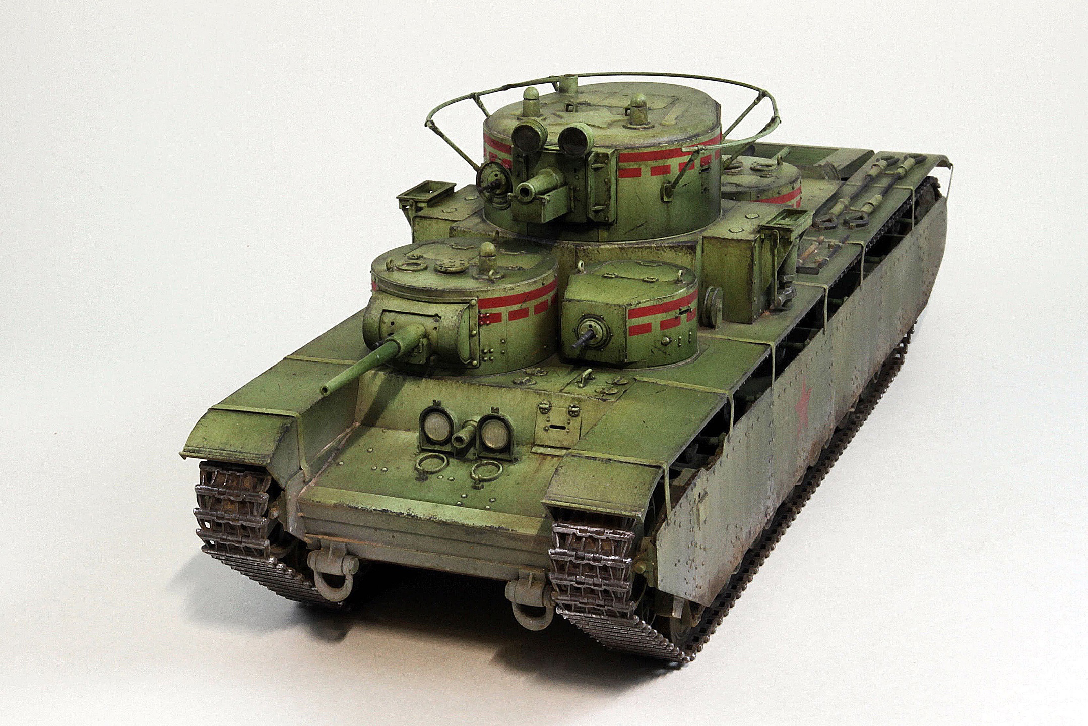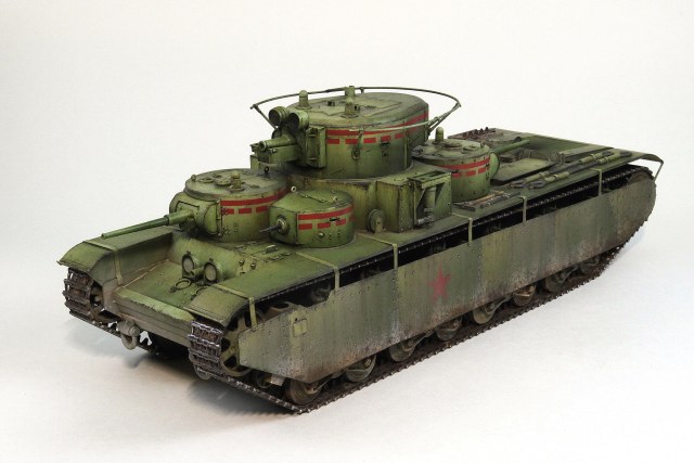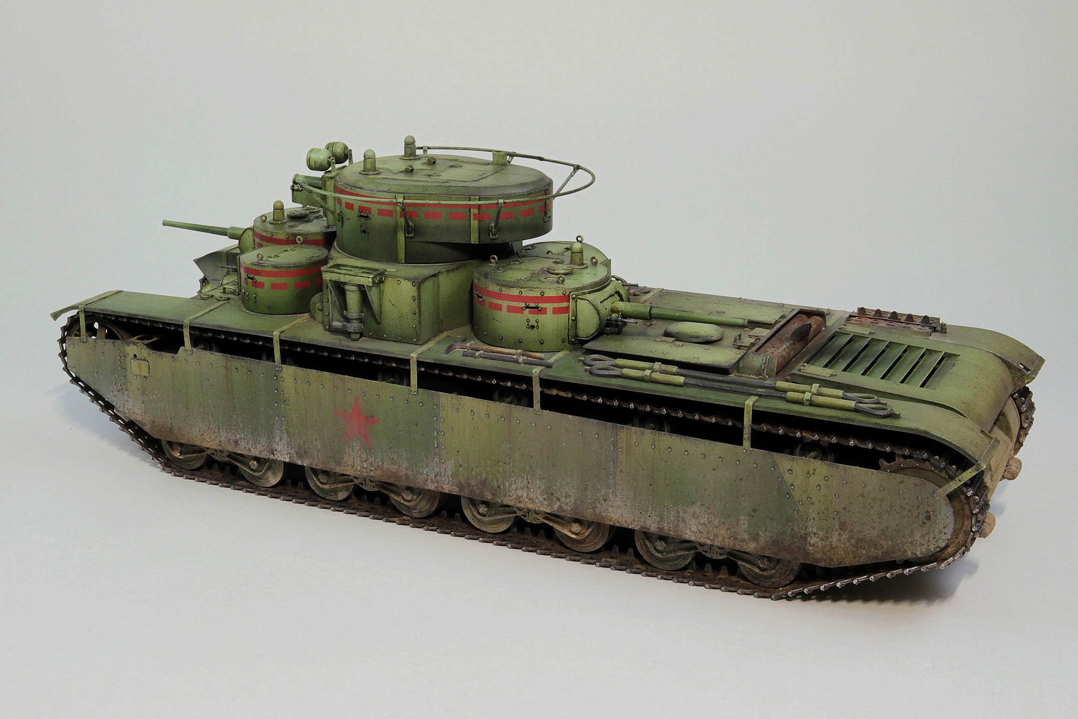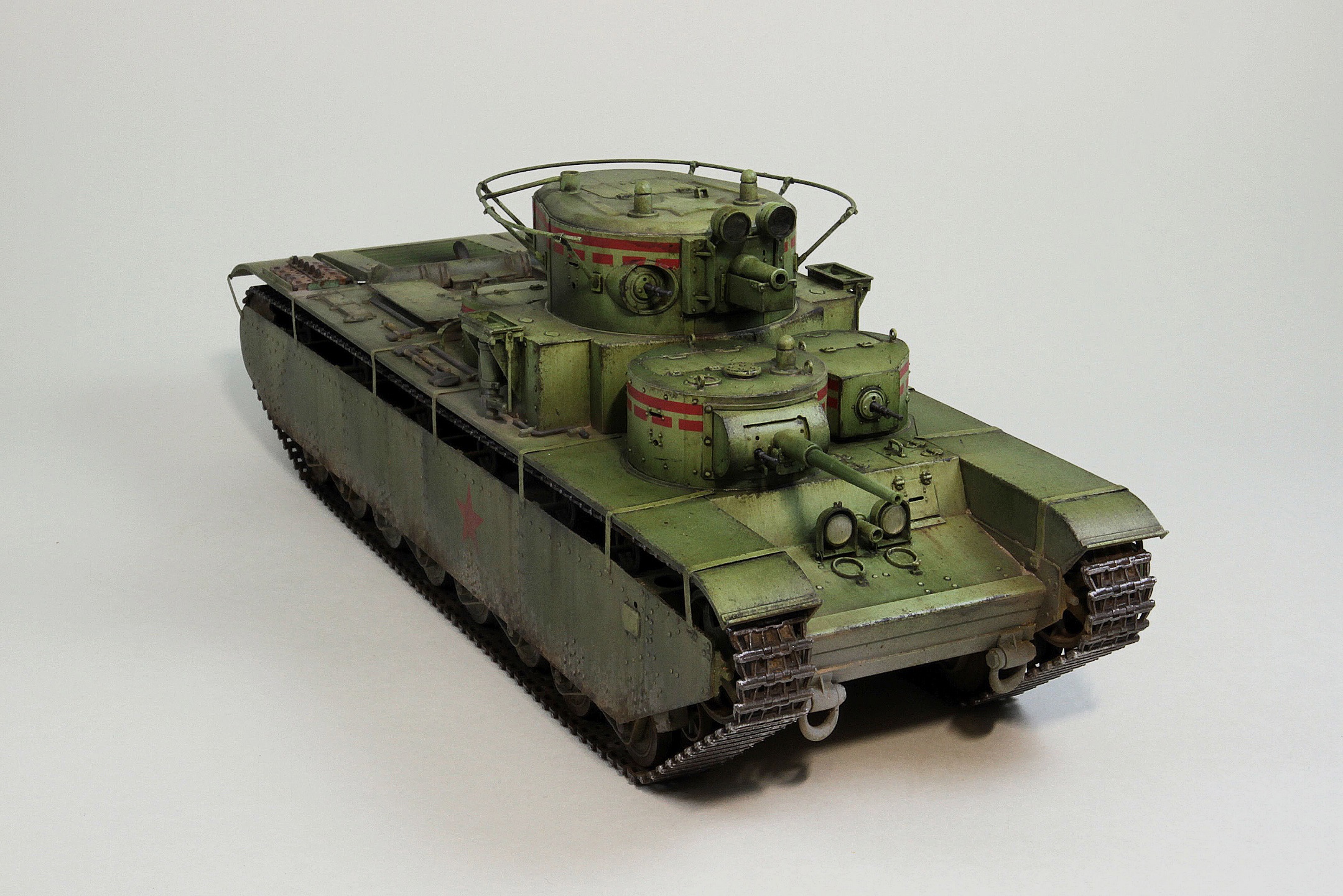 Несмотря на то, что Т-35 в основном ассоциируется с парадами на Красной площади, этот танк все же принимал участие в учениях, а также воевал в начале войны. Поэтому с "чистой совестью" решил сделать танк с ярко выраженными следами эксплуатации (привет испанской школе). За материальную часть вообще не в курсе, сделал обычную из коробку. Базу покрасил Mr.Color 135 (русский зеленый (1)). Затем модуляция, масло и везеринг химией от Ammo MiG, пигменты.