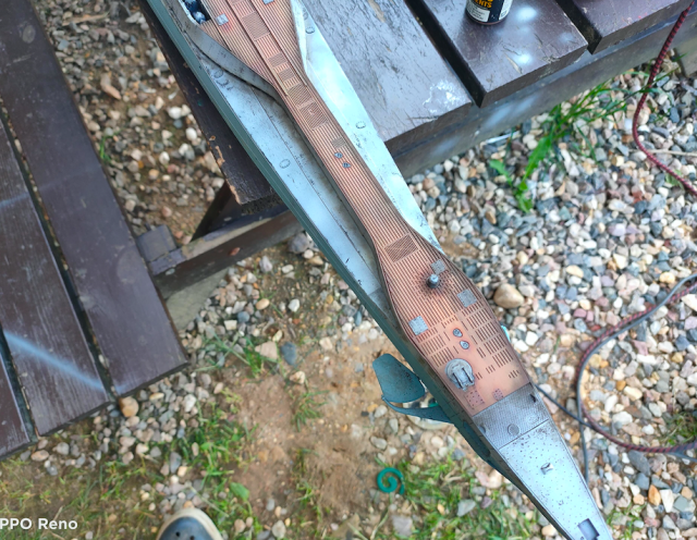 Очень хотел добиться эффекта коррозии, белых пятен и всего такого, но поздно понял как это делать. Как надо было: красим светло-серым, далее задуваем чипинг, далее основной цвет и СРАЗУ же смываем водой и пальцем.