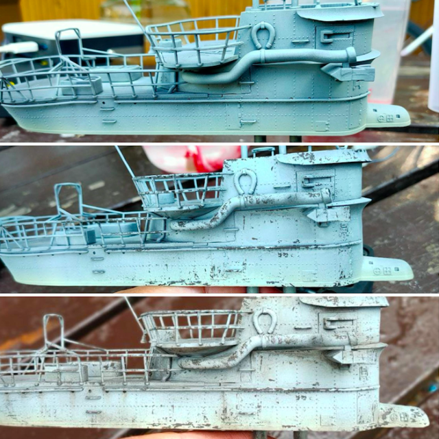 Идея с палубой понятна, но к образу боевой потрепанной походом субмарины не подходит, хотя покраска и эффекты очень хороши. Лодки ведь не просто так красили в определённые цвета, светлая палуба - демаскирующий фактор.