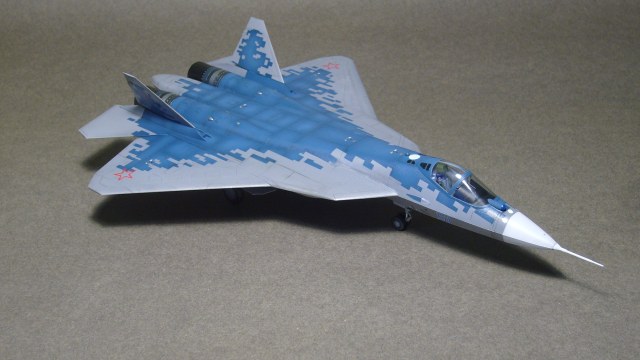Модель российского истребителя пятого поколения Су-57 в масштабе 1/72. Собирал старый набор звезды, неплохой в сборке, на ощупь на поверхности чуть шершавый, необходимо слегка пройтись мелкой шкуркой с водой иначе при покраске и смывке могут возникнуть проблемы. Красил акрилами от Тамии, мешал на глаз ориентируясь на фто, лакировал мр.хобби, мелочи красил кистью акрилом от валлехо и арма колорс, смывка от аммо миг темно коричневая. Для создания пиксельного камуфляжа использовал маски от арма-моделс. Привязки к конкретному борту нет, декали из коробки.