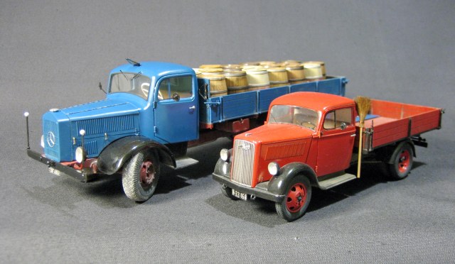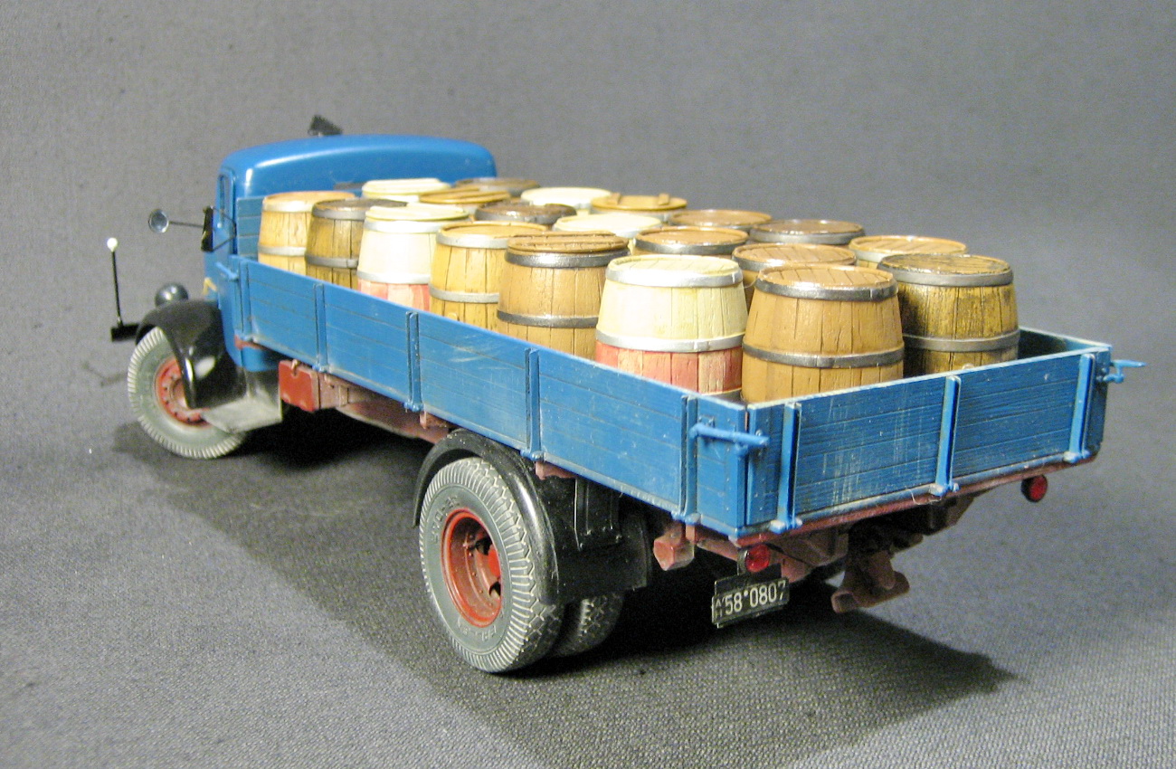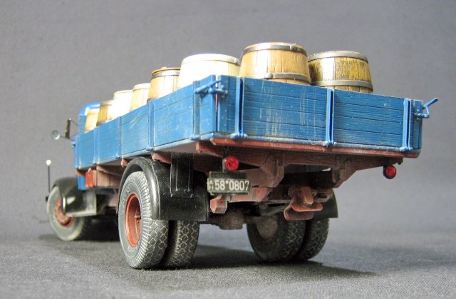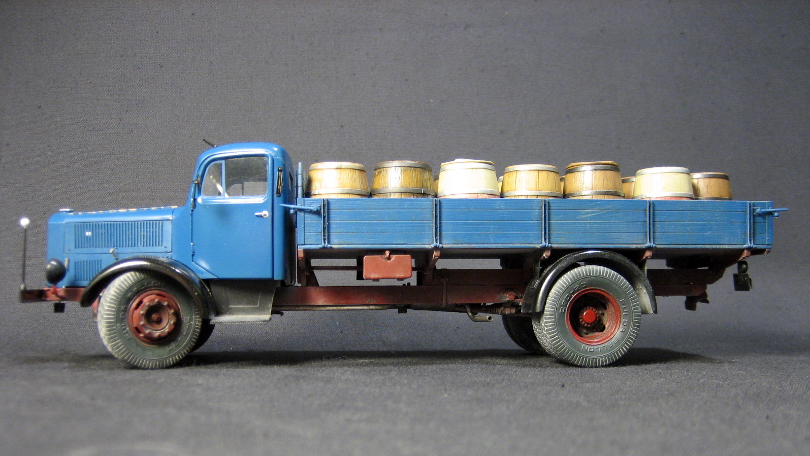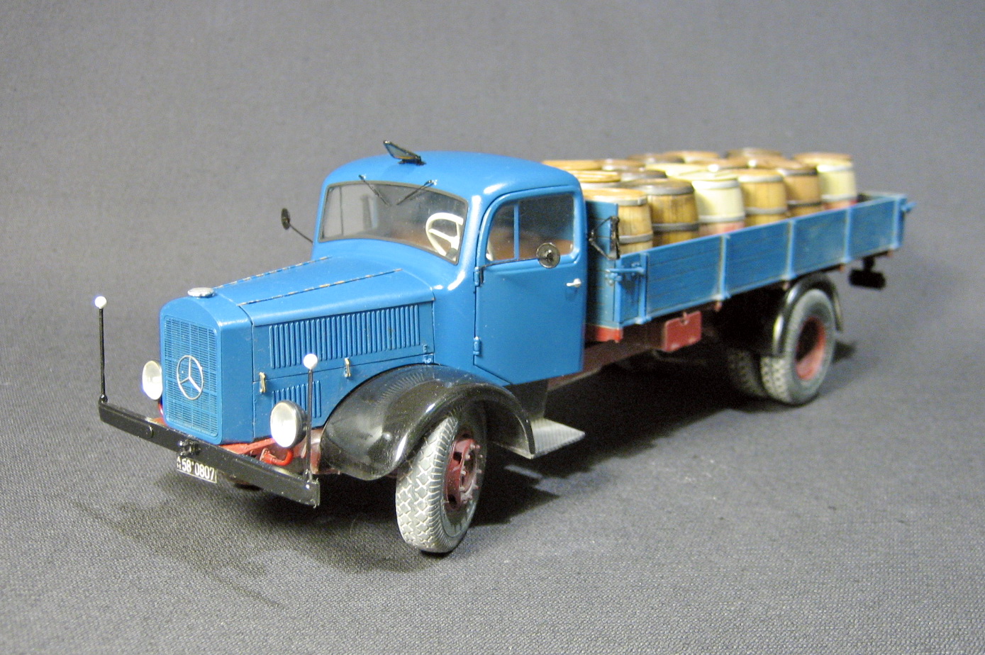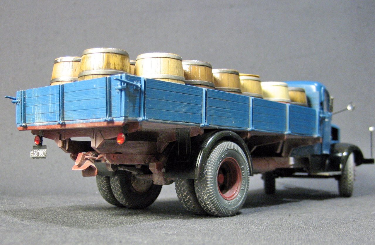 Итак, модель от Звезды. Строить из коробки, вояку, не хотел изначально. Опять же Мерс от В.Яшина перед глазами. И в то время ,как-то пошли эти Мерины, ну прям "косяком" и сплошь Сине-красные! Выбрал немного другой прототип. Хоть и синий, но крылья чёрные! Немного отличается. Бампер широкий и , самое главное, руль-БЕЛЫЙ!!! Другая приборка... Прикупив два набора травла, от Вояджер и Парт,фары Эльф на германский автопром, колёса от Панзер Арт и кучу смоляных бочек, собрал вот такое ЧУДО! Как обычно капот, двери ,кузов, прицепное - рабочие. Красил акрилом от ТАМИЯ, ГАНЗА. Тонировка - ТАМИЯ, МИГ и художественное масло. Пигменты от Адама Вайлдера.