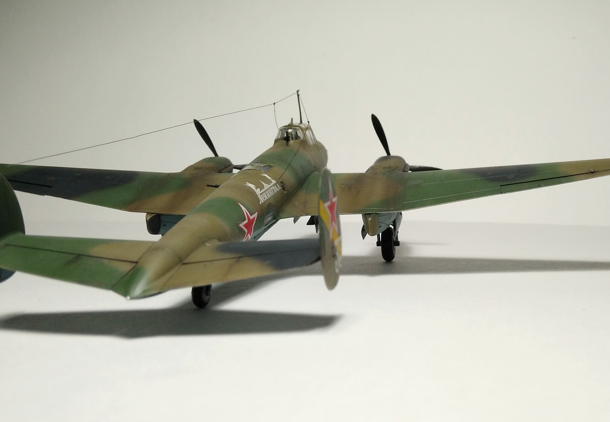 Сборка доставила удовольствие. Хотя пластик у Звезды традиционно мягкий. Старался аккуратнее работать ножом и бокорезами. Все равно раза три ломалась стойка хвостового колеса, пока я её не посадил на иглу (в прямом смысле, благо толщина позволяла). Мягкость аукнулась еще на мачте антенны - после натягивания ниток антенн она решила согнуться, что в итоге выразилось в провисании этих ниток. БСЭЖ как говориться...Много интерьера - но большую часть не видно. Фоткать процесс не стал, многие все это выкладывали тут же. Нижний люк сперва сделал открытым, но он на тонюсеньких рычагах совсем не хотел держаться, поэтому закрыл - экипаж то внутри сидит. Цвета интерьера светло и темно серые, местами зеленый, кое где видно. Камо и декали делал по схемам Звезды. Края камуфляжа сделал размытыми. Надо было и кромку нижнего голубого так же делать, но чет не срослось в голове и сделал четкую границу)... По цветам жду табуреток, не знаю правильно ли подобрал. Цветных фото военного времени так и не обнаружил. Доверился коллегам моделистам и Звезде)...