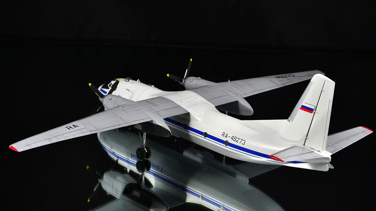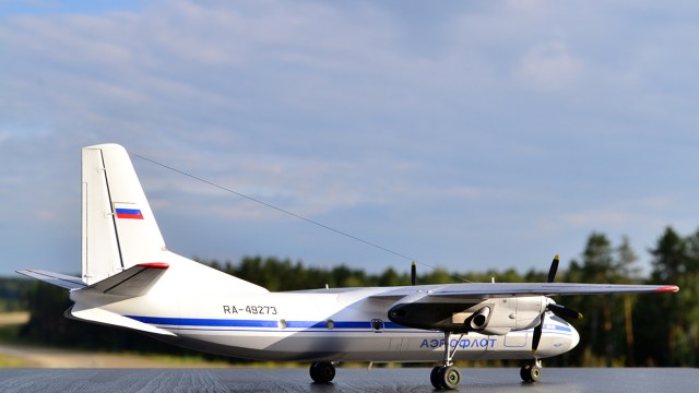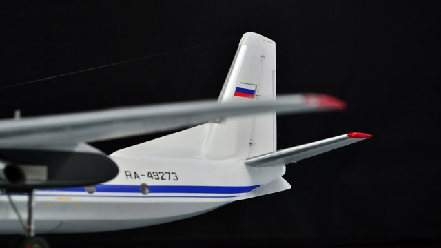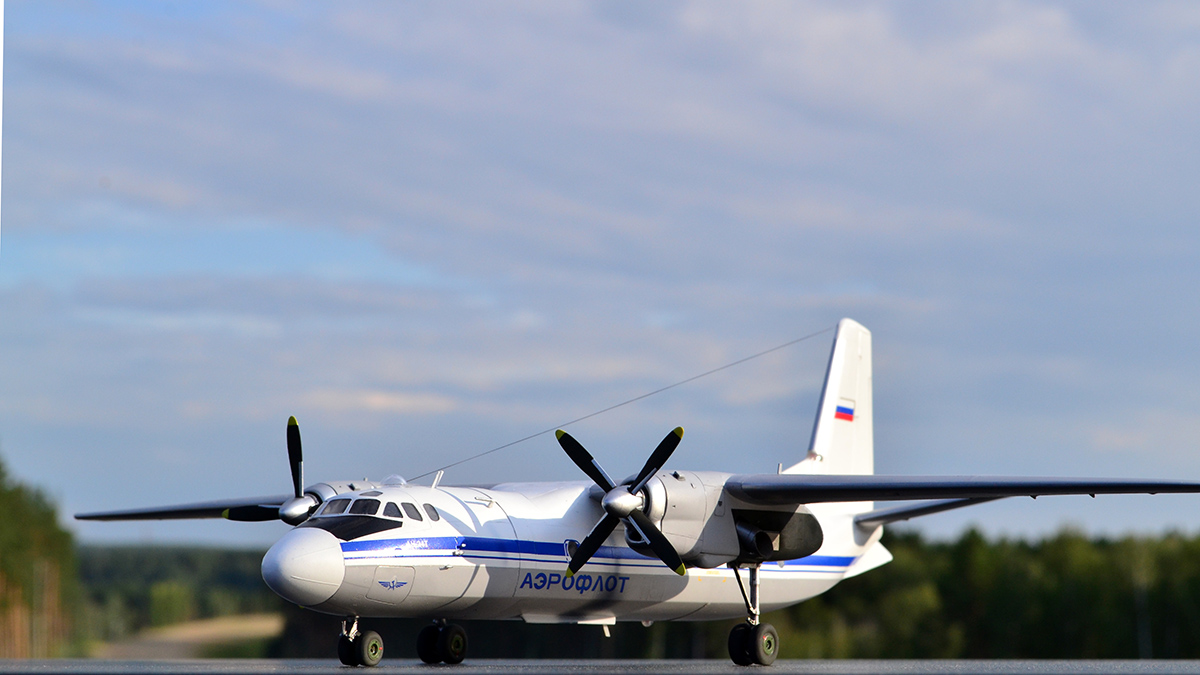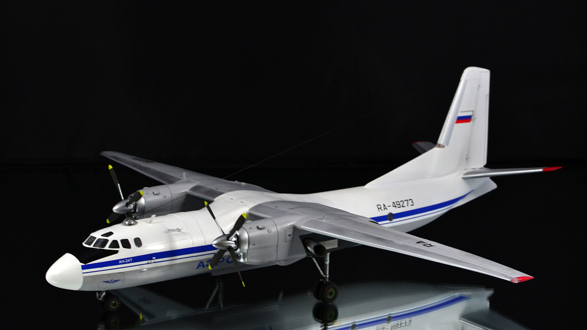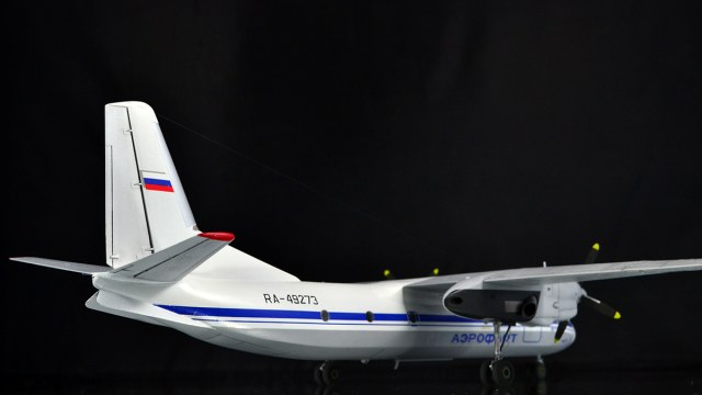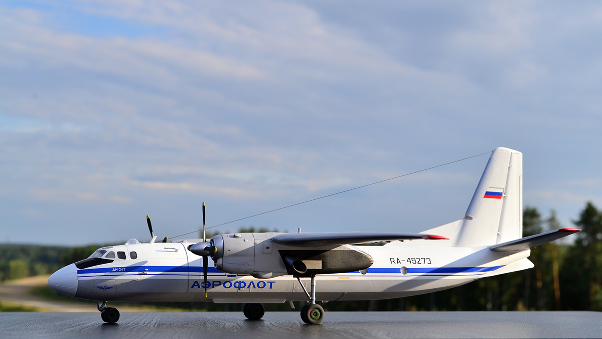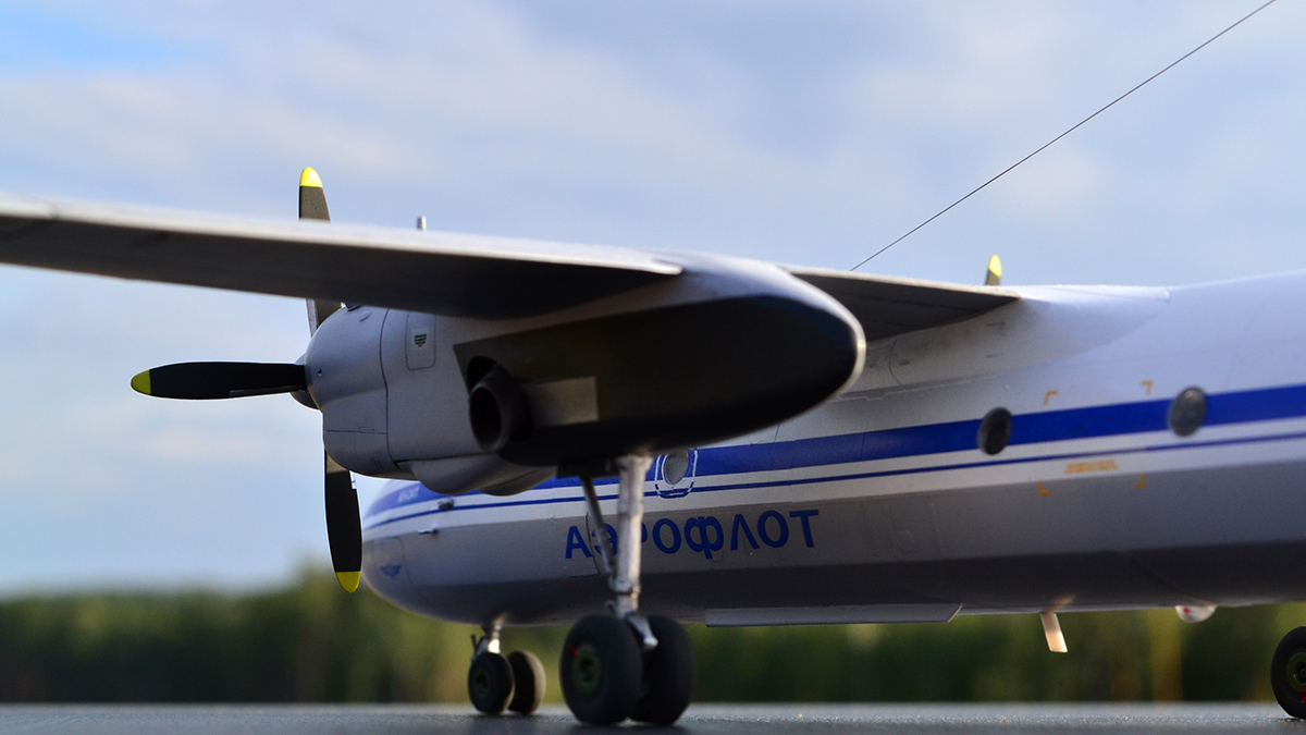 Ничего не переделывал, не перепиливал, никакой гидравлики на стойки не тянул - просто склеил из коробки и покрасил в стоковую ливрею. С тонировкой решил в этот раз особо не усердствовать: коль уж у меня Ил-14 довольно чистый, то и Ан-24 ему в пару должен быть примерно такой же поюзонности. Кстати, что до самого пластика, то набор с Антоновым действительно гораздо лучше и приятнее, чем с Ильюшиным, особенно это на контрасте заметно. По окраске всё традиционно: баллончики, акрил и эмаль от Тамии и Ганзы, финишный лак - полуматовый TS-79, тонировка - простым и косметическим карандашами, тросовая антенна - мононить от Аврора-хобби.