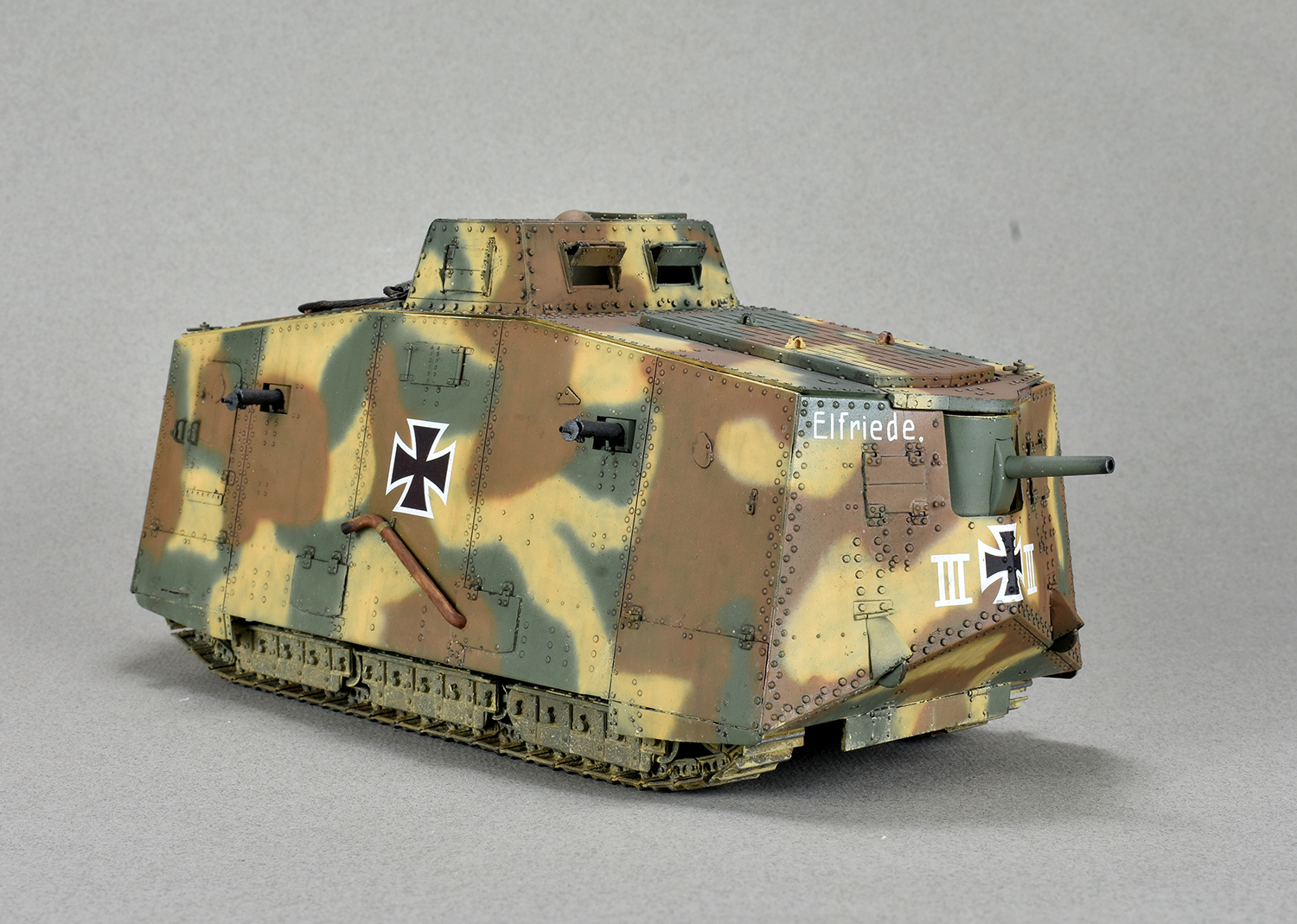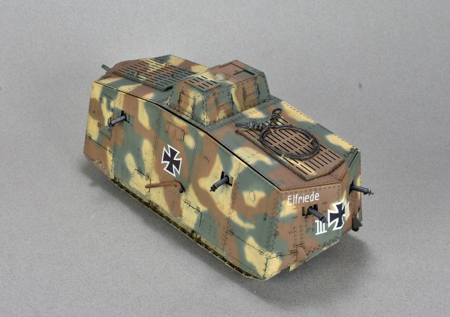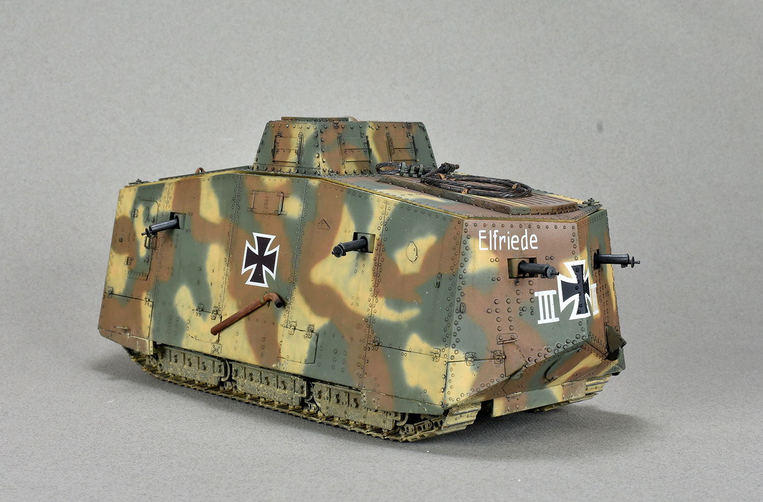 Доброго времени суток. Наконец закончил работу с A7V. Так ка Шнюков и без меня много то решил сделать другую машину с именем Эльфрид. переделал рубку и части экранов ( ну или как они по науке)). Как и ожидал ,в процессе работы обломал стволы пулемётов. Пришлось пытаться делать из игл от шприцов. Цвета мешал из тамии и Ганзы.Большое спасибо Денису Алиханову за помощь с чертежами!!! В общем,что выросло то выросло ))