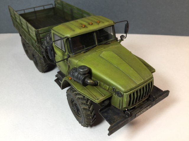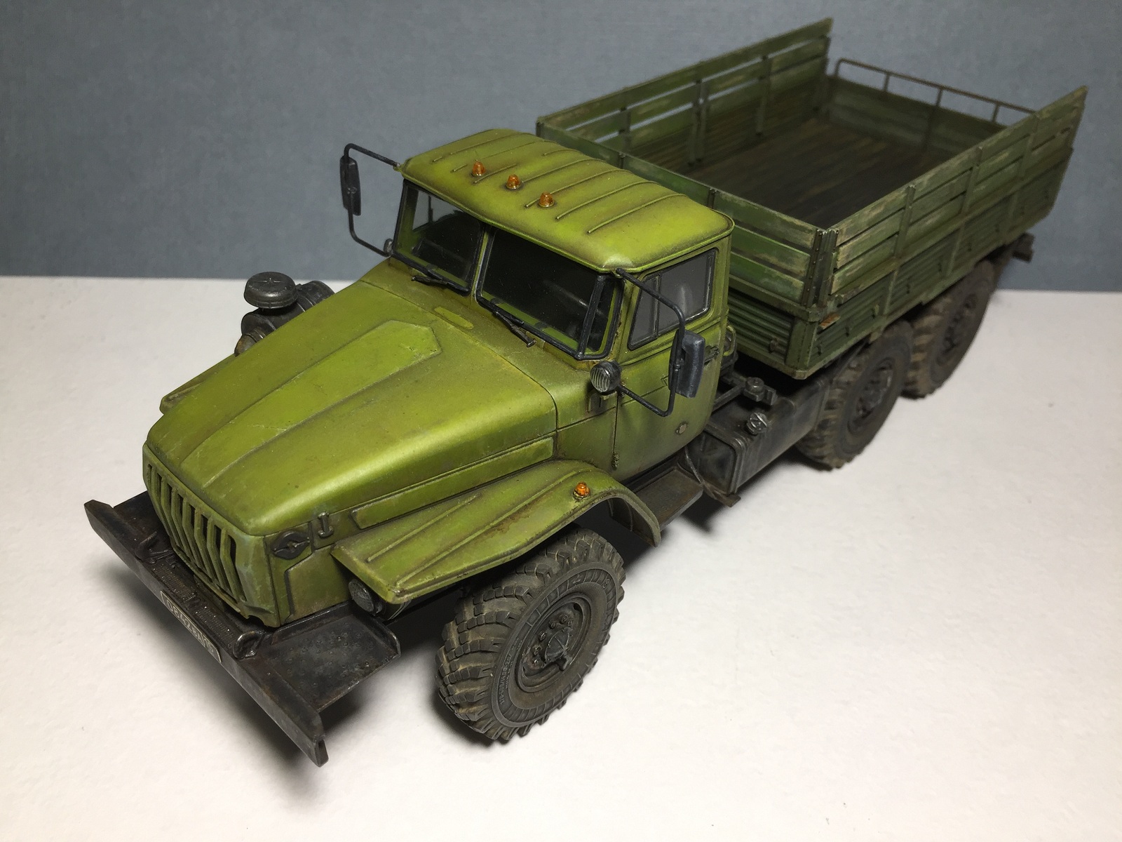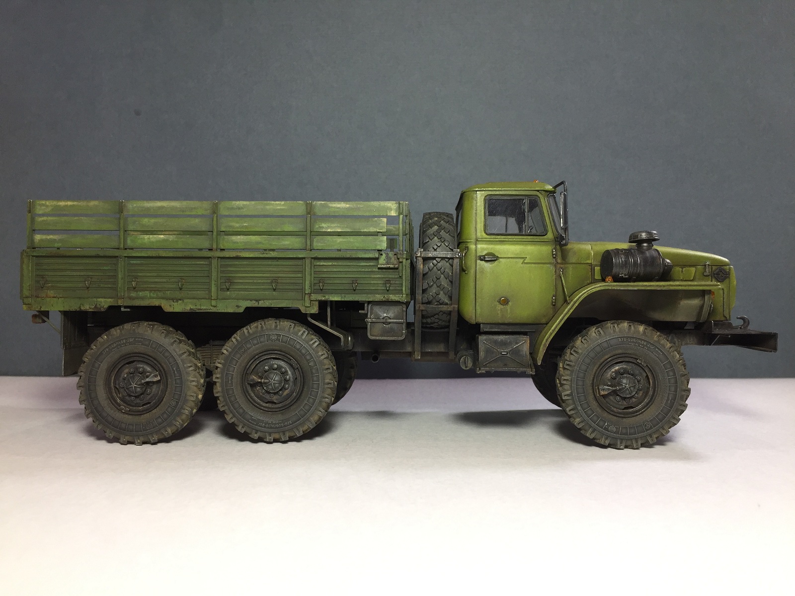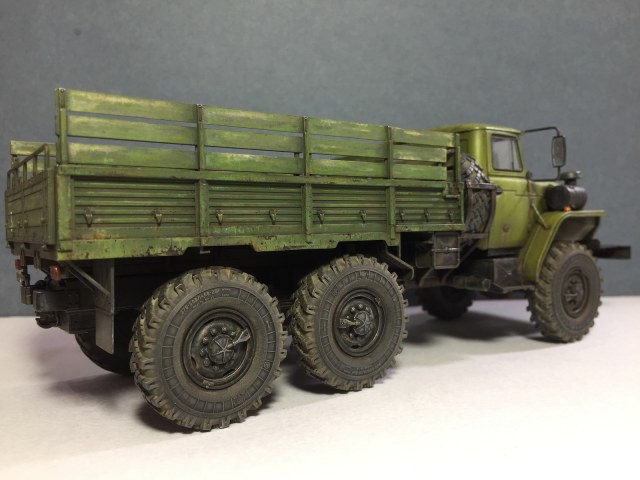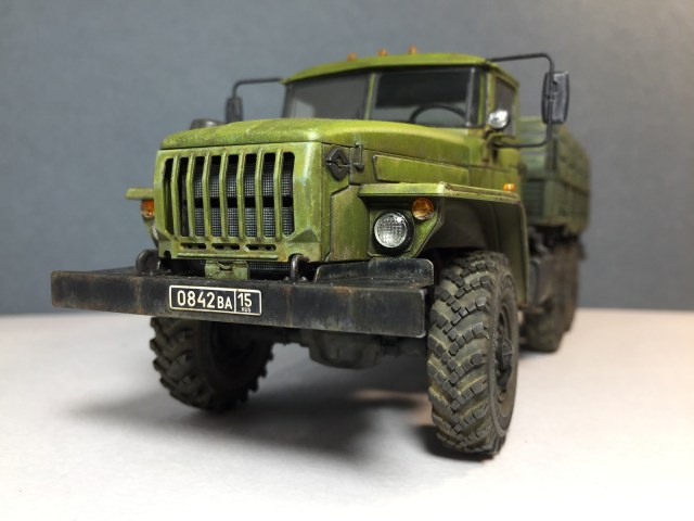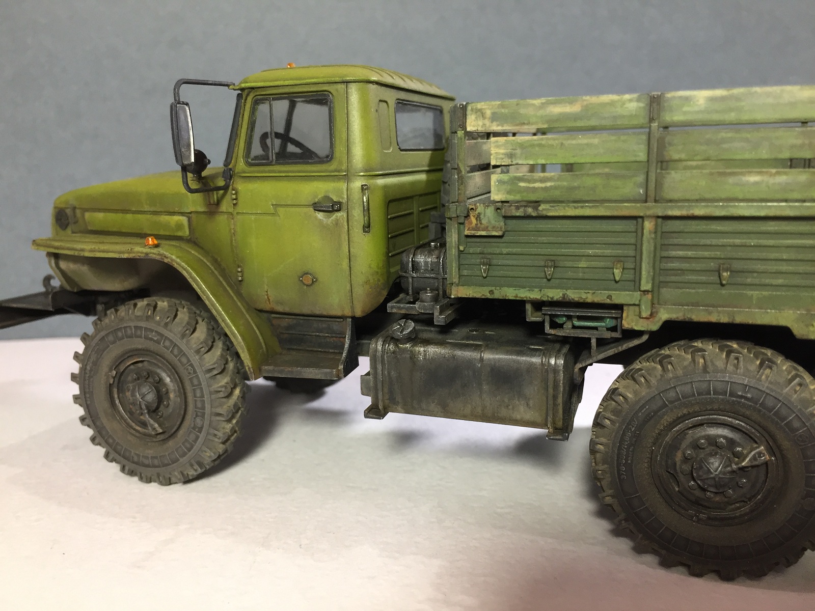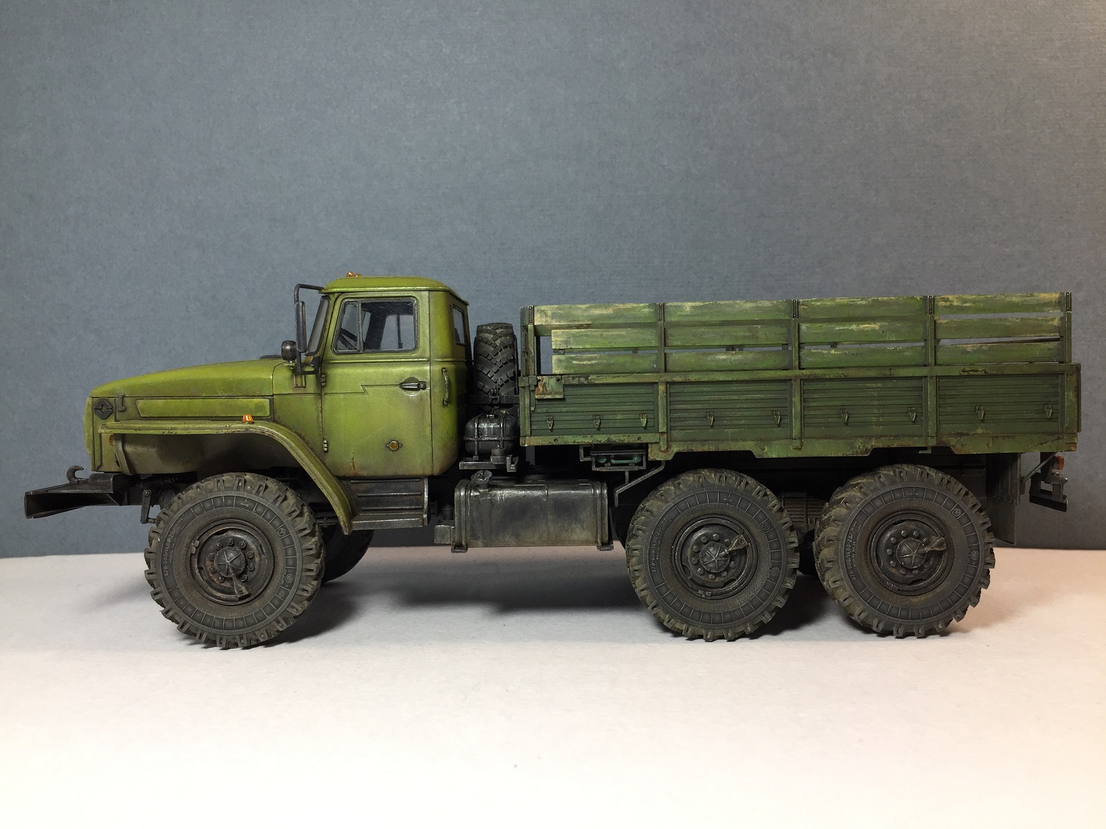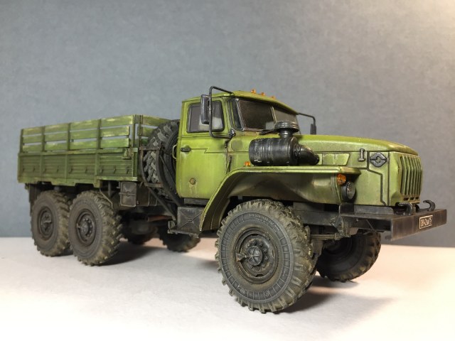 Доброго времени суток, коллеги-моделисты. Хочу представить вам модель<<Урал-4320>>.Модель из коробки, дополнения: смоляные колеса от <<Миниарм>>. Что касается сборки особых проблем не возникло.Была неприятность со стеклами, но произошла она из-за не аккуратности с моей стороны.После того, как были сняты маски, обнаружил, что в некоторых местах, произошло затекание краски.Пришлось отрывать крышу, вынимать лобовое стекло, чтобы удалить подтёки. Зачистил стёкла наждачкой 1200 с водой, затем покрыл их << Футурой>> ей убрал риски от наждачки. Вклеил и окрасил уплотнители по месту.