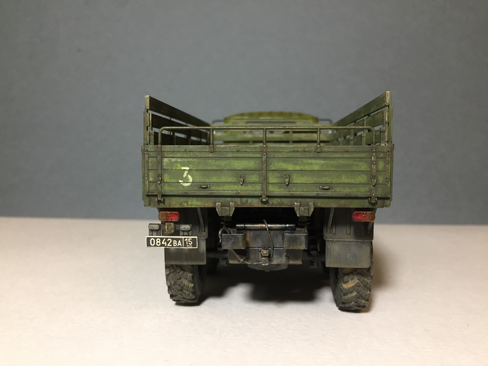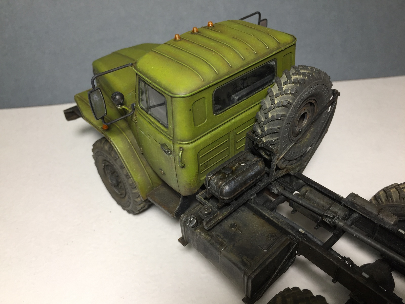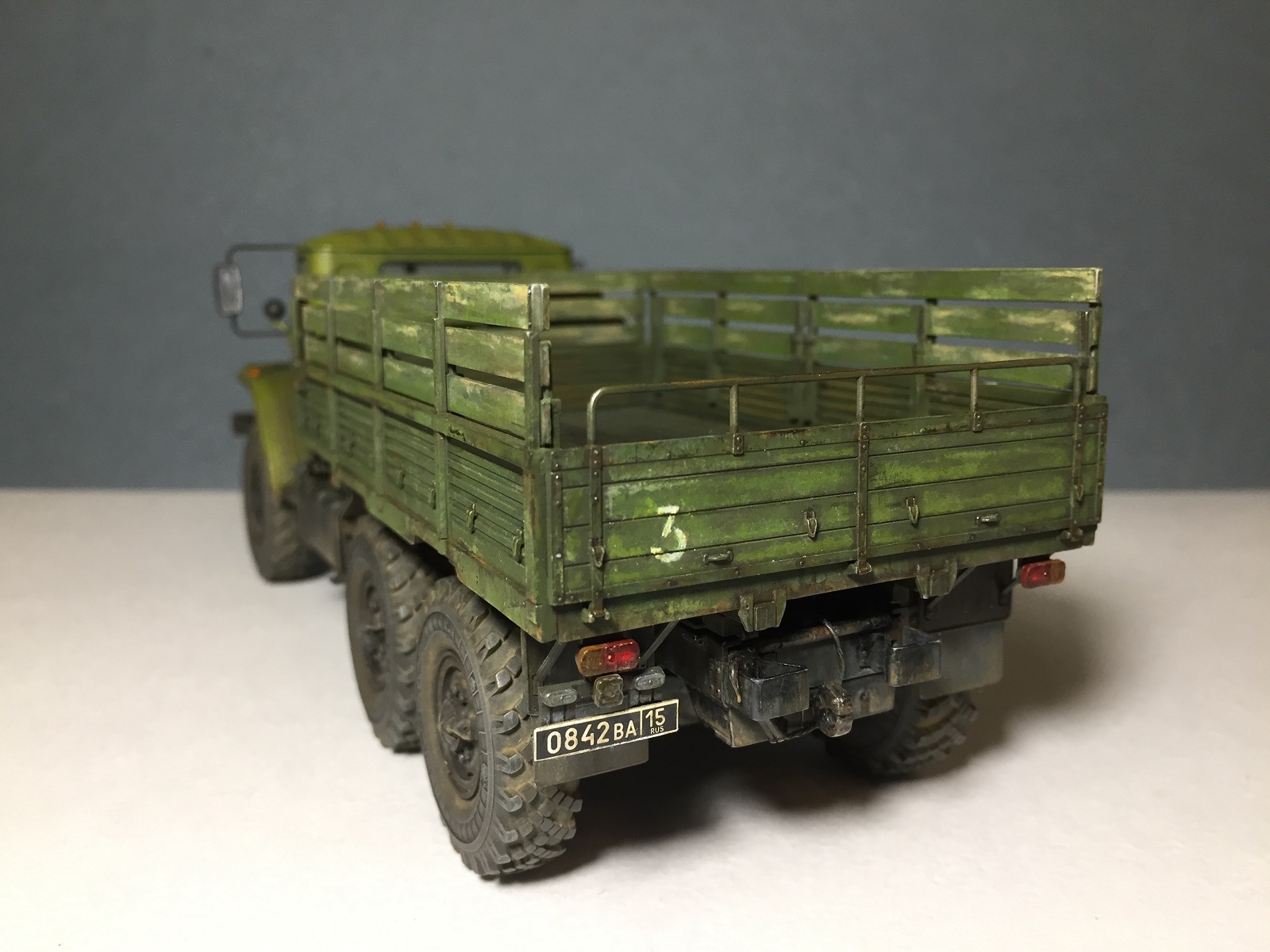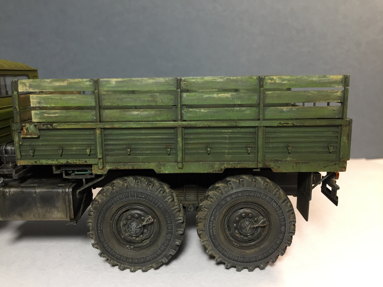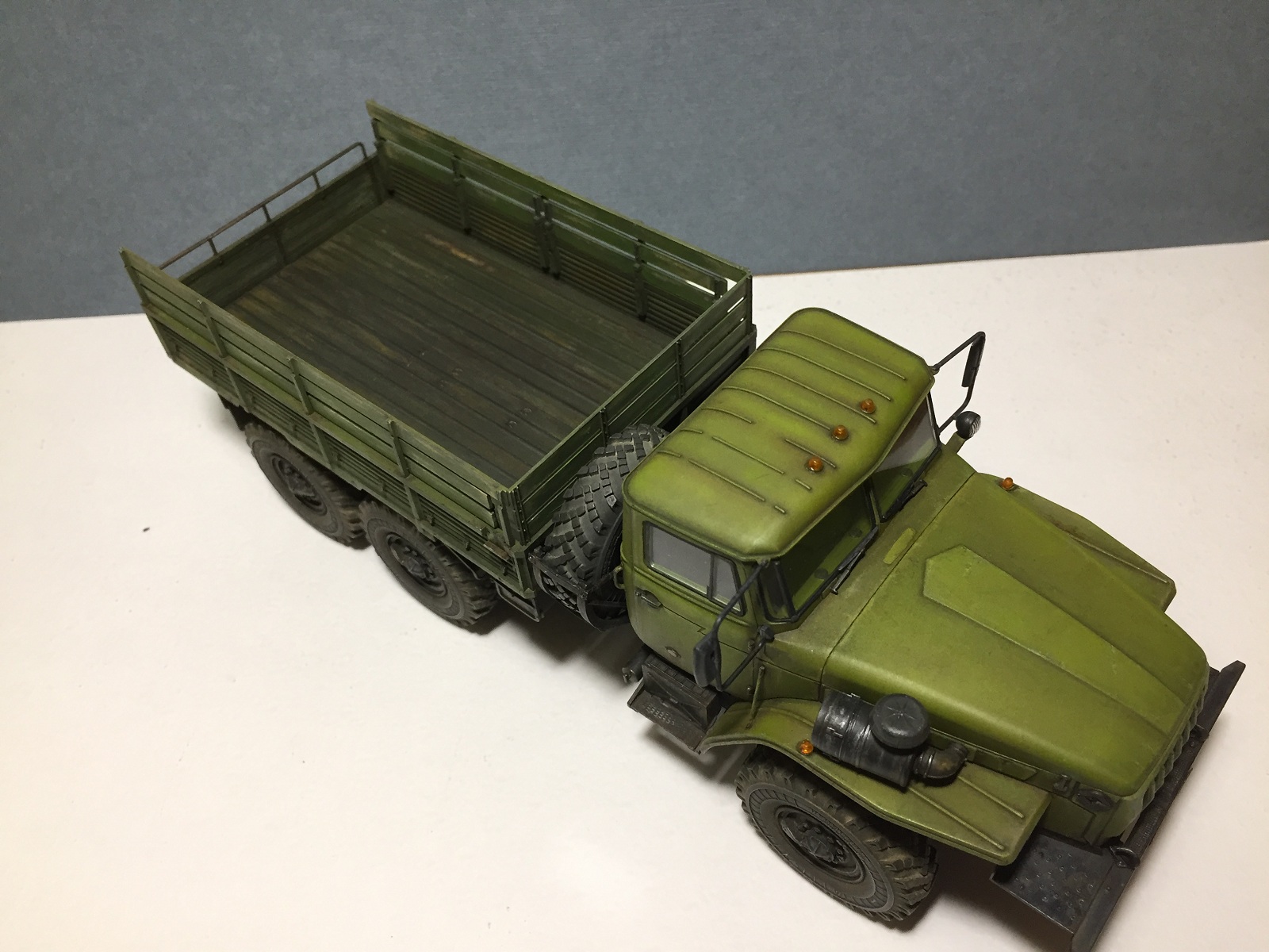 Доброго времени суток, коллеги-моделисты. Хочу представить вам модель<<Урал-4320>>.Модель из коробки, дополнения: смоляные колеса от <<Миниарм>>. Что касается сборки особых проблем не возникло.Была неприятность со стеклами, но произошла она из-за не аккуратности с моей стороны.После того, как были сняты маски, обнаружил, что в некоторых местах, произошло затекание краски.Пришлось отрывать крышу, вынимать лобовое стекло, чтобы удалить подтёки. Зачистил стёкла наждачкой 1200 с водой, затем покрыл их << Футурой>> ей убрал риски от наждачки. Вклеил и окрасил уплотнители по месту.