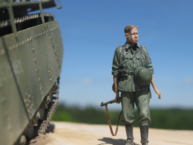 Танк таким новеньким и должен быть? Такое впечатление, что он туда даже не своим ходом доехал, а перенесся из боксов своей части. И немецкая форма разве не должна быть серее? Я имею ввиду что серого в ней не должно быть чуток больше чем зеленого? У офицера шарфик а-ля "Апокалипсис сегодня". Никогда на фото таких не видел, если честно.