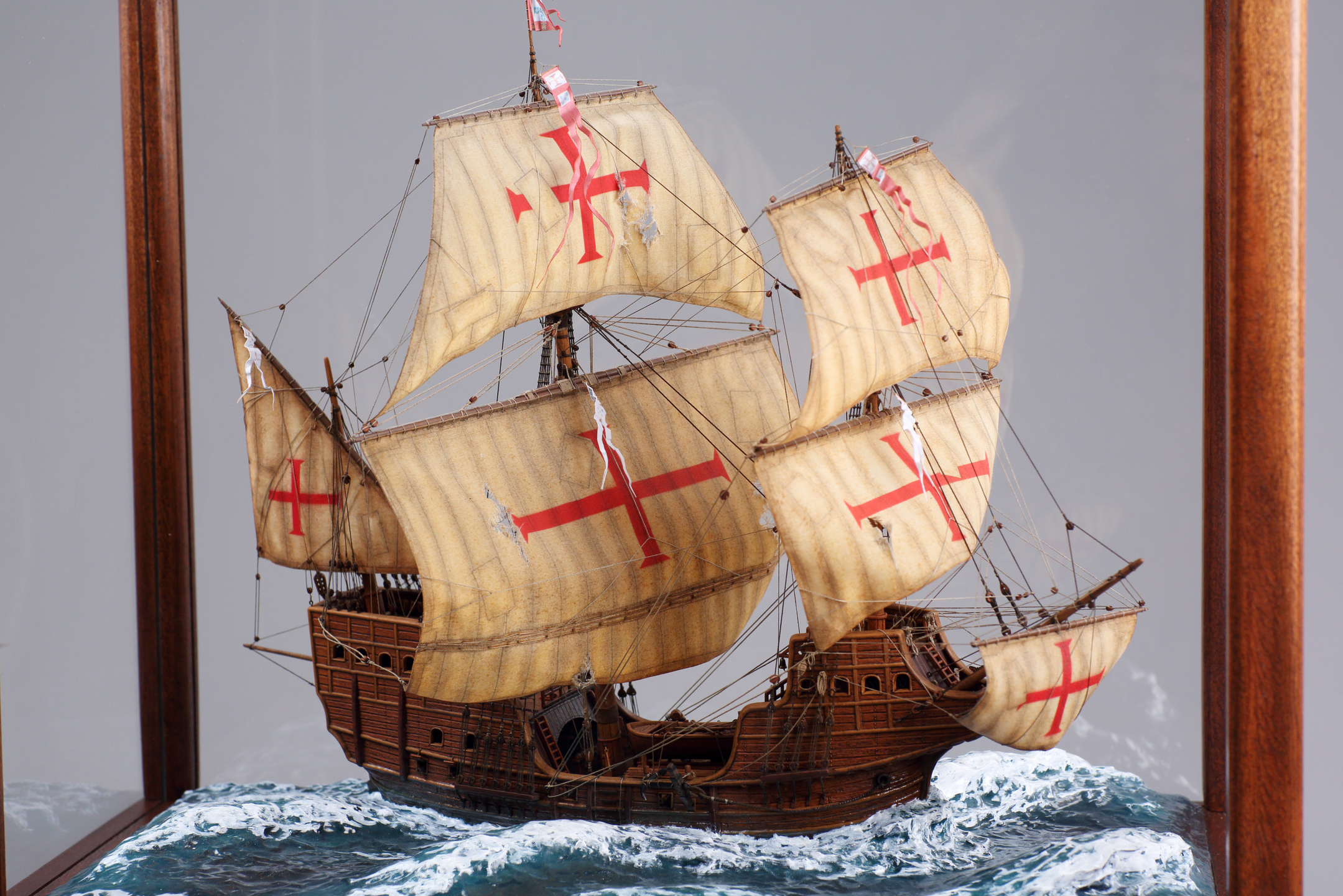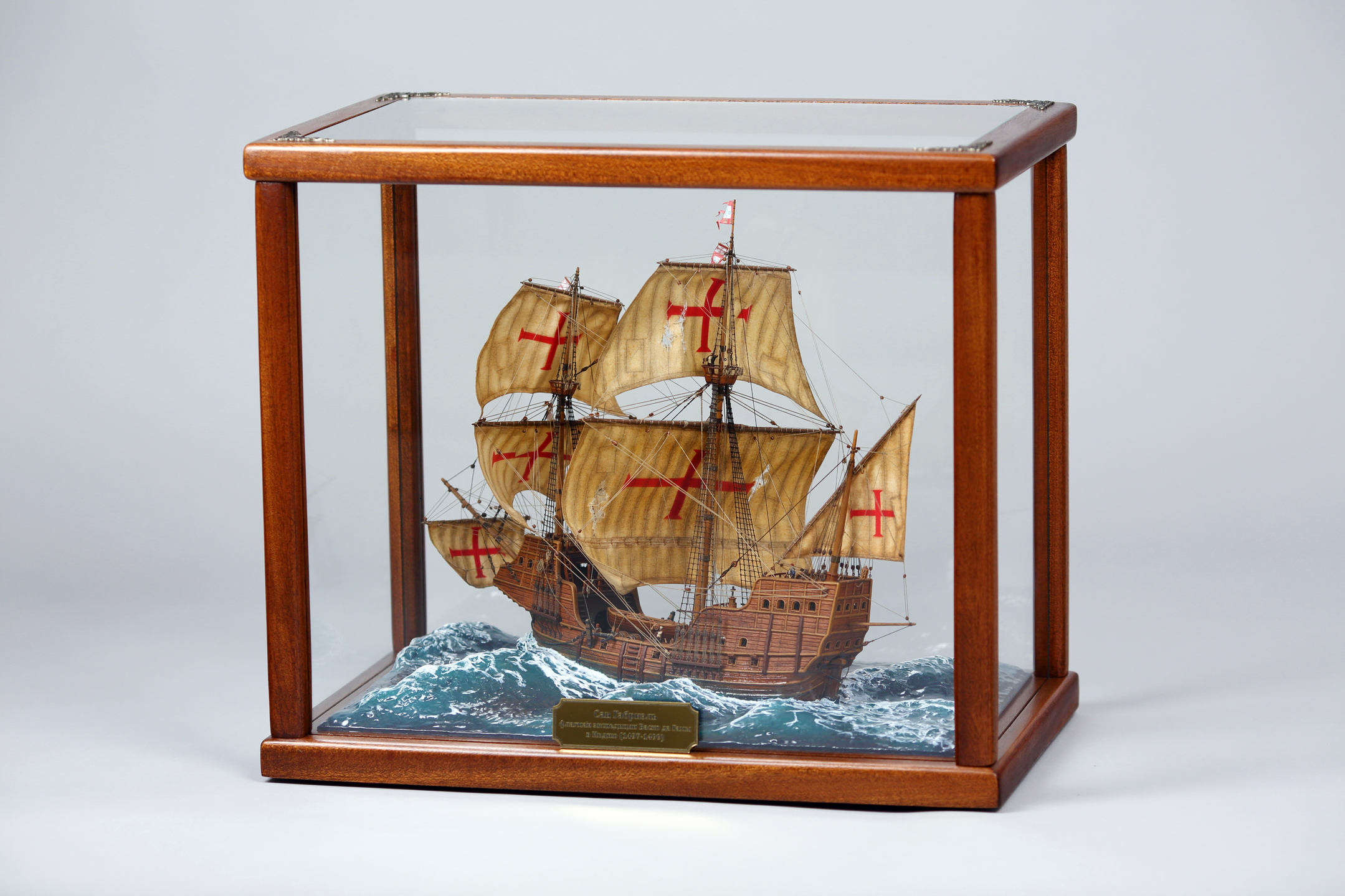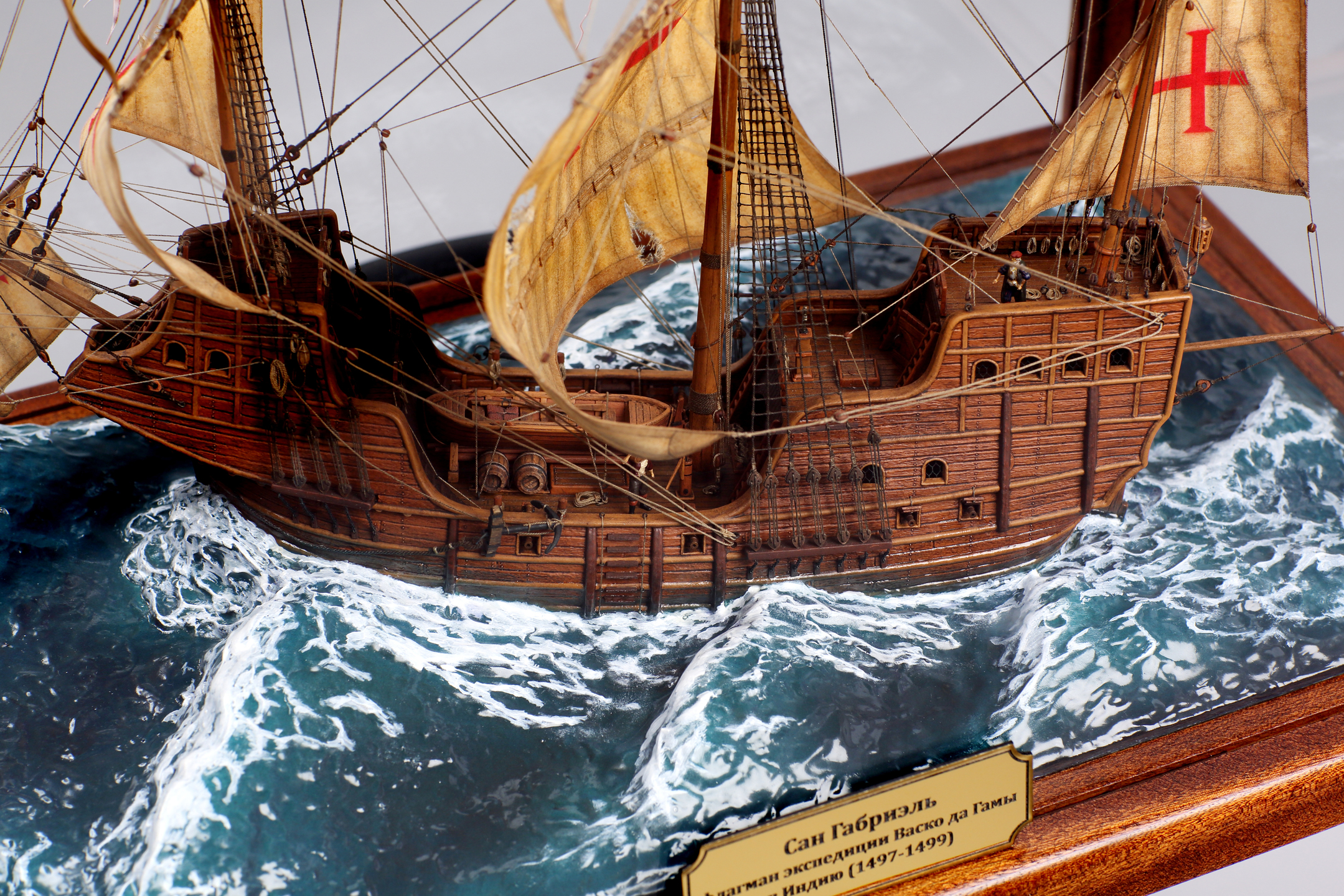 Сан Габриэль - флагман экспедиции Васко да Гамы в Индию (1497-1499гг). Модель выполнена из старого пластика ЗВЕЗДЫ, который в свою очередь одолжил формовки у Rewell. От набора остался только остов, 70% модели - сплошные переделки. Из основных дополнений можно отметить следующие: более подробная детализация корпуса, дополнительные элементы корабельного оснащения, улучшенная лодка, помпы, якоря, орудия, рында, паруса, достаточно подробно показан такелаж с блоками, флаги и вымпелы. Сделана имитация моря акриловым гелем и последующей покраской. Фигурки моряков выполнены с использованием 3D печати. Весь покрас модели выполнялся акриловыми красками на глаз. Витрина имеет размеры: 440х260х380.