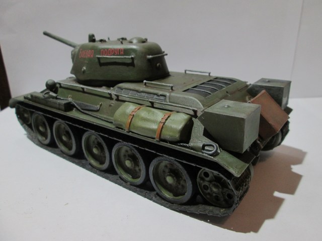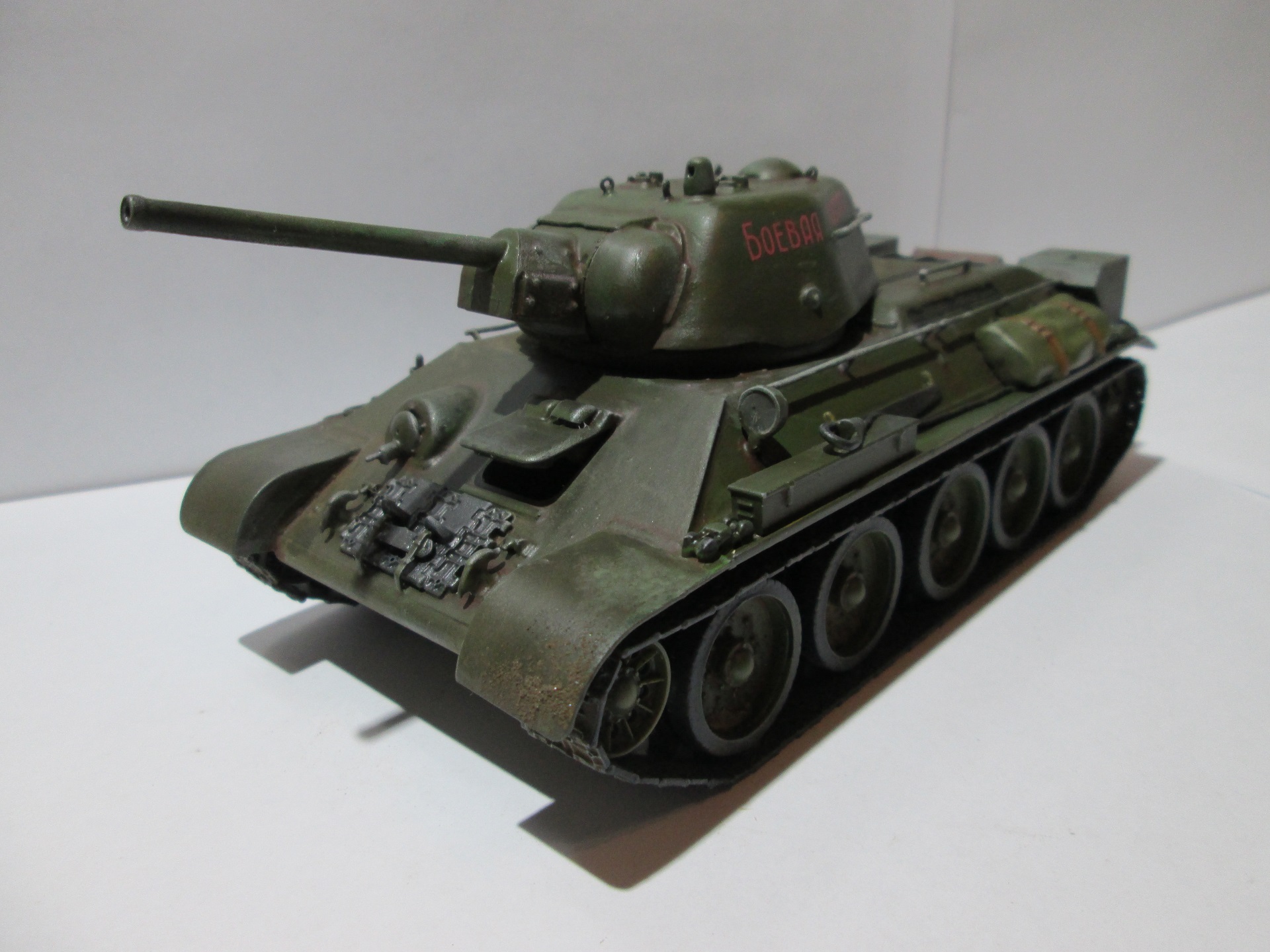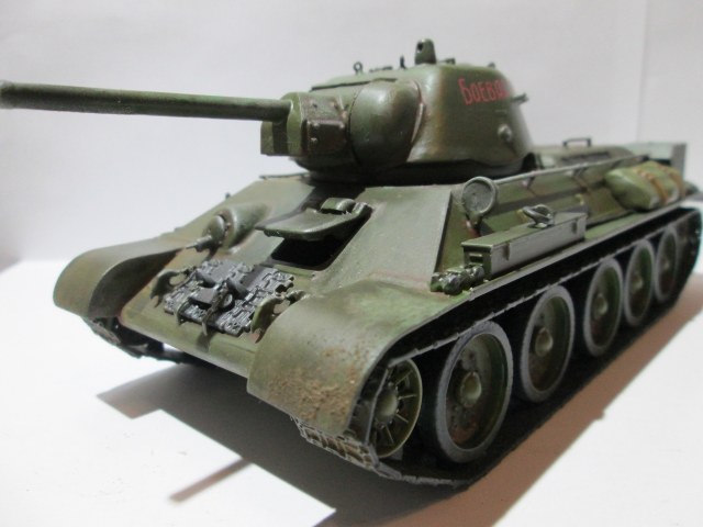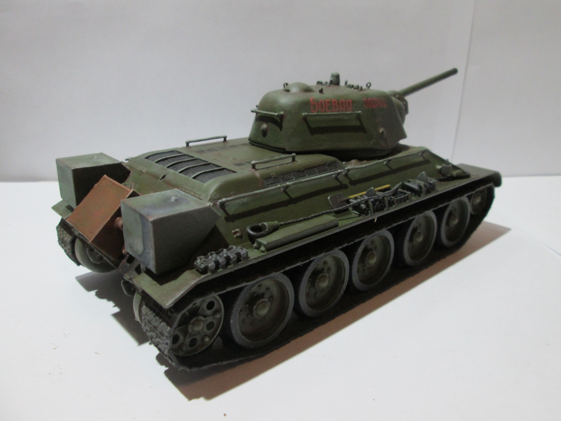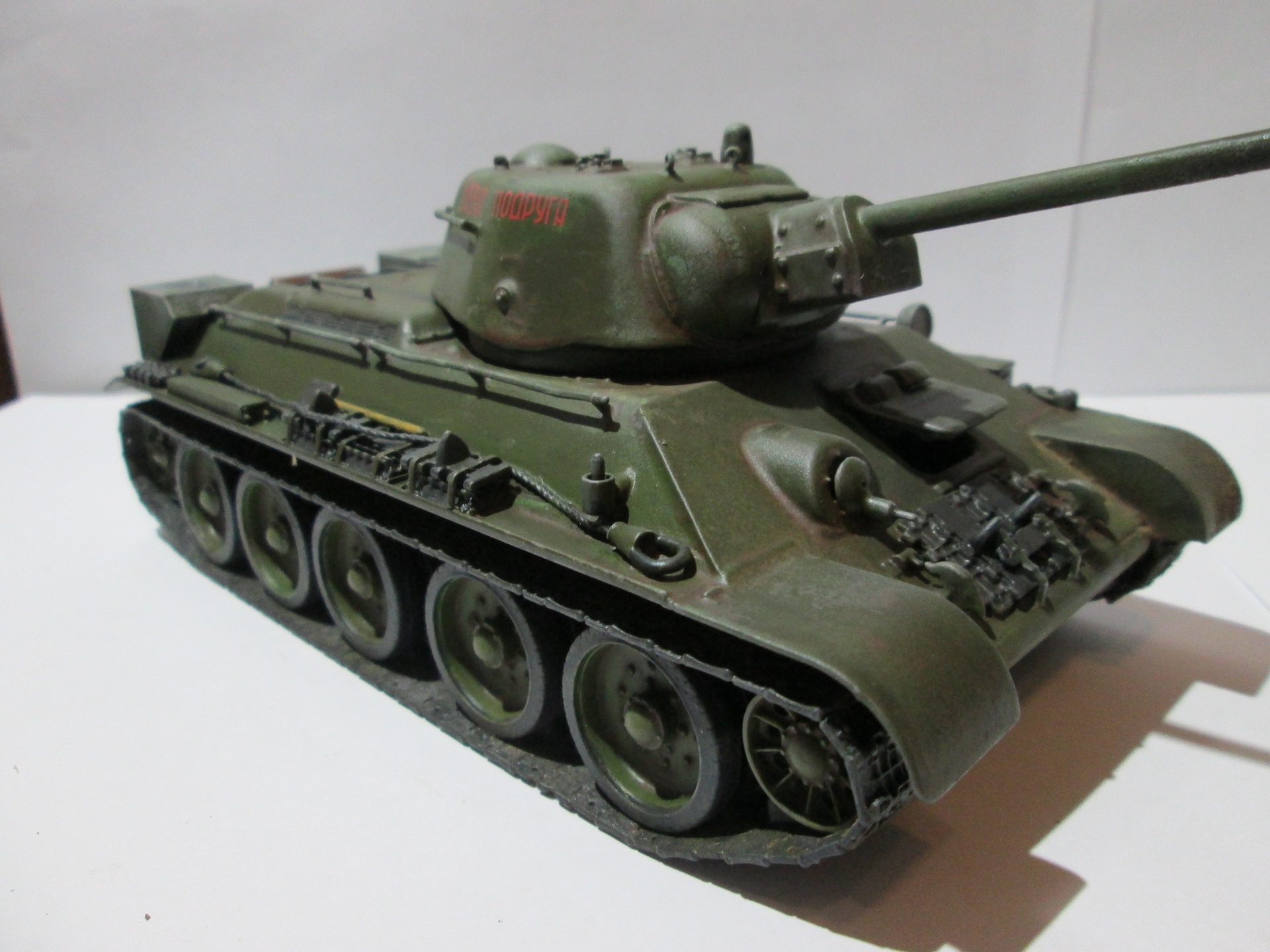Приветствую вас,моделисты.Хочу вам представить свою первую модель танка Т-34/76,которая после затянувшейся покраски и неправильного применения фильтра и пигментов,оказалась второй доделанной.Собирал из коробки,добавил траки на лобовую бронеплиту.Красил кистями художественным акрилом "Аква-колор" цвет -хаки,фильтр и пигменты- ZIP,масло -"Невская палитра" с разбавителем KAV.К историческому прототипу,предложенному "Звездой" не привязывал,наклеил декали от зимнего камуфляжа.