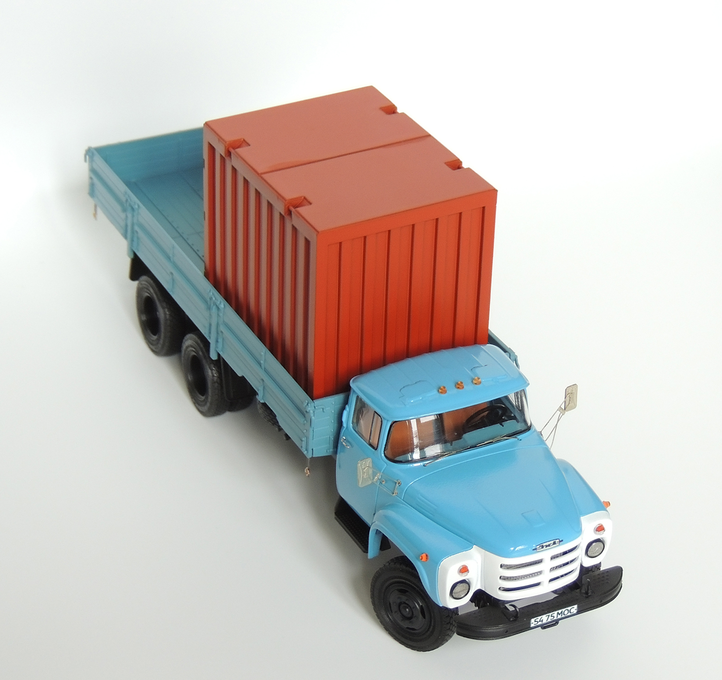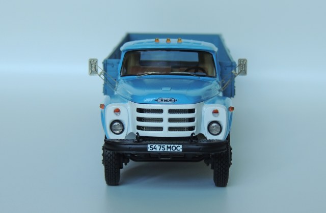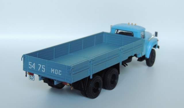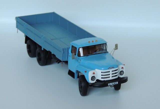 Кит AVD, доработки и исправления: сделал вырез по правому борту под запасное колеса, соответственно перенёс крепление запаски на раме и сдвинул ресивер. Сделал кронштейны с отражателями на боковинах кузова. В кабине правильная торпедо с приборкой 133-го, обивка потолка и задней стенки бежевого цвета. В фарах фототравлёная подложка, а сверху стёклышко Ornst. Задние фонари фп-130 от 3А. Травлёные ранние зеркала, передний поворотный мост и резина И-Н142Б "шашка", хотел поставить "волну", но не хватило 4 покрышек в запасе. Присвоил московские номера, нанёс дублёр на корму. Шильдик на капоте.
