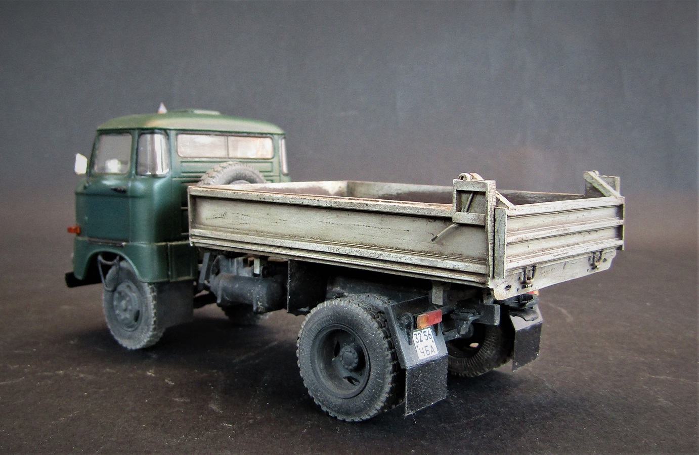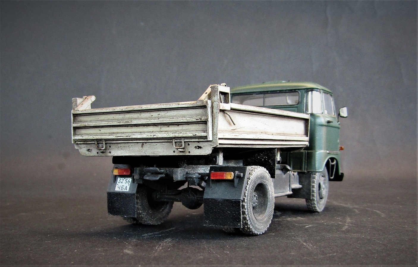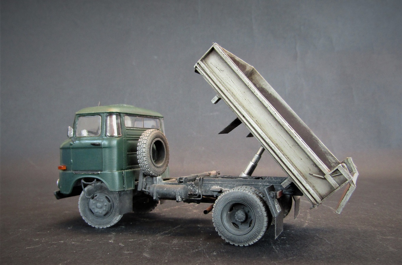 Конверсия из бортового в самосвал, кузов самодельный. Масштаб 1/43. Производитель IXO models .Красил красками от Tamiya, акрил, эмаль, расшивка маслом пыль пигменты грязь художественная постель, сколы сделал при помощью лака для волос.