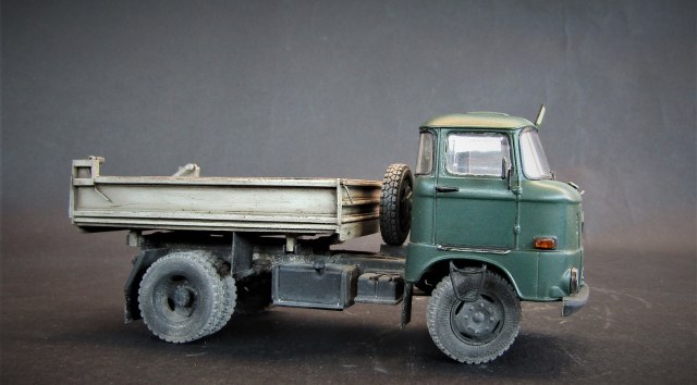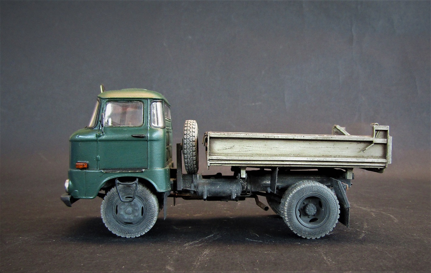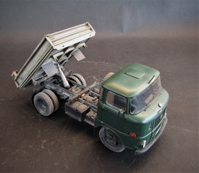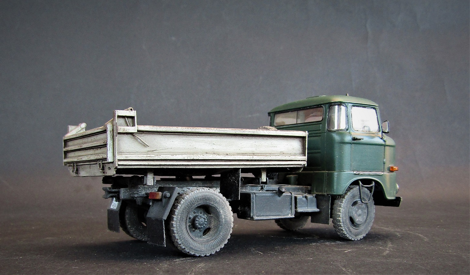 Конверсия из бортового в самосвал, кузов самодельный. Масштаб 1/43. Производитель IXO models .Красил красками от Tamiya, акрил, эмаль, расшивка маслом пыль пигменты грязь художественная постель, сколы сделал при помощью лака для волос.