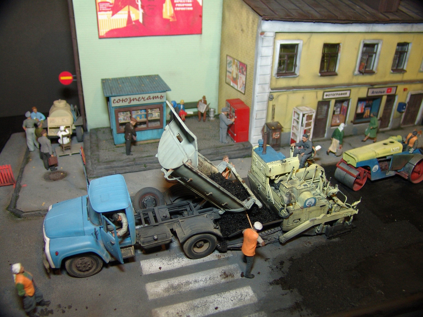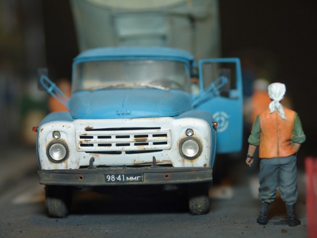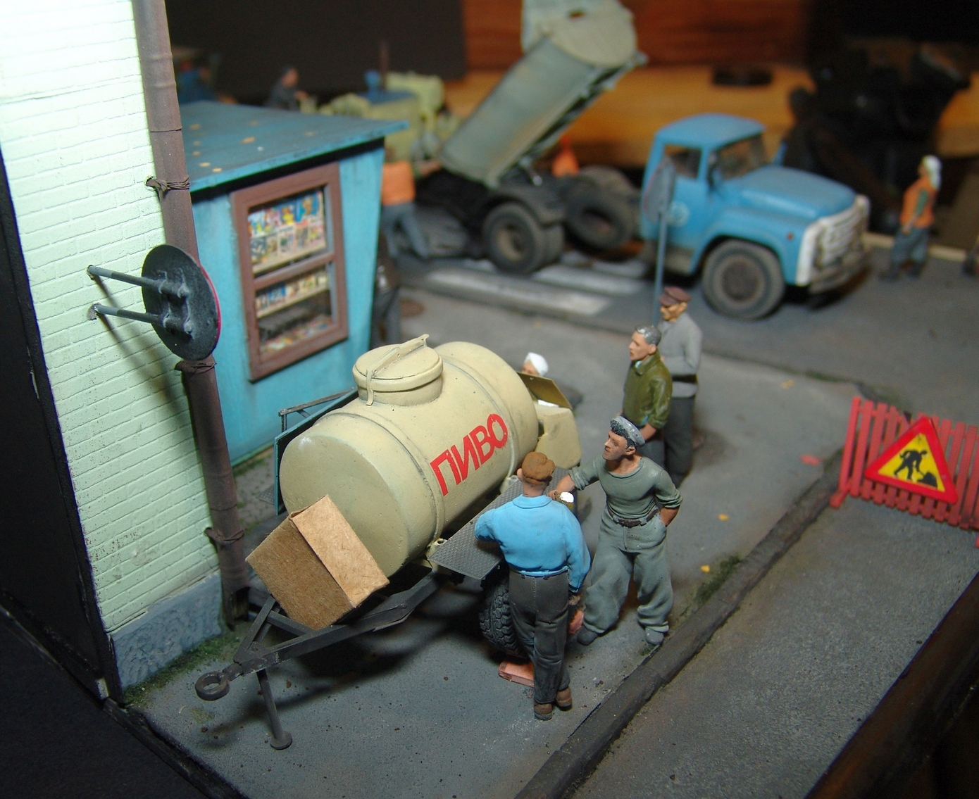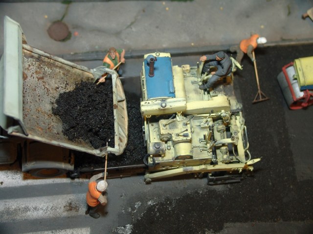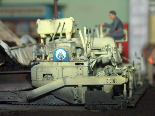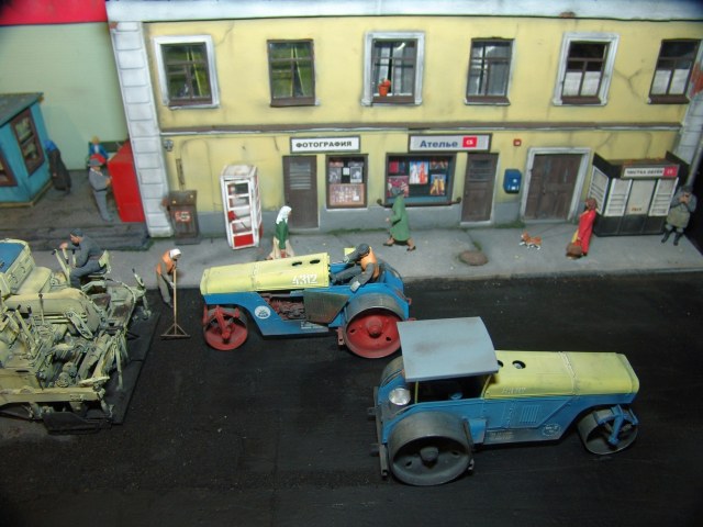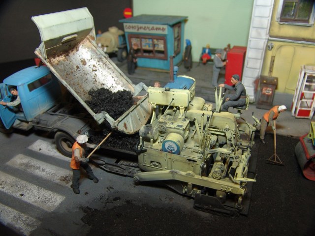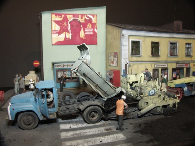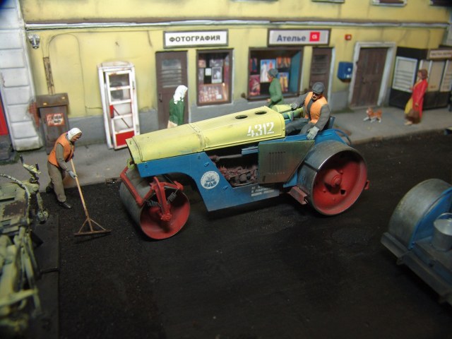 Вся диорама и часть техники самодельная, катки от ребят от Red Irons, бочка с пивом от Кастомфактори и другая мелочевка от различных модельных фирм. Техника покрашена по цвету и с эмблемами московской строительной организации МСМ-7 Главмосинжстроя, которая и занималась прокладкой новых дорог в городе.