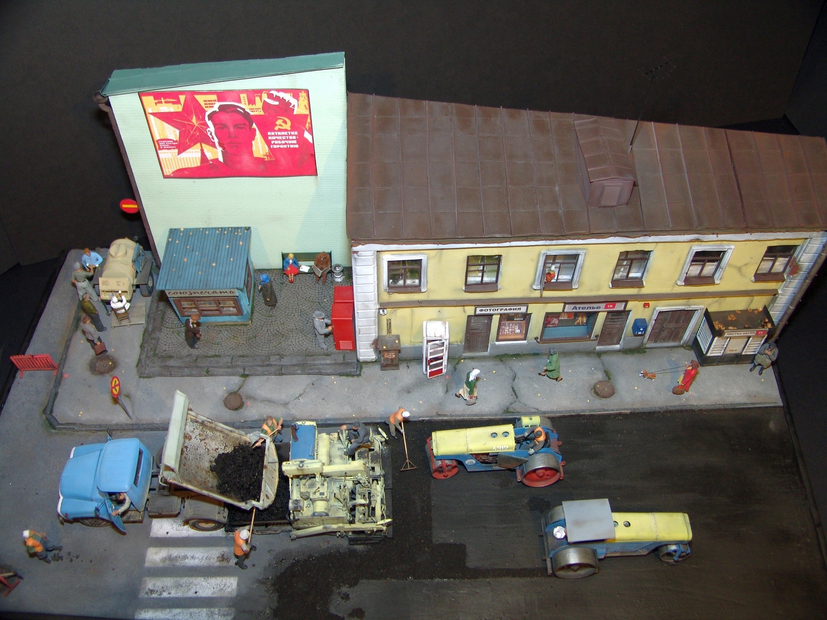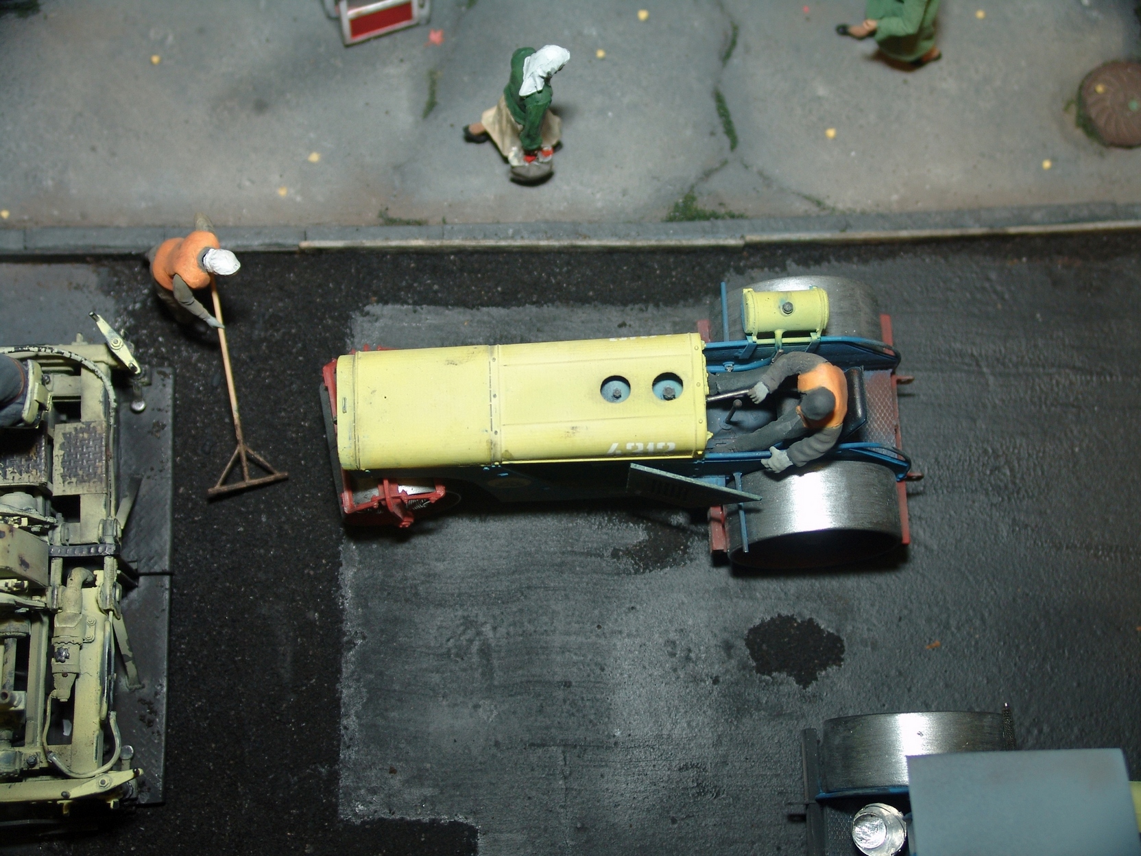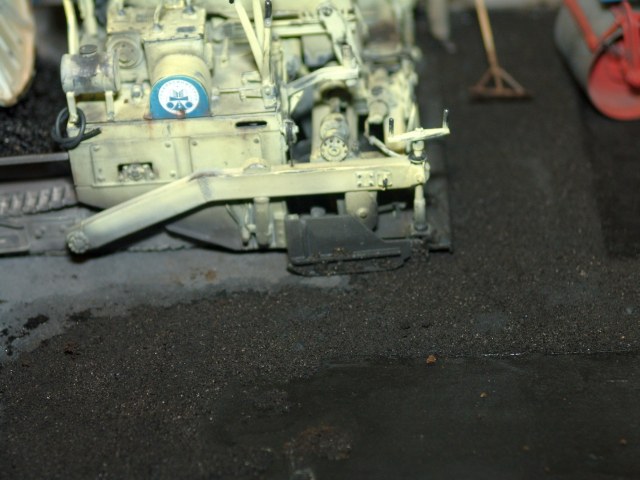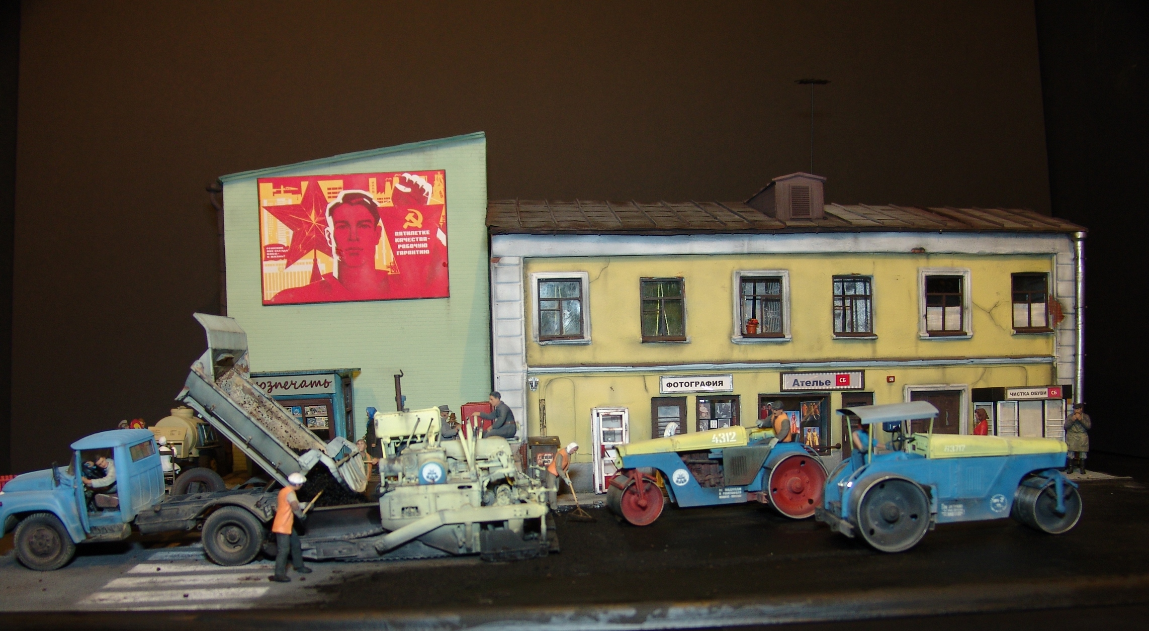 Вся диорама и часть техники самодельная, катки от ребят от Red Irons, бочка с пивом от Кастомфактори и другая мелочевка от различных модельных фирм. Техника покрашена по цвету и с эмблемами московской строительной организации МСМ-7 Главмосинжстроя, которая и занималась прокладкой новых дорог в городе.